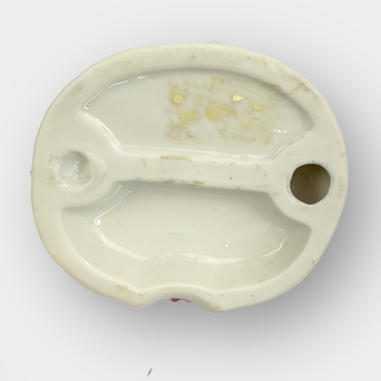 Vintage blue and white porcelain figurine of a boy carrying two fruit baskets with gold trim accents. The piece stands approximately 8" tall, finely detailed with hand-painted design. No chips or cracks are present as photographed