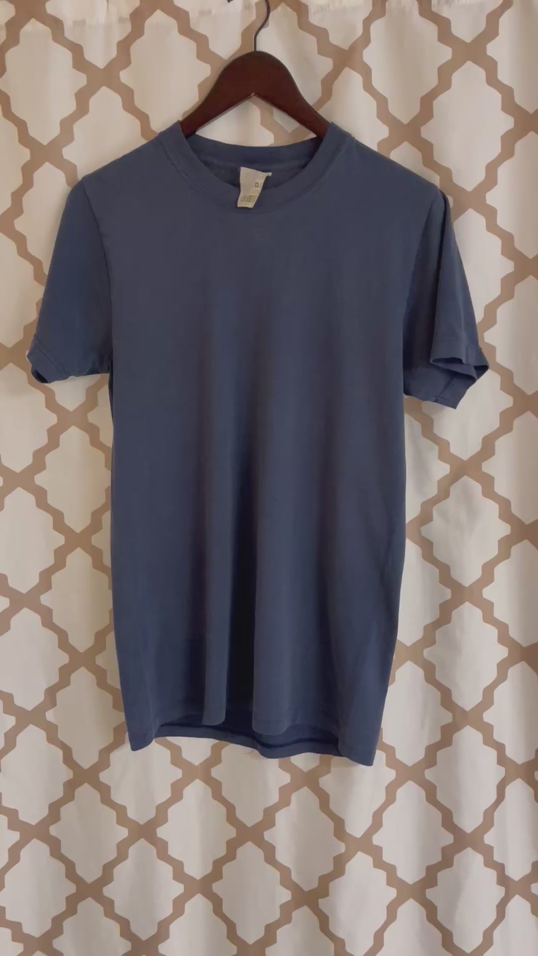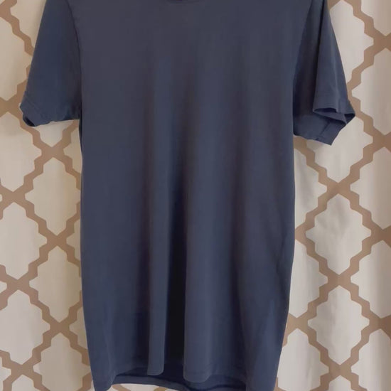Short sleeve t-shirt with a classic crew neckline and simple, no-logo front. Soft and lightweight, with double-stitched hems, no pockets and a comfortable fit. Tag is partially faded but the shirt retains its shape and colour well