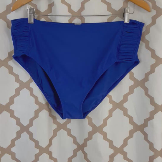 Bright royal blue bikini bottoms with flattering ruching at each hip and a smooth front and back for a comfortable fit. No major signs of wear and elastic has good stretch