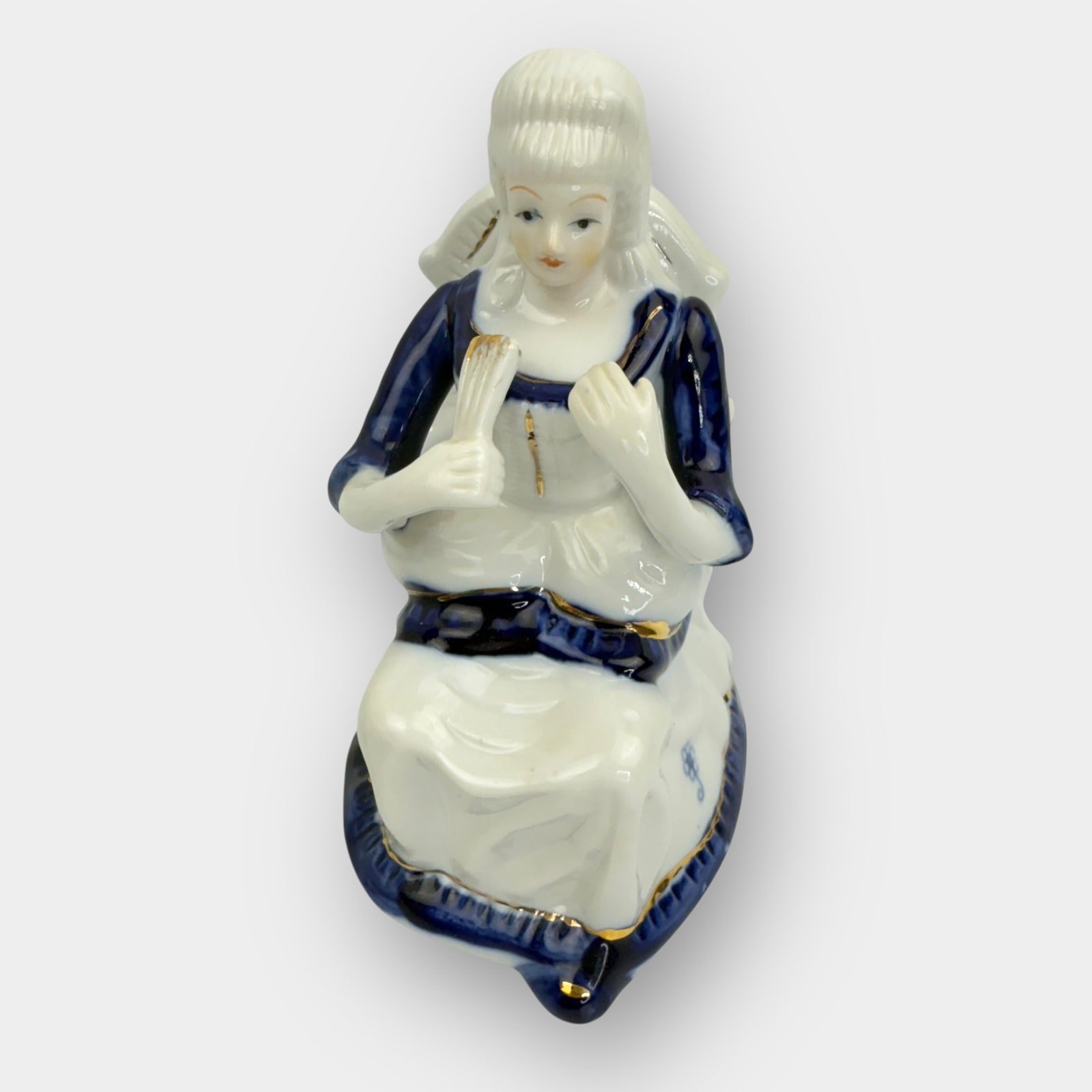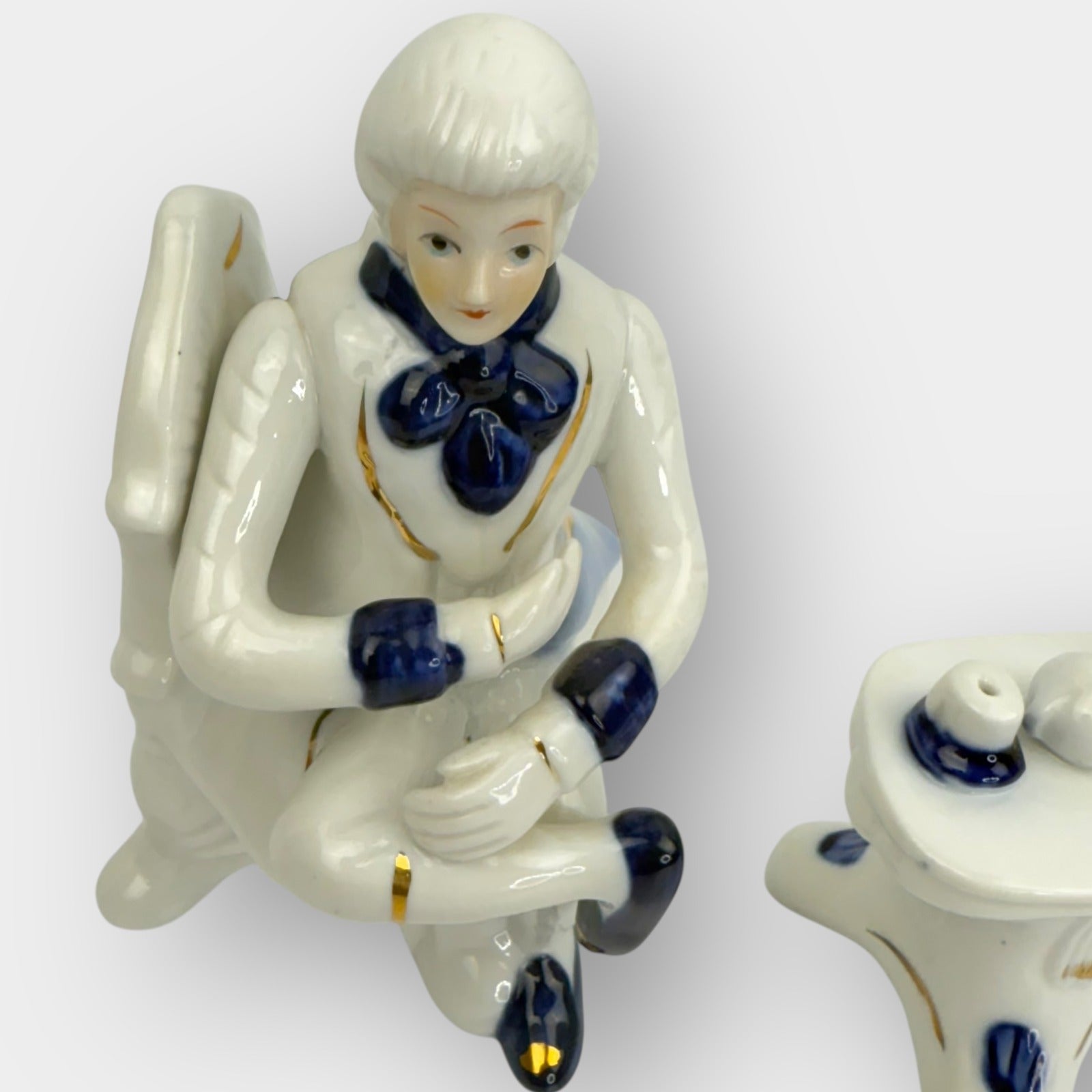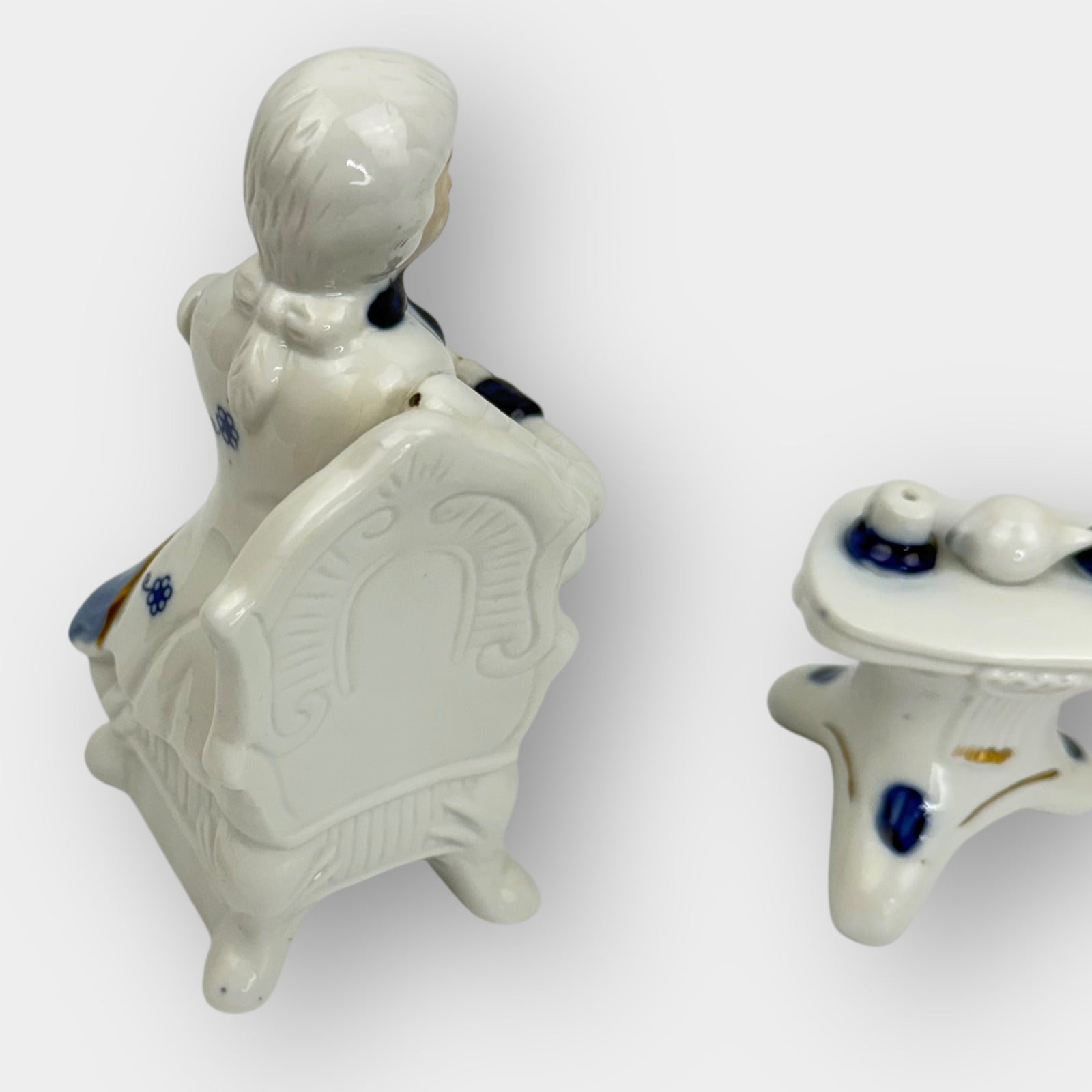 Vintage porcelain figurine set featuring a seated man about 6 inches tall, a seated woman about 5.5 inches tall, and a matching side table with tea set, all hand-painted in cobalt blue and white with gold trim. Nicely detailed with no chips or cracks