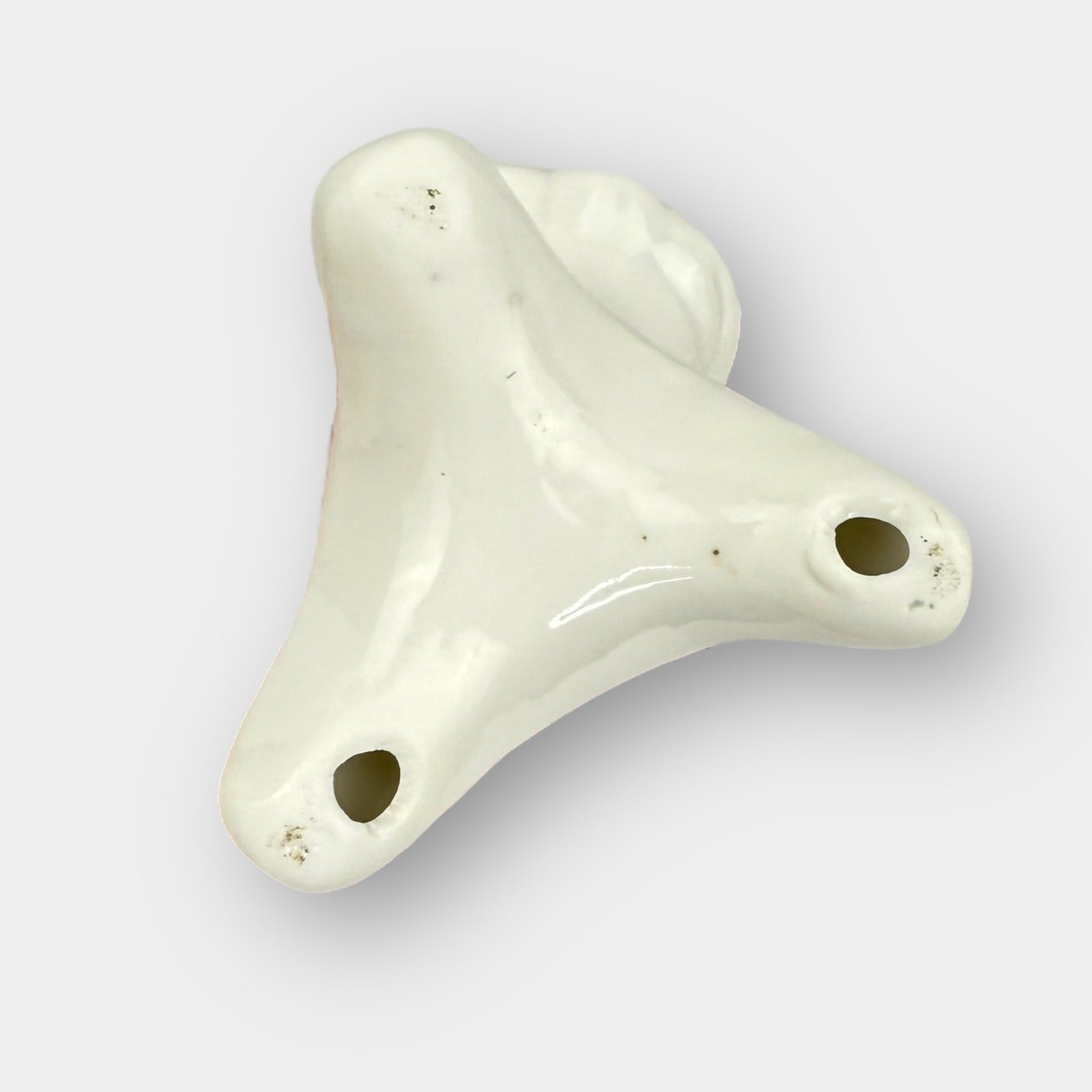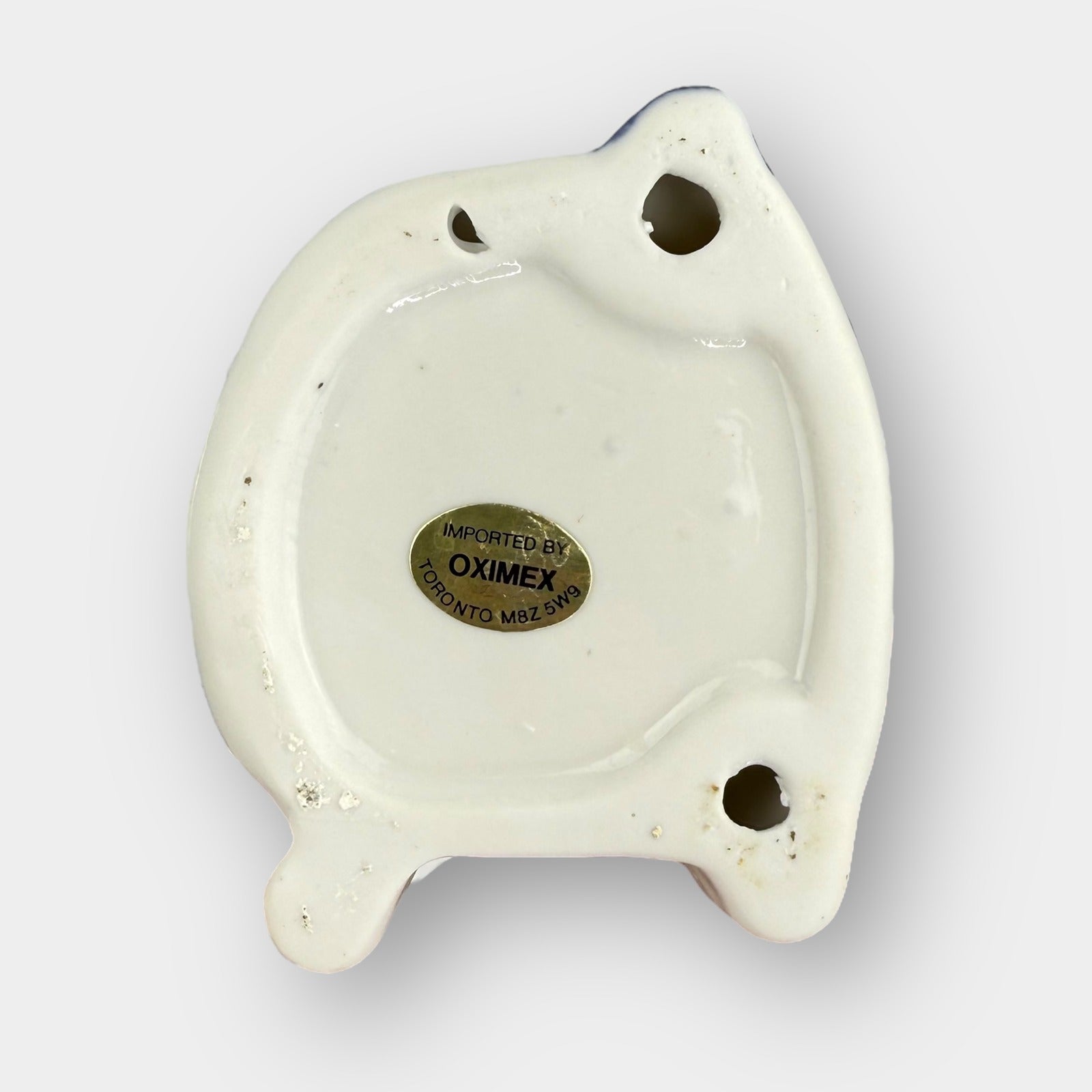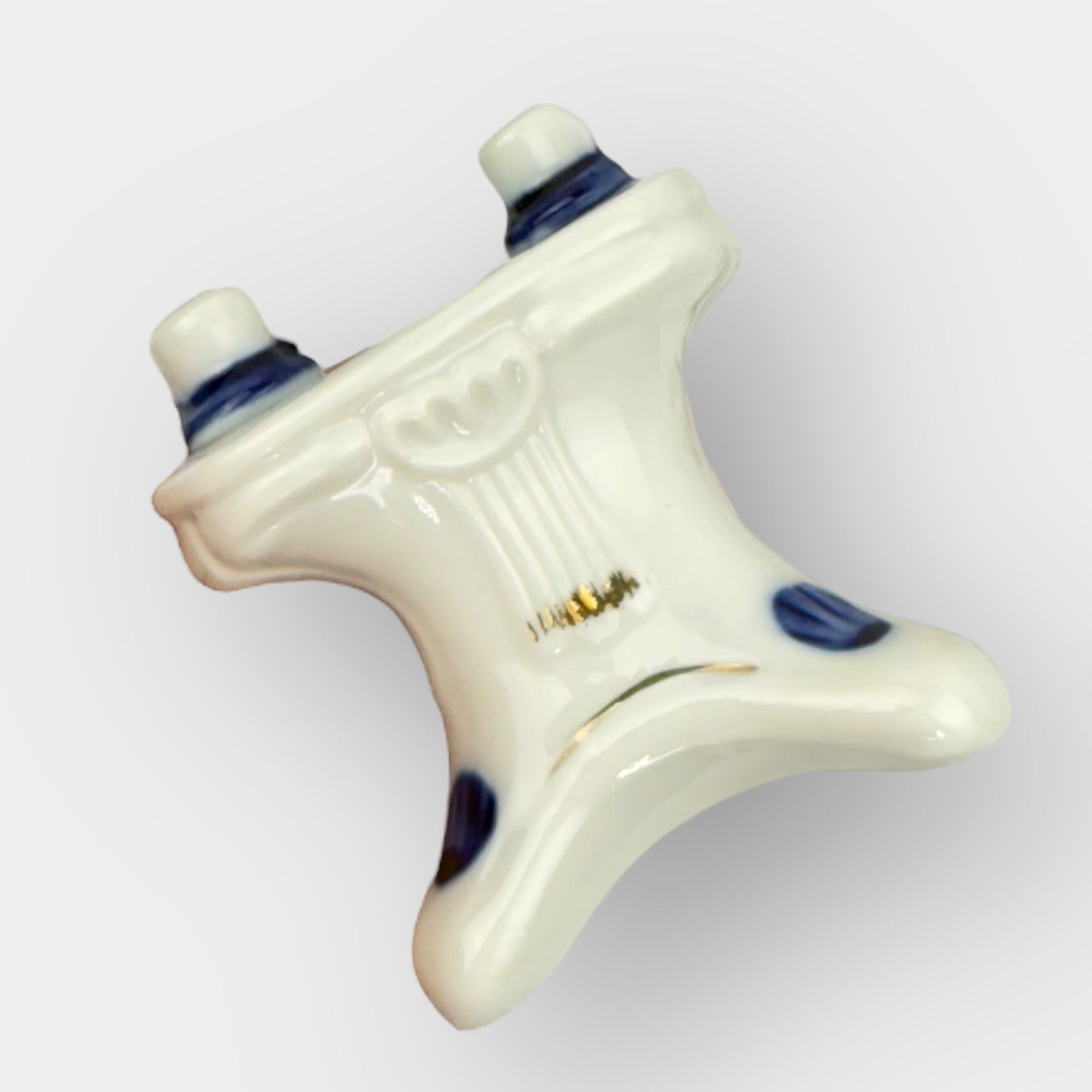 Vintage porcelain figurine set featuring a seated man about 6 inches tall, a seated woman about 5.5 inches tall, and a matching side table with tea set, all hand-painted in cobalt blue and white with gold trim. Nicely detailed with no chips or cracks