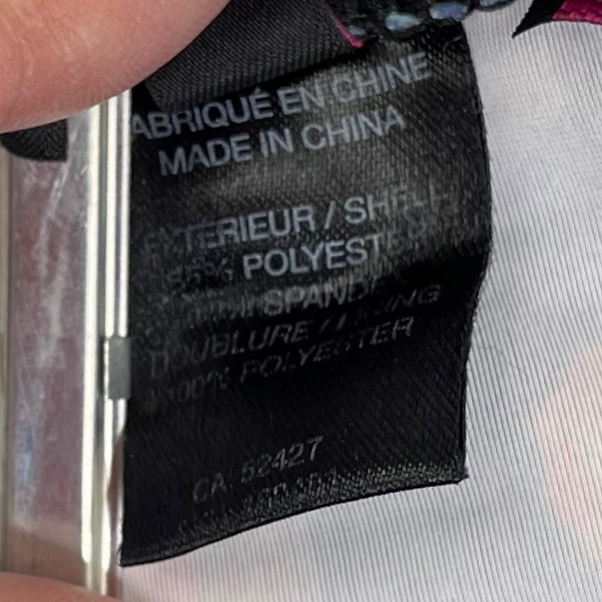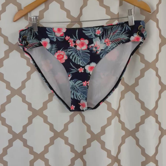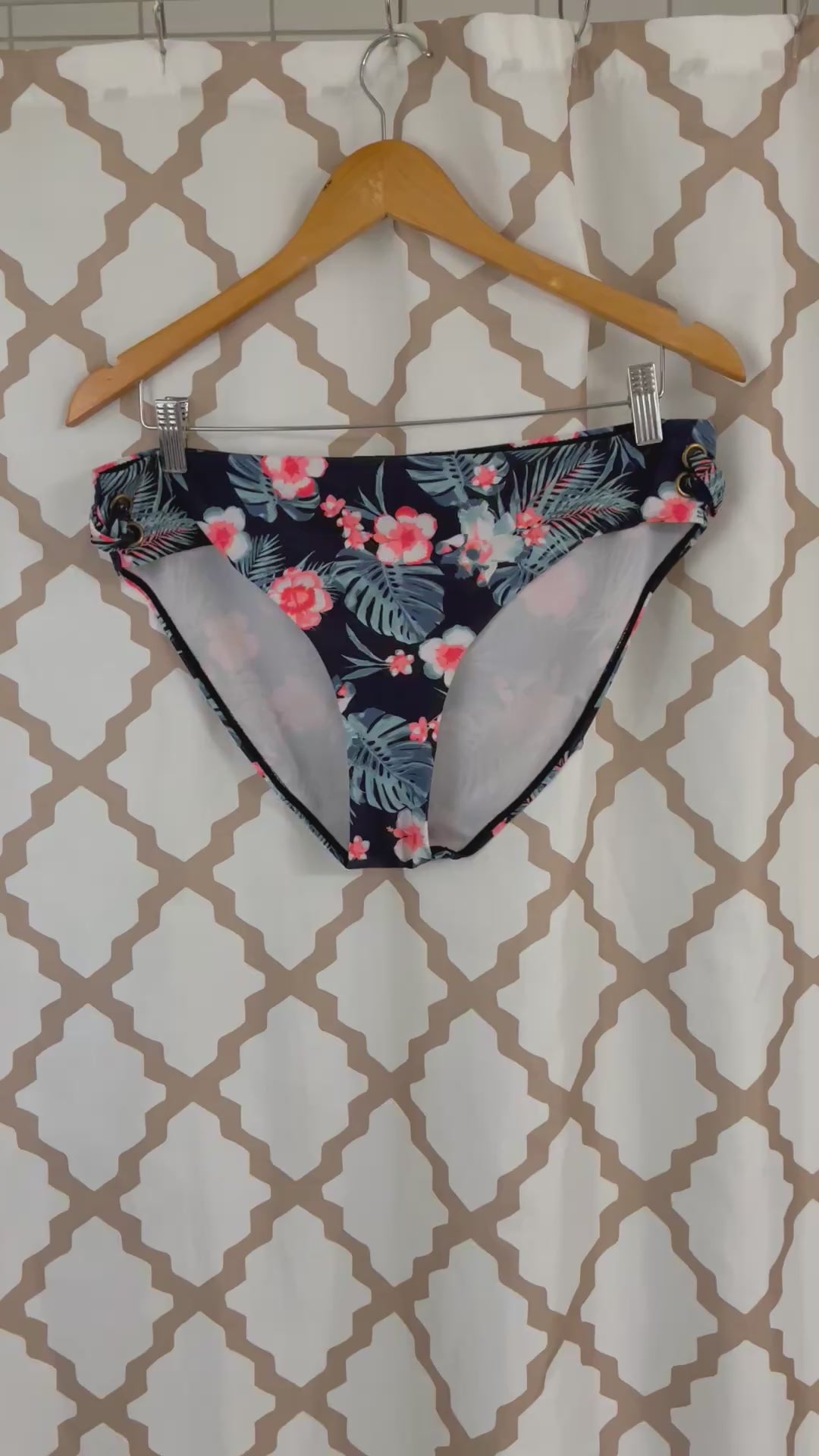 These black swim bottoms feature a colourful tropical floral print with side ring details. A stretchy pull-on style provides comfort and a secure fit