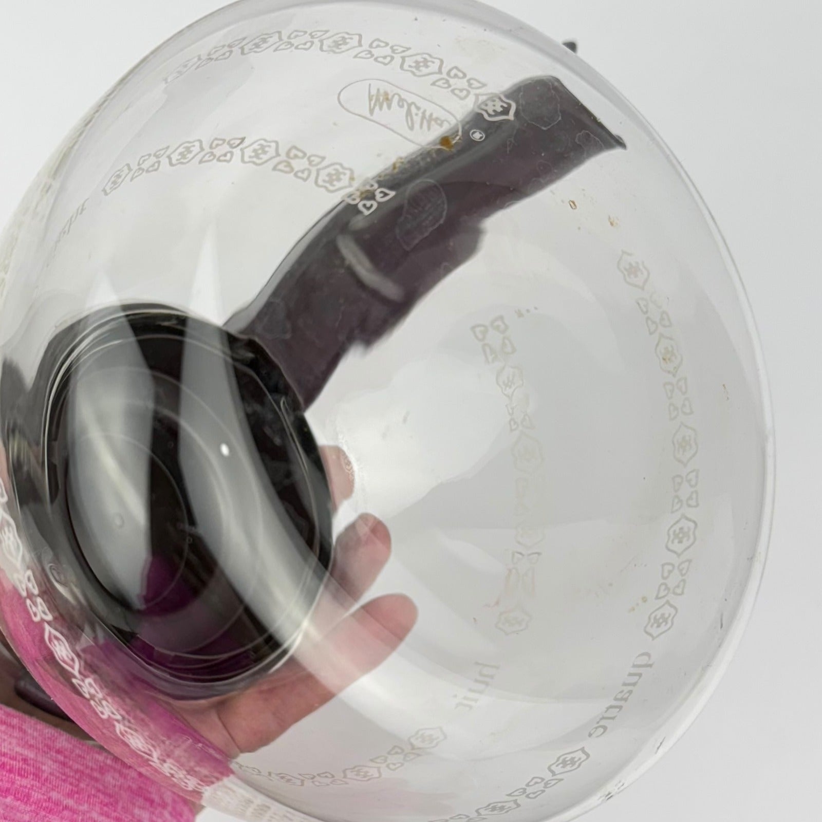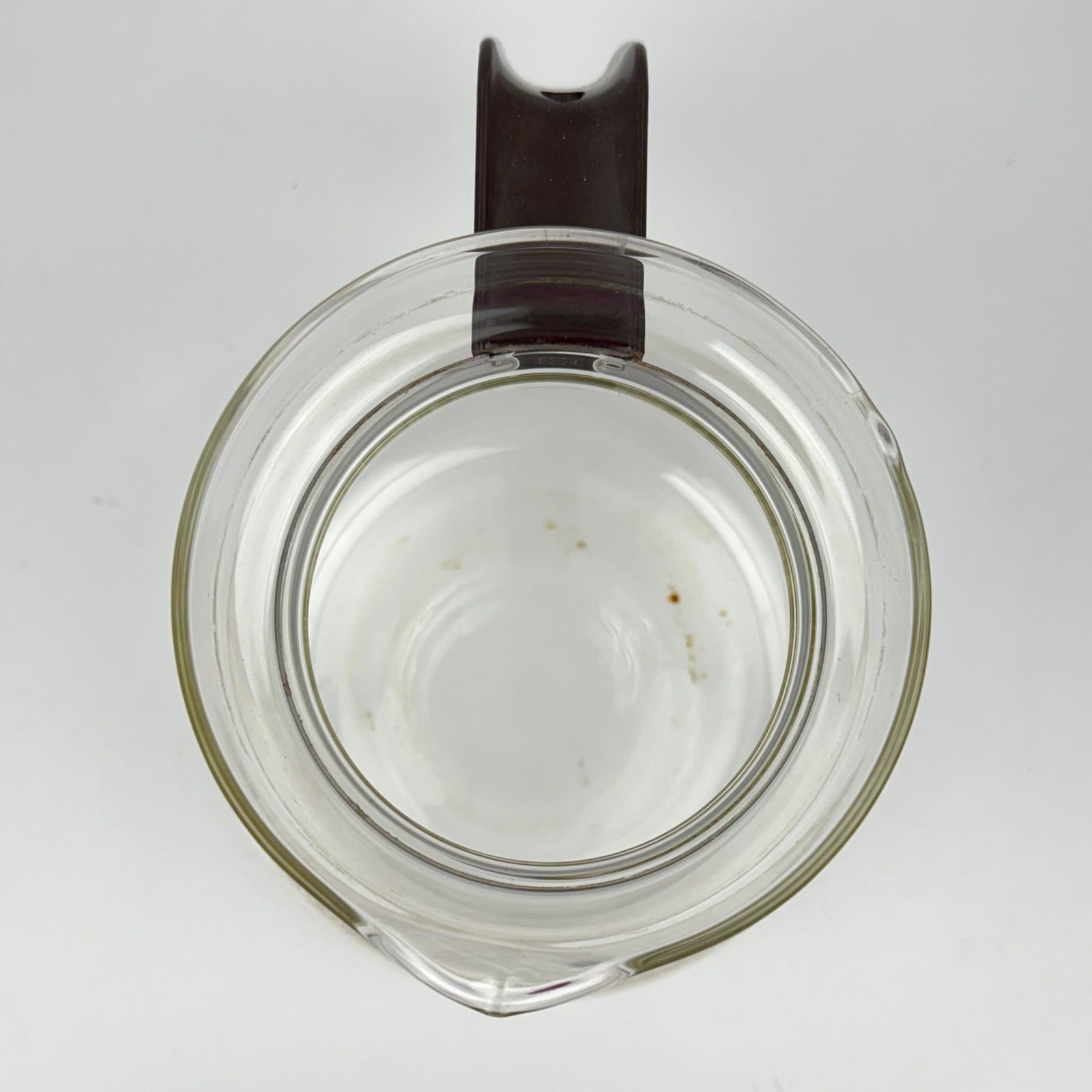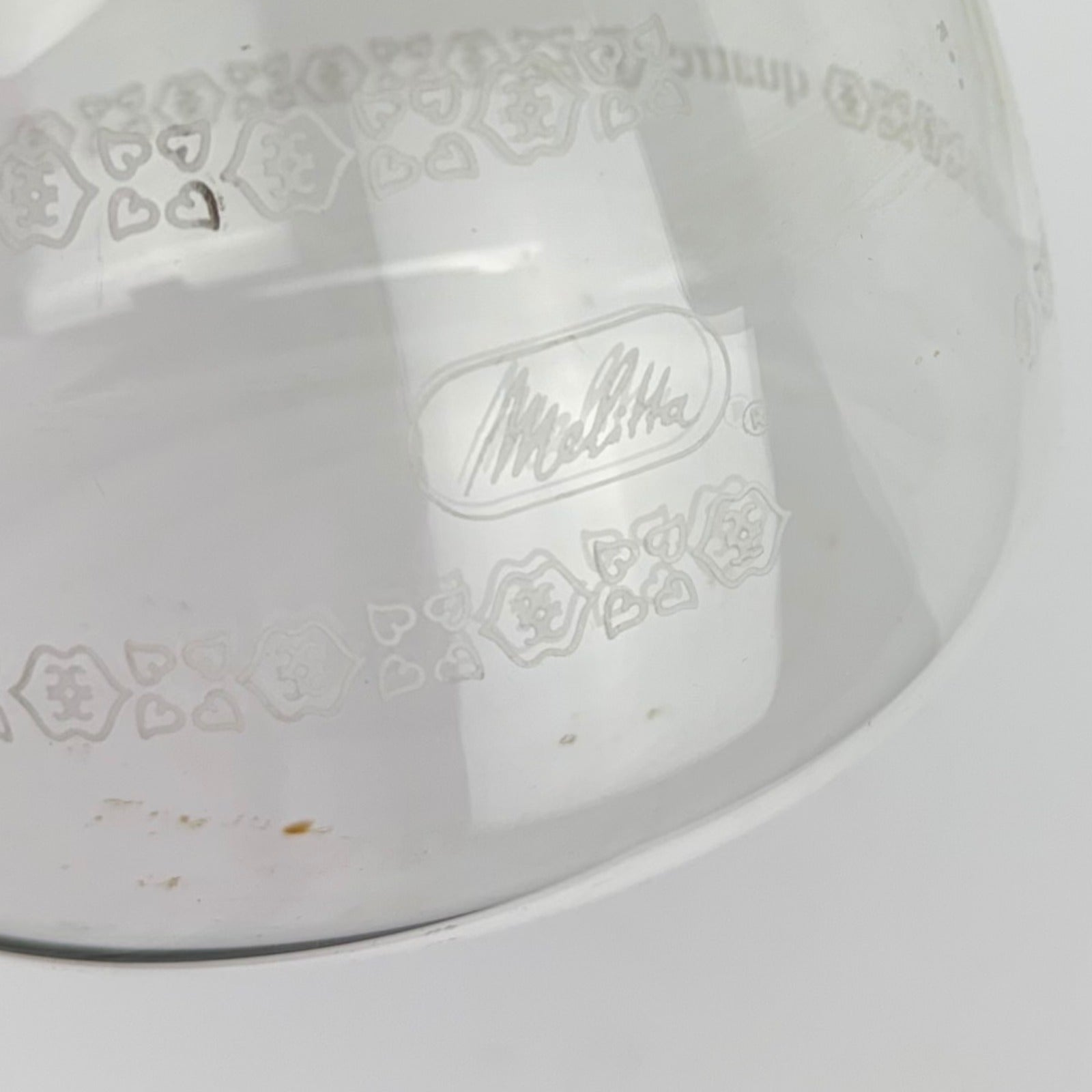Vintage Melitta glass coffee carafe with 8-cup capacity, featuring a sturdy brown plastic handle, matching lid, and white floral-style band with cup measurements. Clear glass body with retro printed detailing. Very good condition with no chips or cracks, lid intact