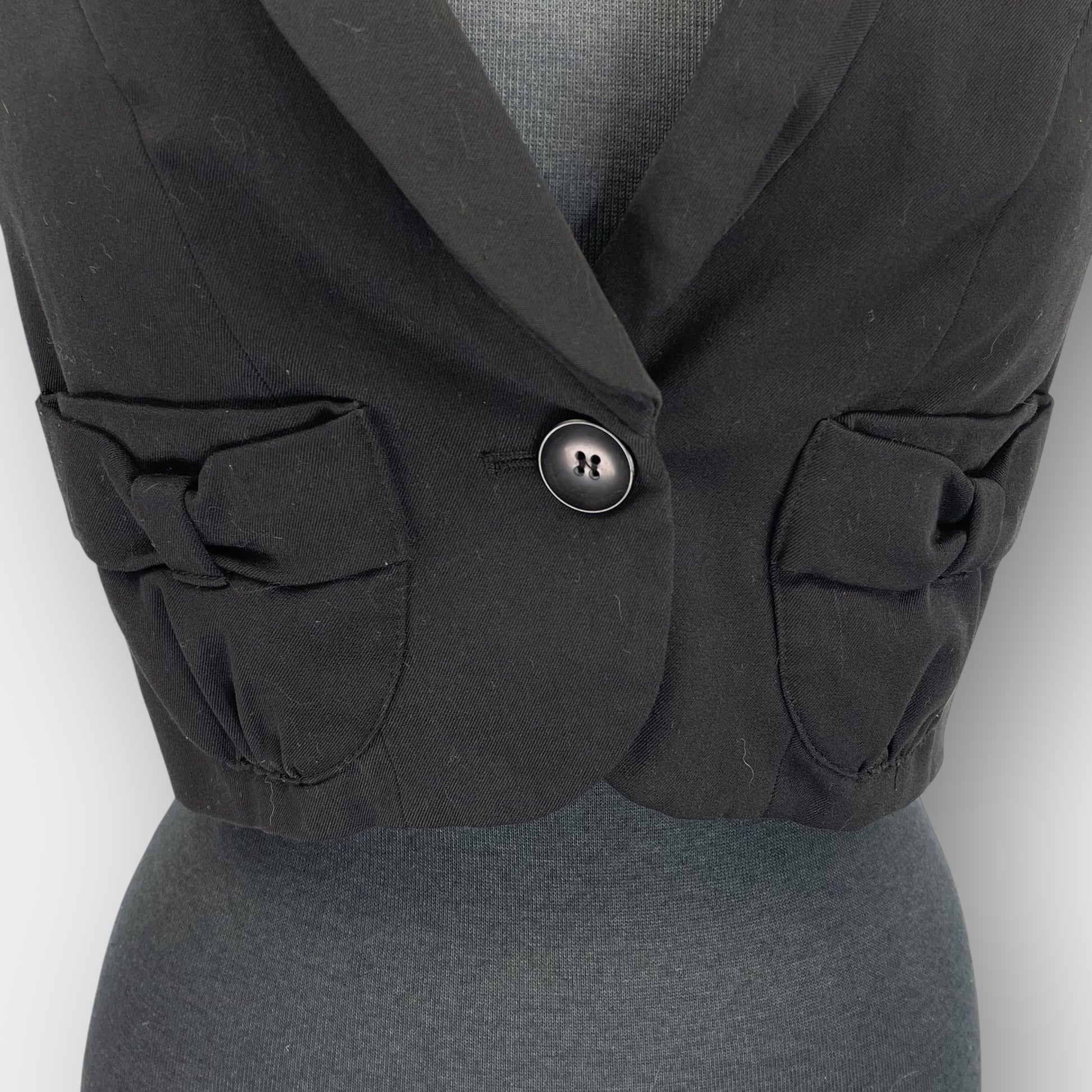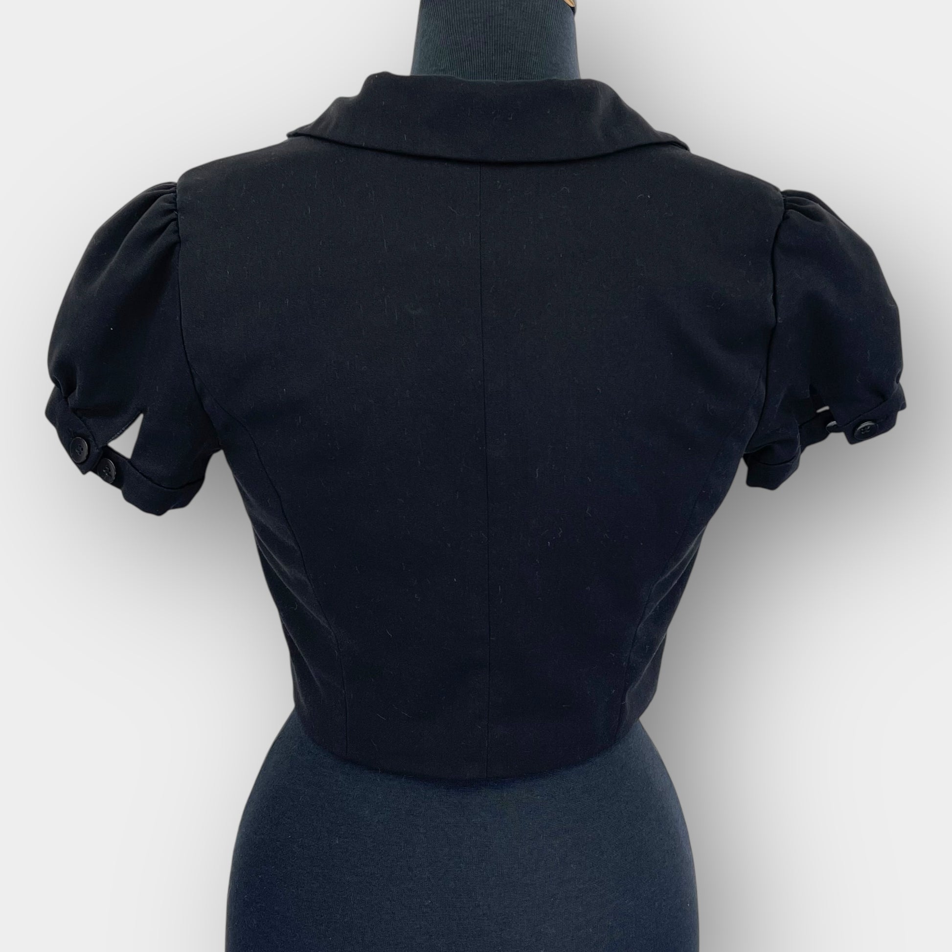 Features short puff sleeves, single button front, notched lapels, and front pockets with bow details. Fully lined, comfortable fit with a bit of stretch, and lined. Sits above the waist for a bolero-style fit and fits like a XS