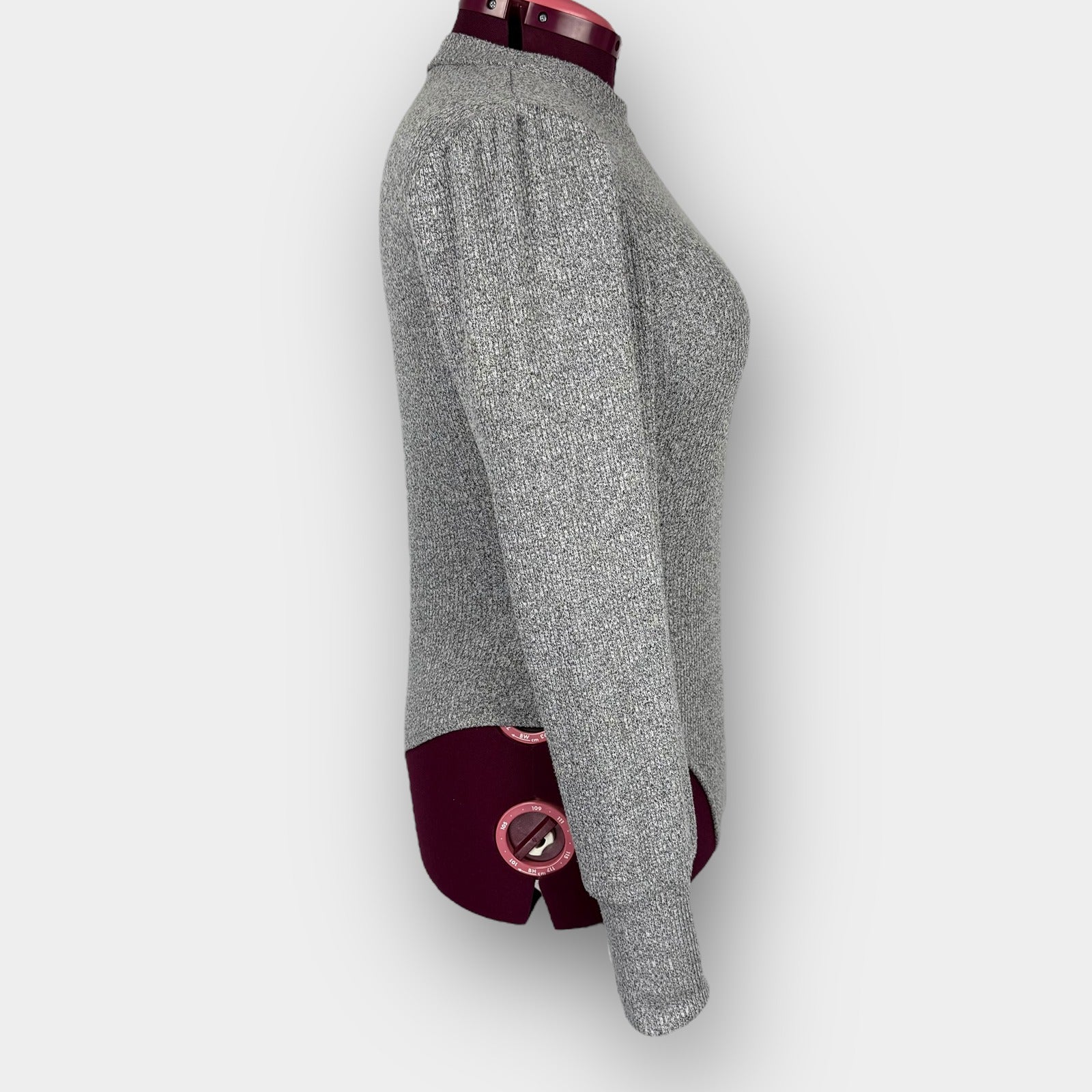 Long-sleeve knit bodysuit in heather grey with subtle ribbed texture, featuring a mock neckline, lightly puffed shoulders, and cuffed sleeves. Snap closure at the base provides a smooth tuck-in fit