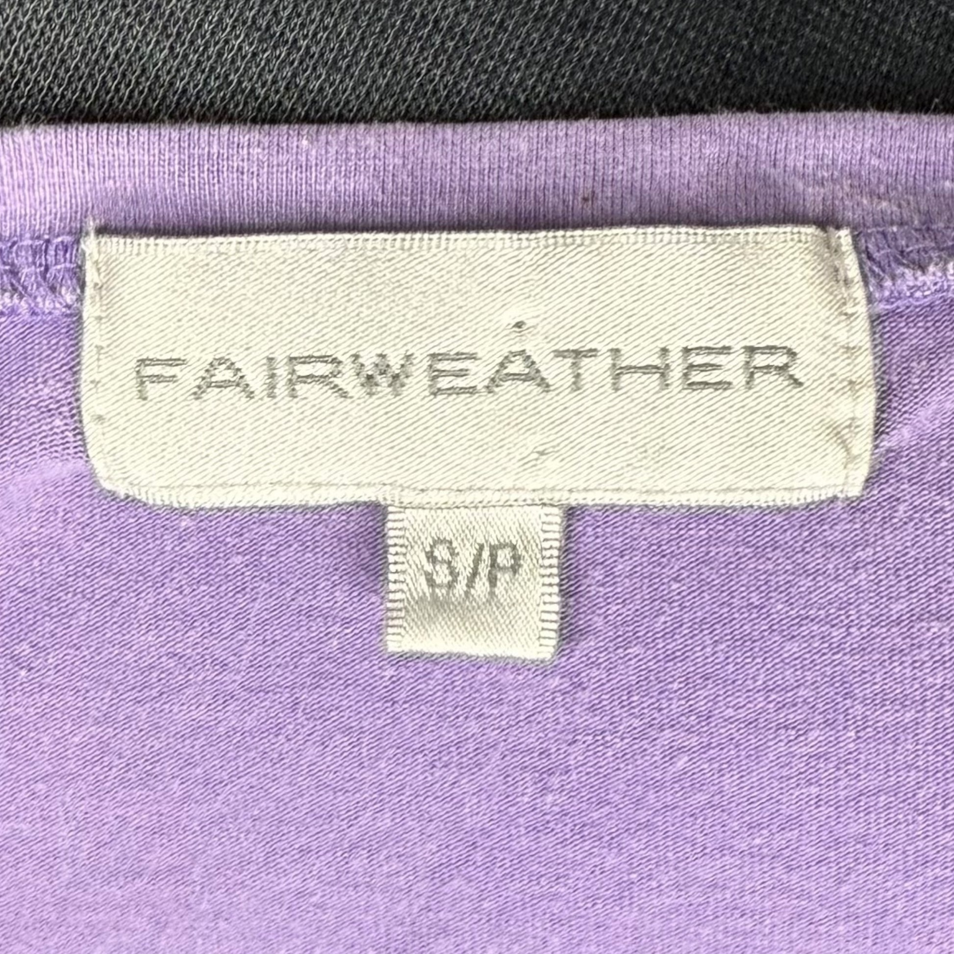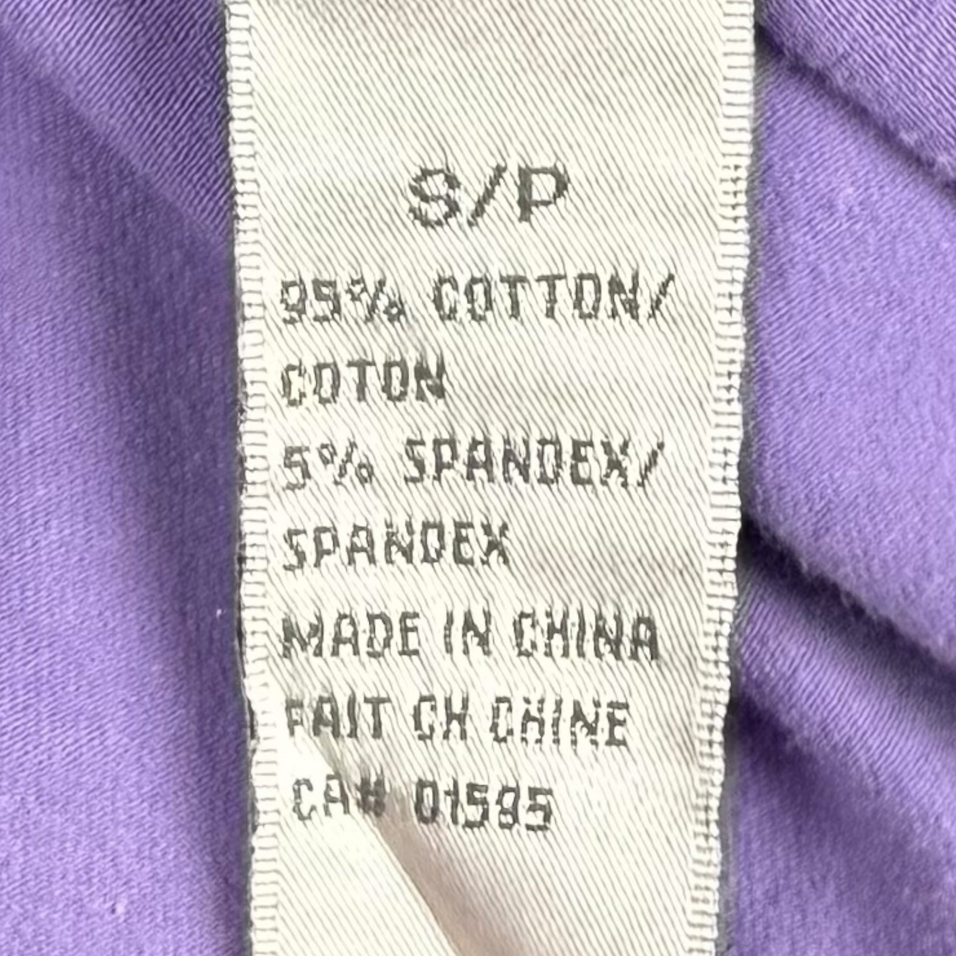 Sleeveless purple wrap-style tank with a V-neckline and crossover front detail, fitted cut, and simple straight hem. Light stain on the back fabric is visible up close