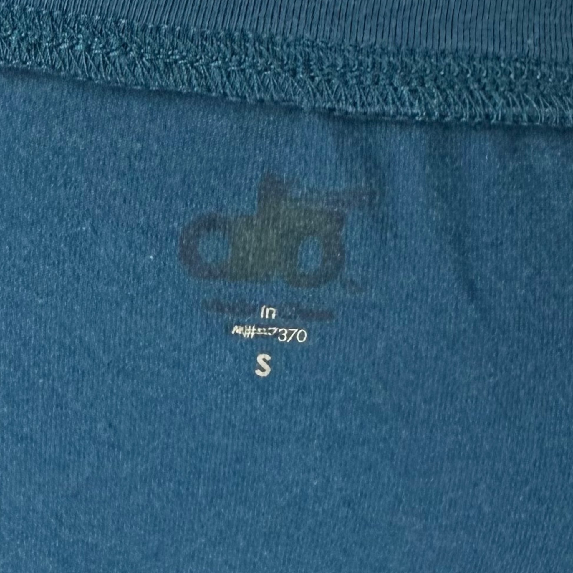 This blue ALO top features a scoop neckline with subtle seaming details, ¾ sleeves, and a straight hem, made from a soft bamboo-blend fabric that gives it stretch and drape. It shows light wash wear but remains in good overall condition