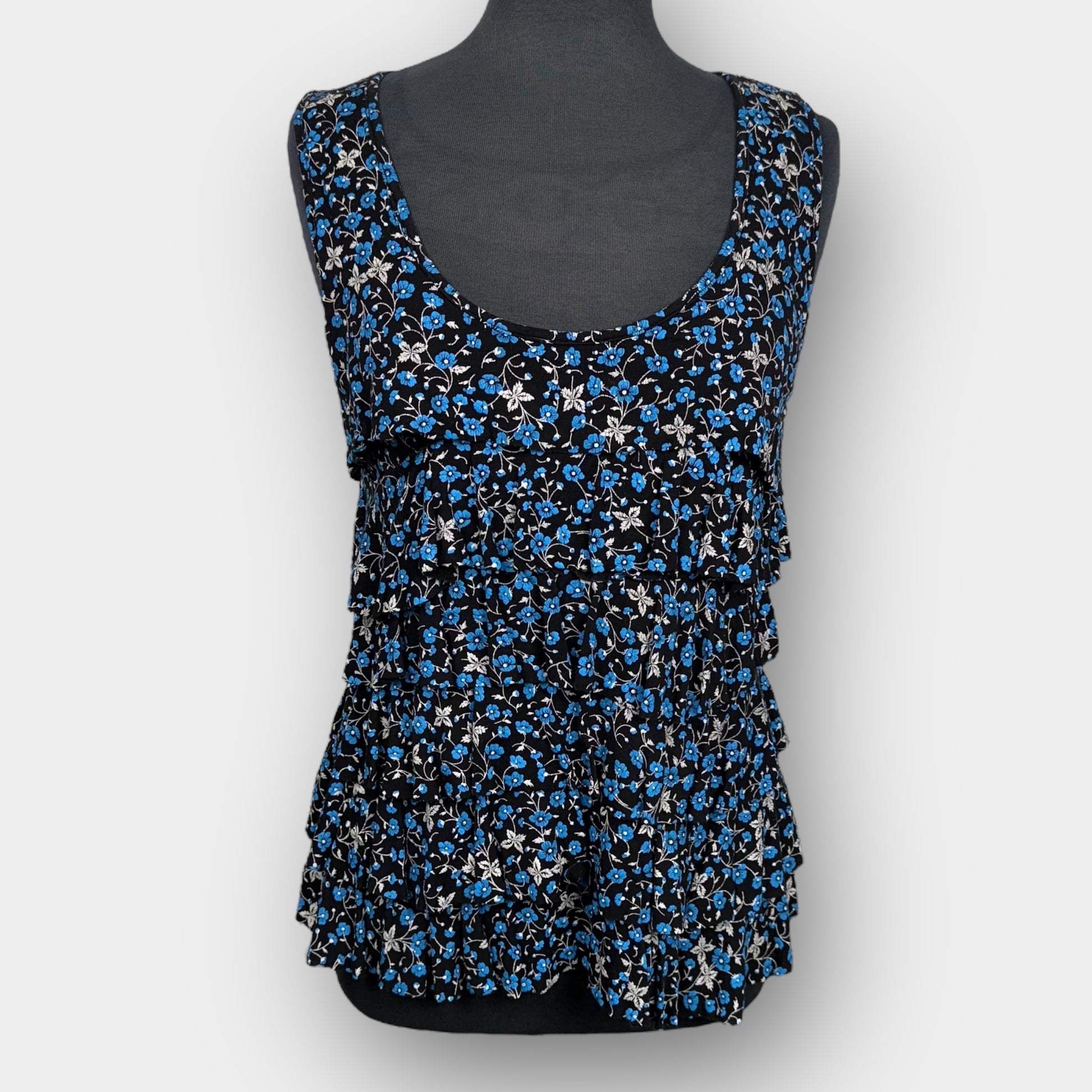 This sleeveless Papillon top features a scoop neckline and cascading tiered ruffles in a black base with blue and white floral cracked print, finished with a simple back opening detail