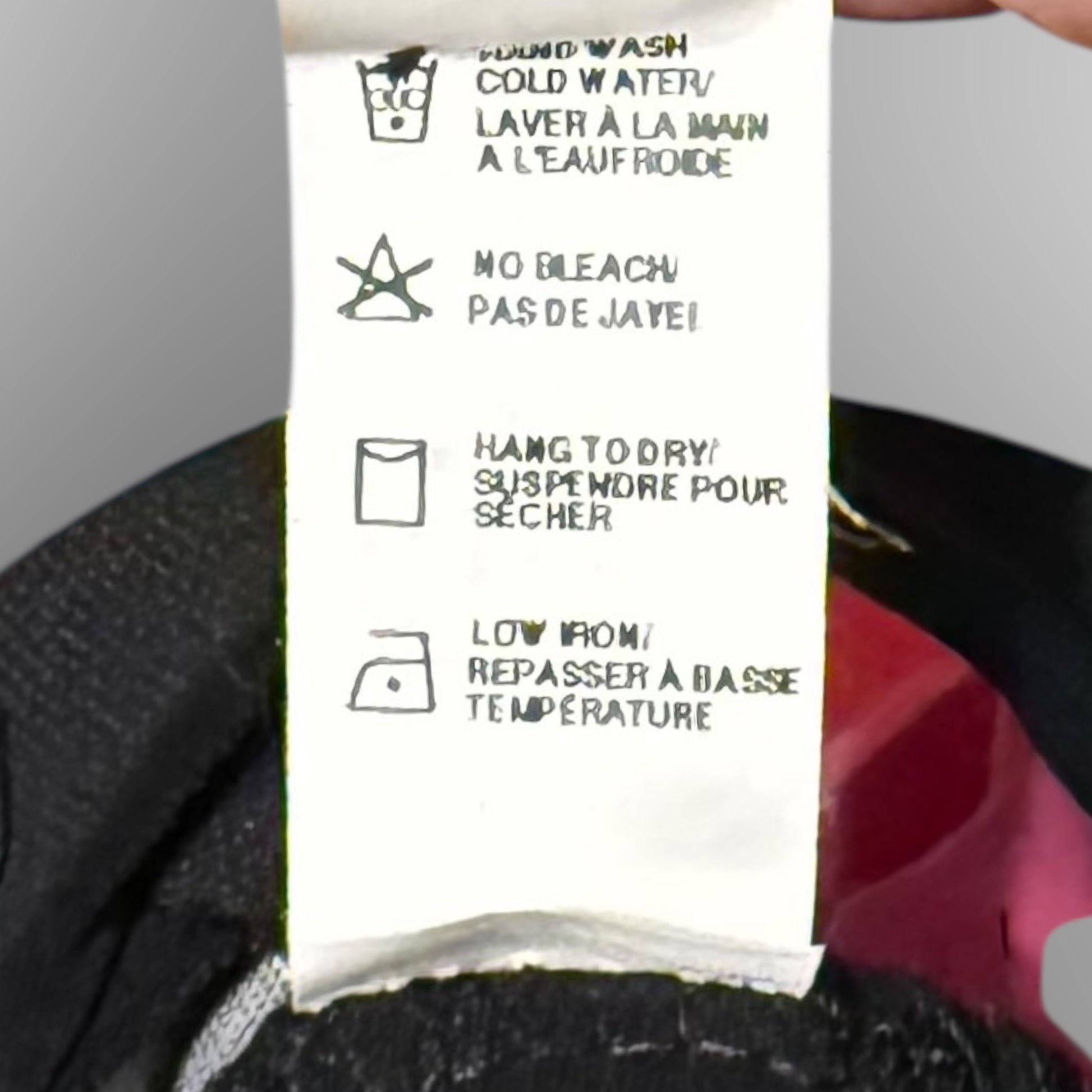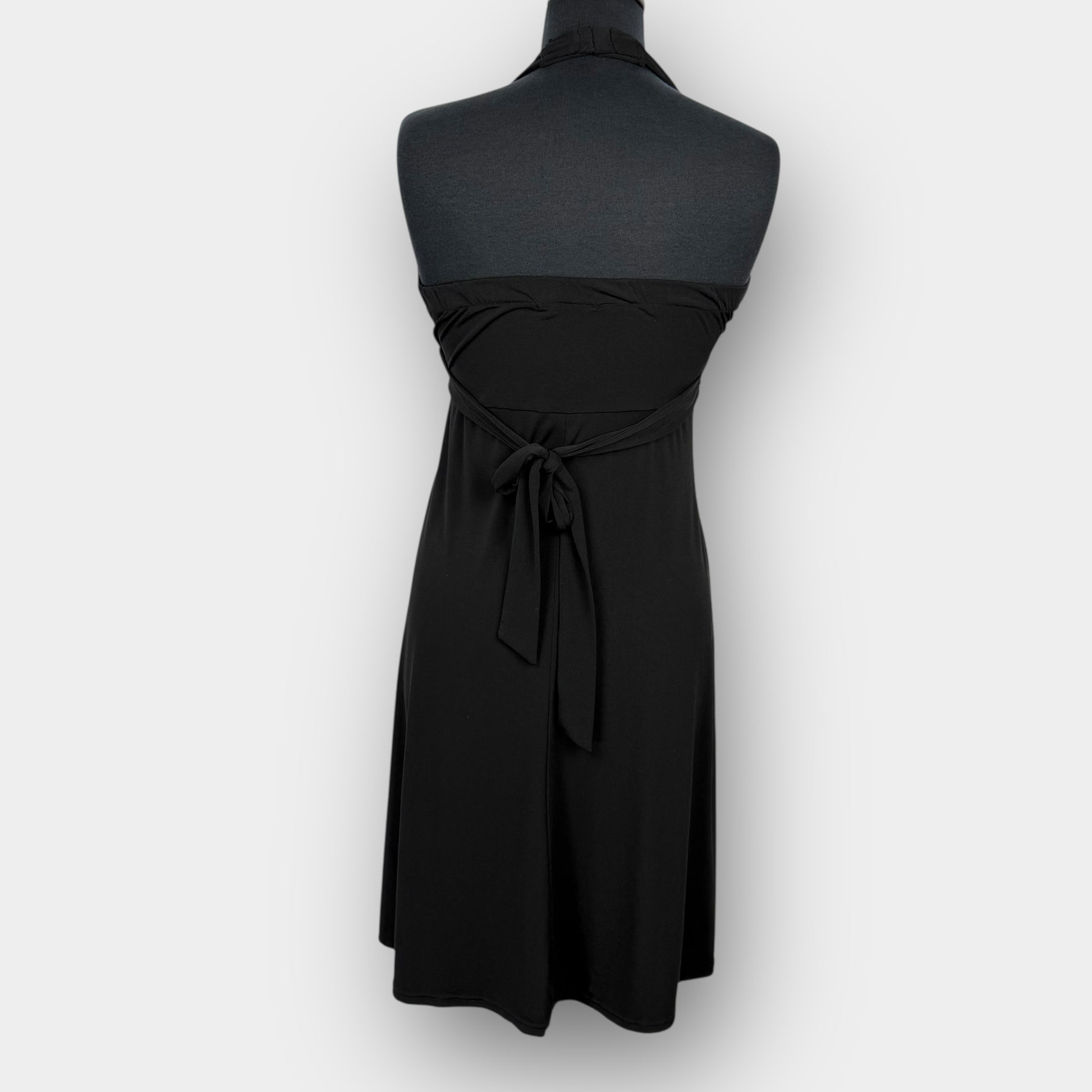 This George halter dress has a deep V-neck, cinched empire waist with a circular buckle detail that ties behind the neck, an open back with waist ties, and a softly flared knee-length hem; note that the buckle is missing all its decorative stones but still looks fine from afar, and although tagged Medium the stretchy waist and overall fit align more with a Small