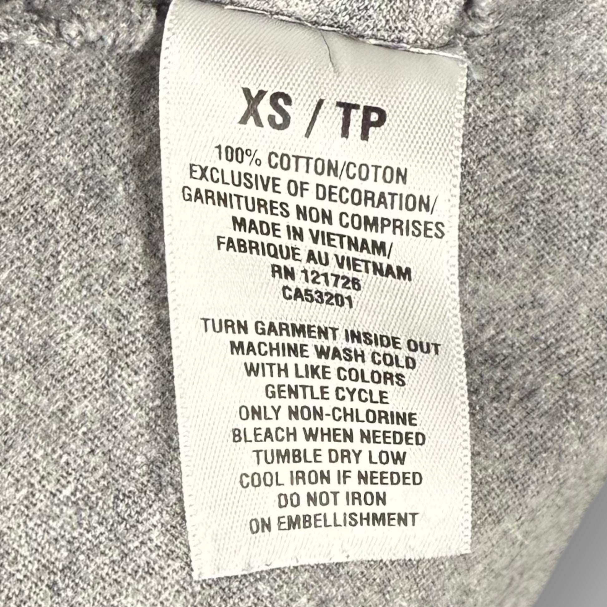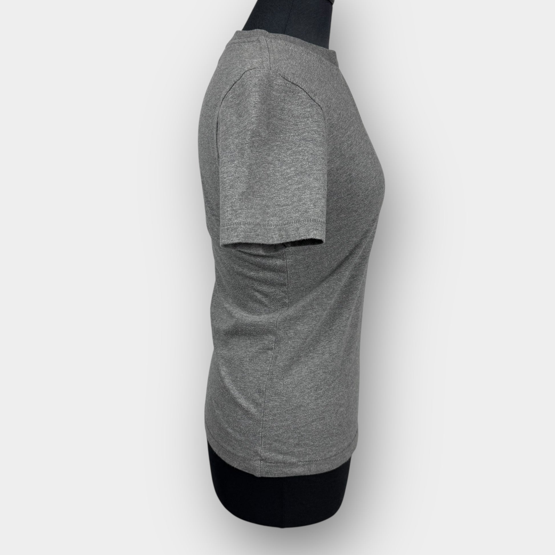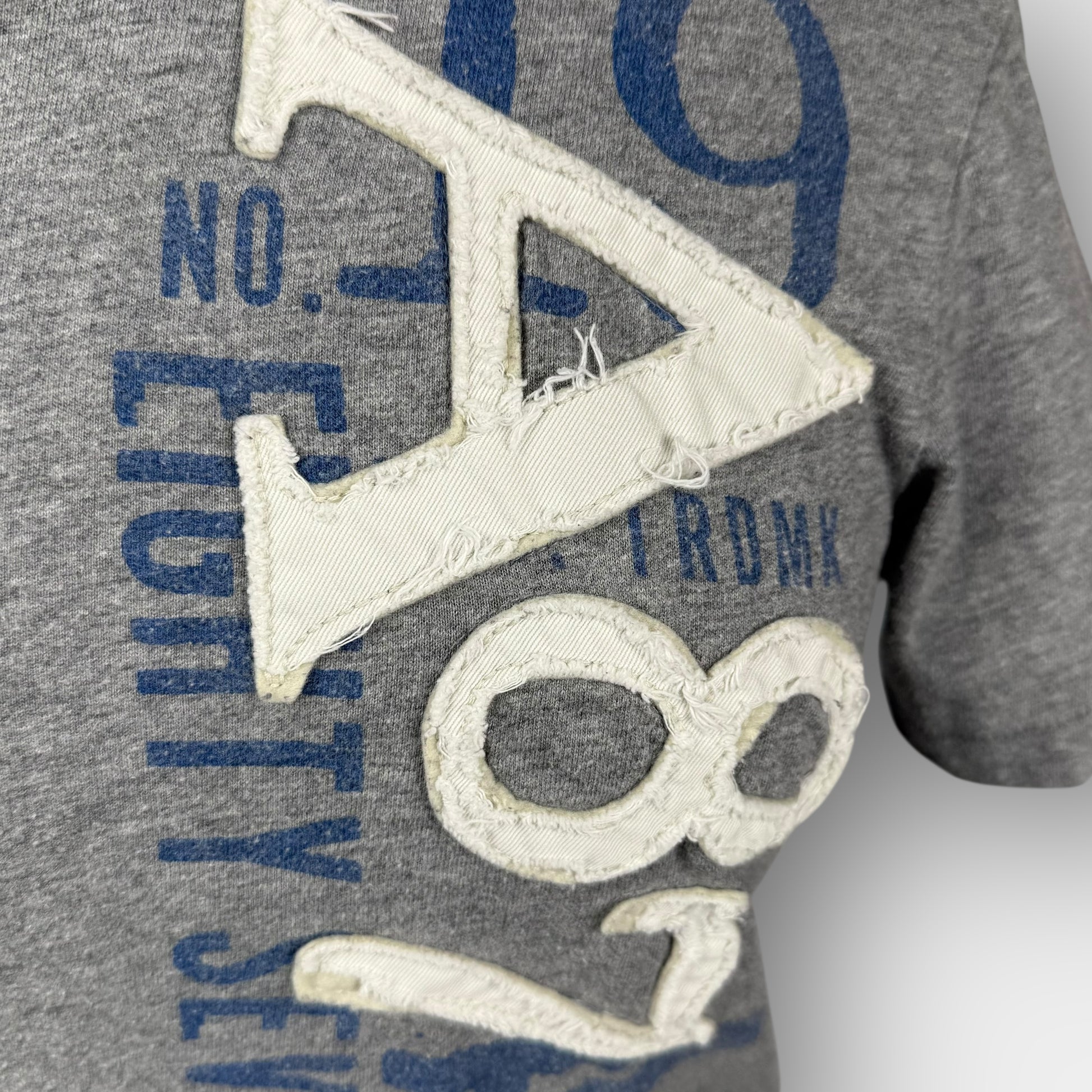 Grey short sleeve tee with a crew neckline, featuring a large distressed appliqué “A87” logo and vertical Aero graphic on the front