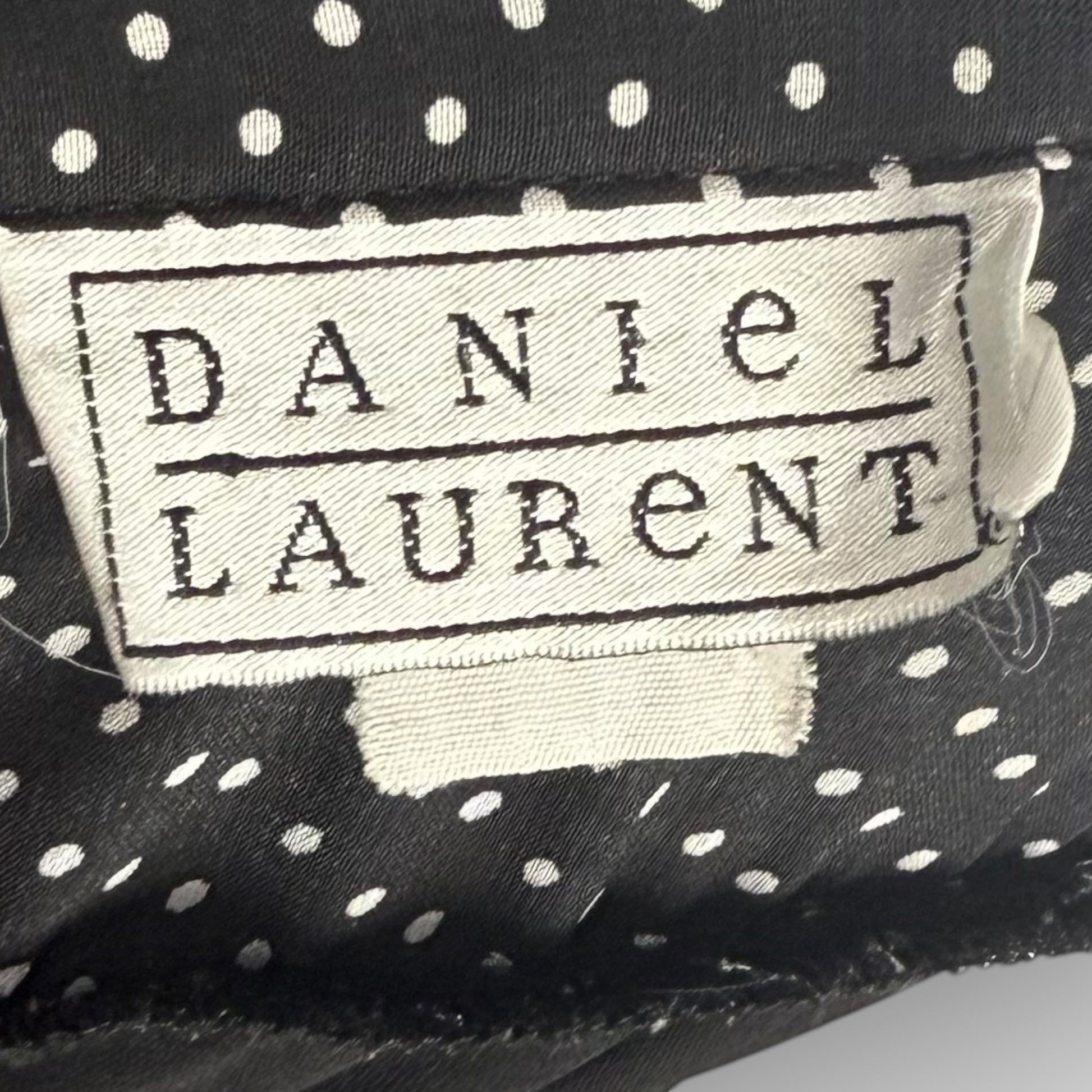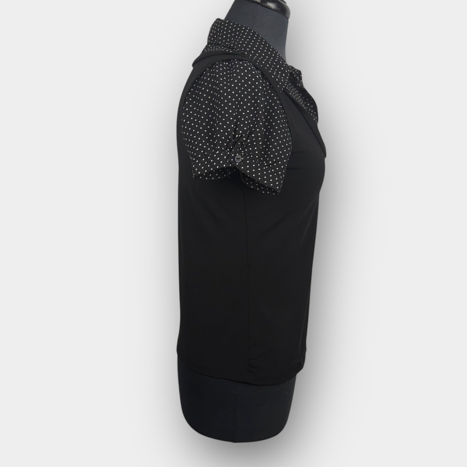 This Daniel Laurent top features a layered-look design with a solid black knit body and an attached collared underlayer in black with white polka dots, finished with short sheer puff sleeves that have buttoned cuffs and light volume; size tag is missing but based on measurements it fits like a Small
