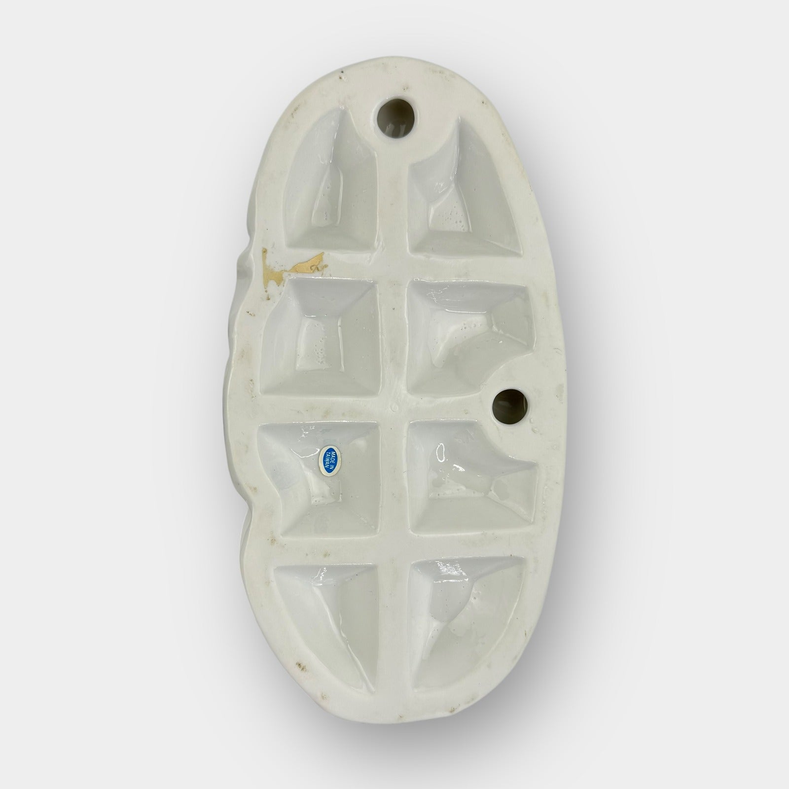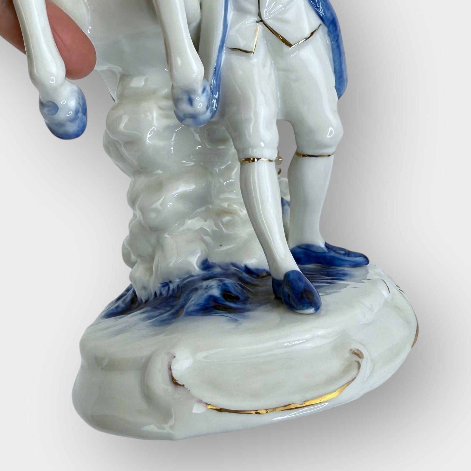 Vintage porcelain figurine approximately 9" tall depicting a horse ridden by a lady, led by a handler. Hand painted in blue and white with gold trim accents, including a gold chain rein. No chips or cracks; some dirt in crevices as shown in photos. Detailed florals and scrollwork on base