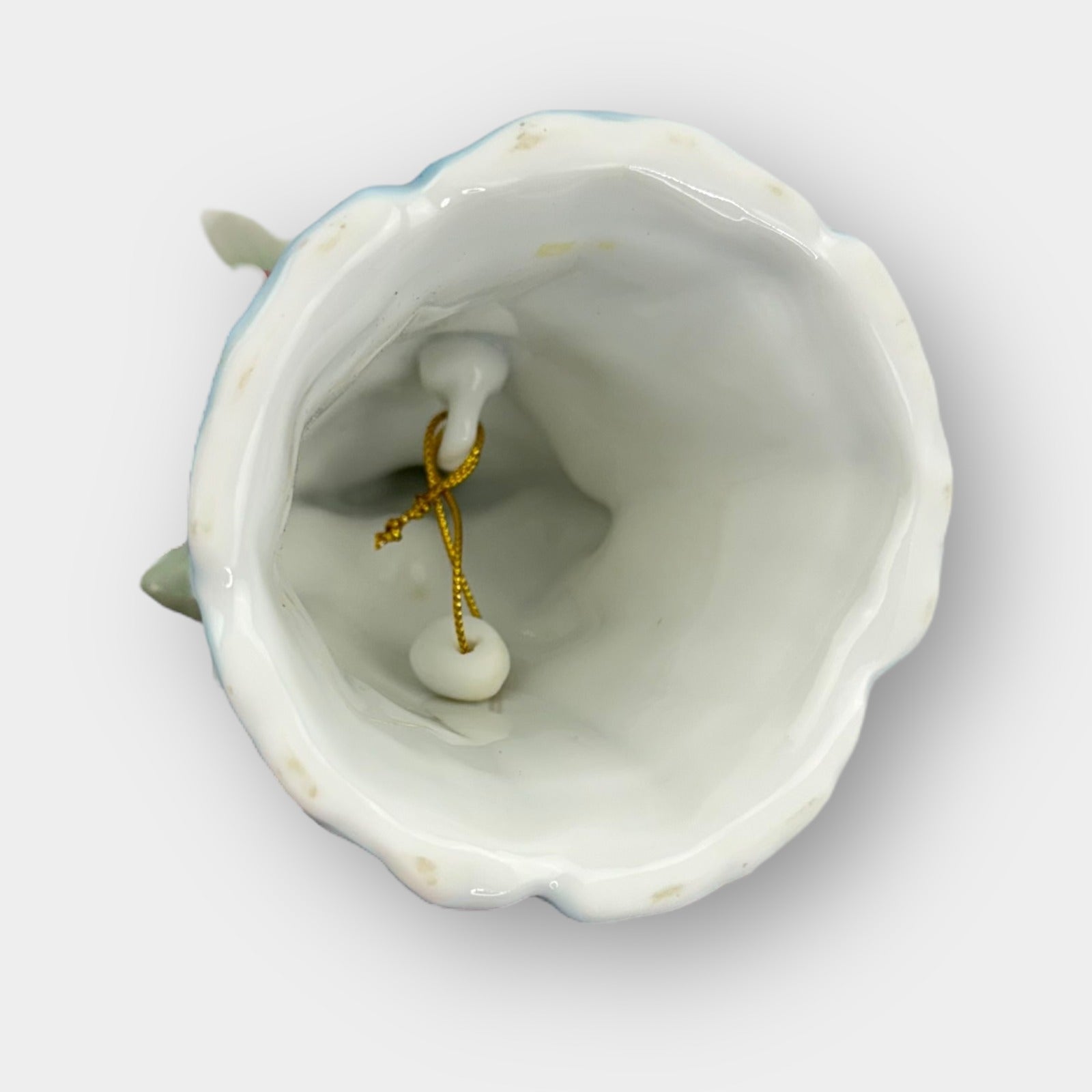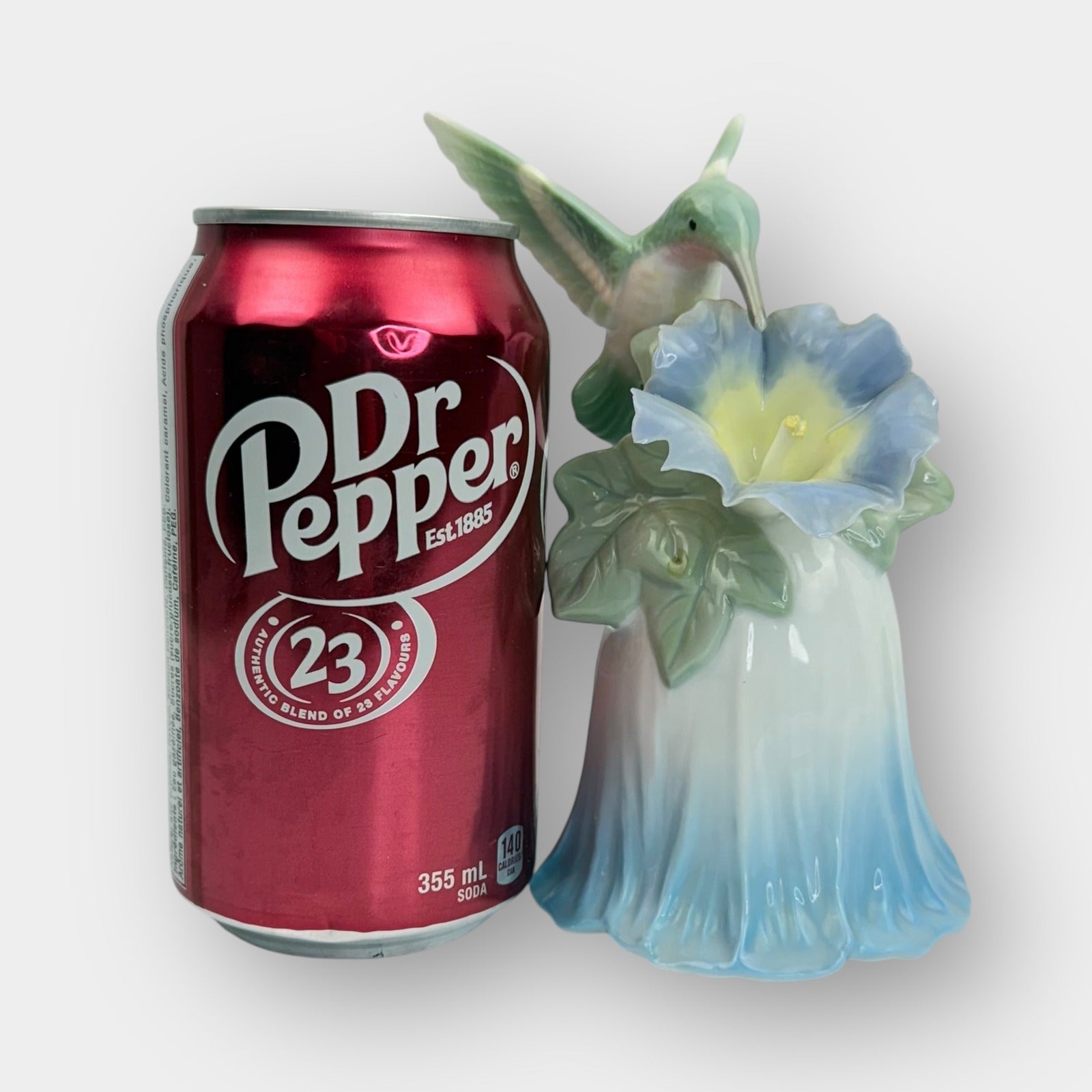 Porcelain bell featuring a green hummingbird in flight sipping from a blue and yellow morning glory flower. The piece has soft hand-painted detailing with green leaves and a fluted base, complete with the original clapper inside