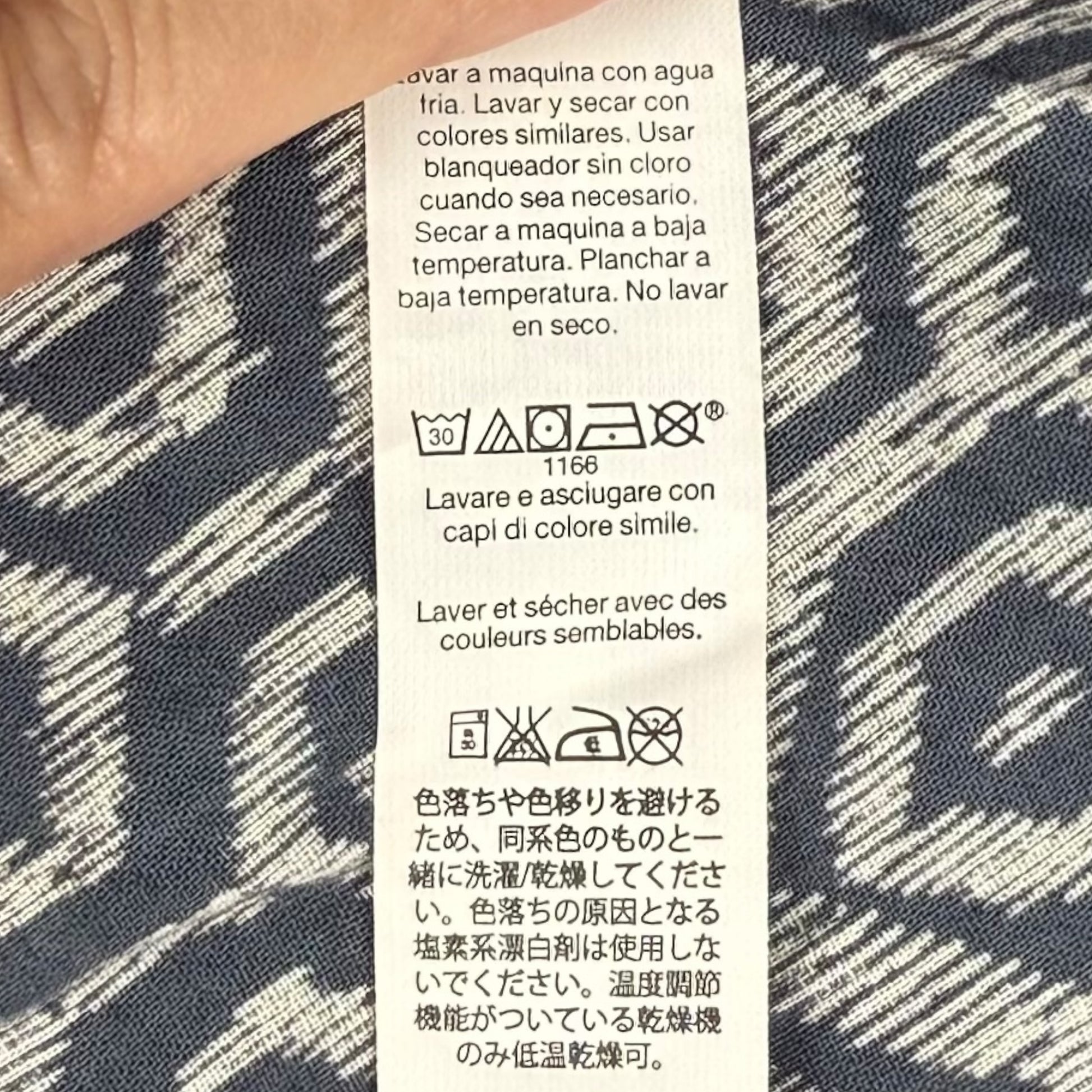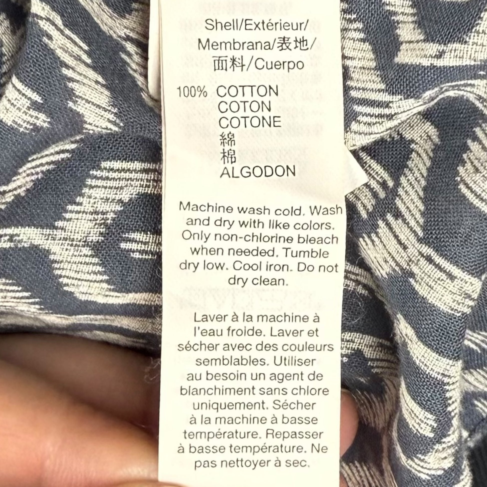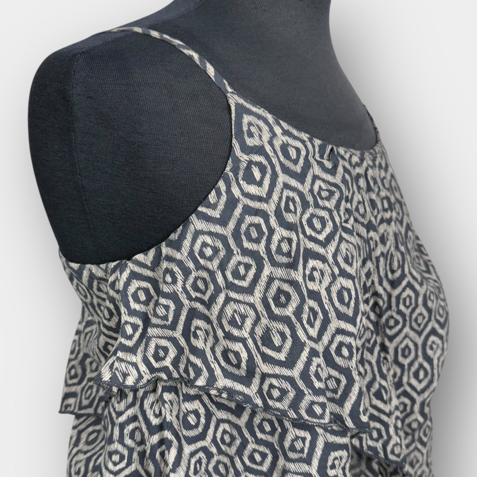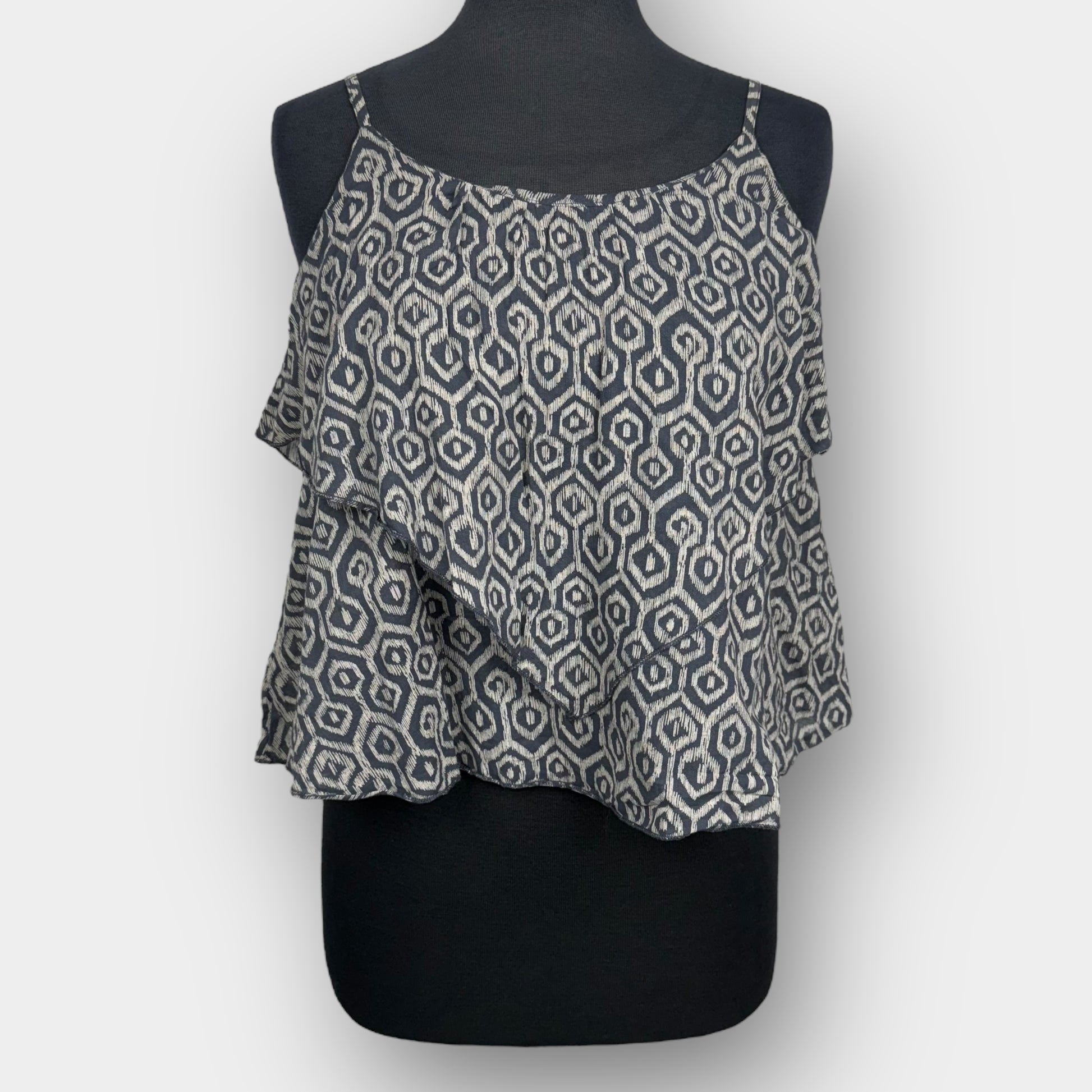 Gap cami top in a navy and white geometric print with layered ruffle overlay front and back and slim adjustable straps; tag says XS but fits closer to Small due to the relaxed chest and drapey style, and condition is very good with no visible flaws