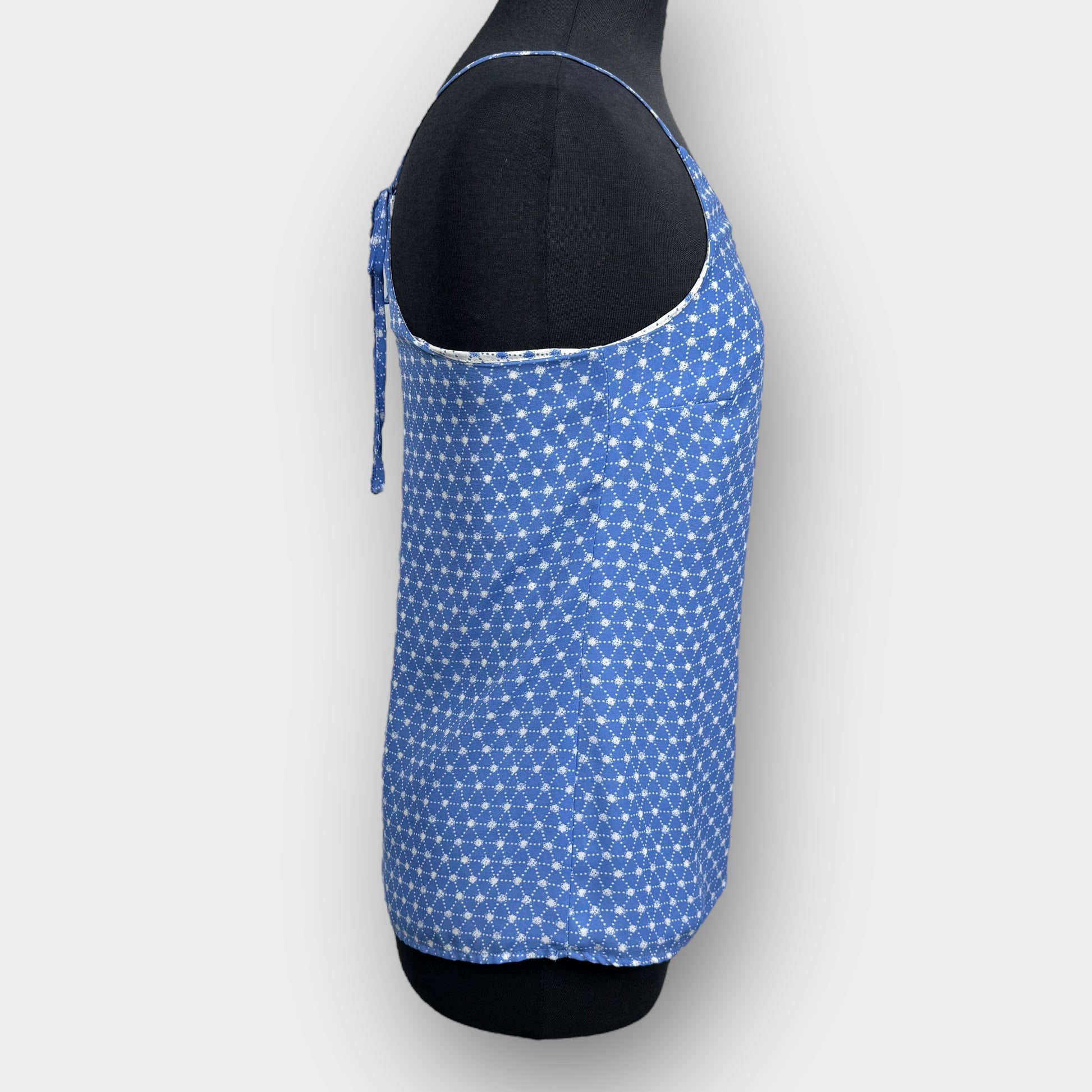 Reversible camisole with delicate spaghetti straps and a tie at the back, featuring a diamond-dot print on each side—one blue with white dots, the other white with blue dots—finished with a soft scoop neckline and straight hem. Tag is missing but measurements suggest it fits like a Small.
