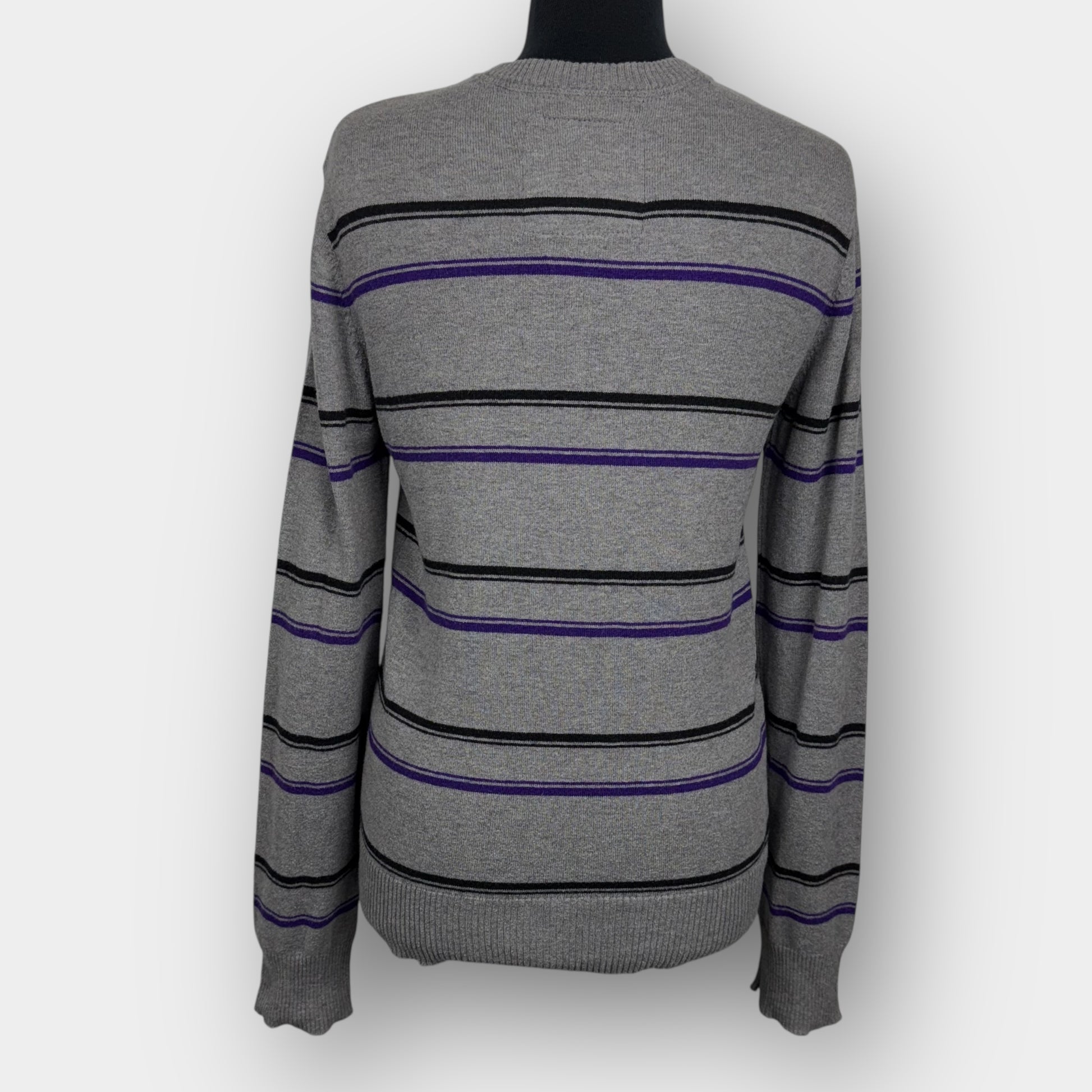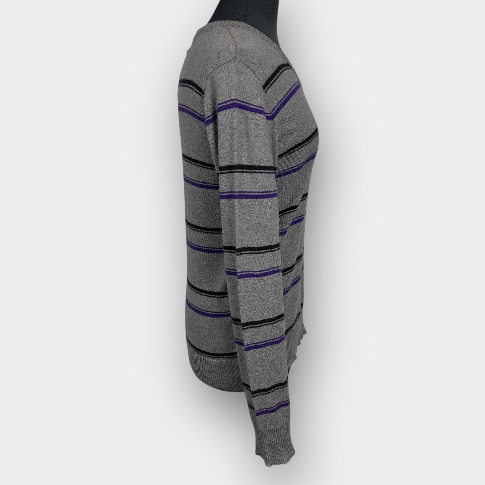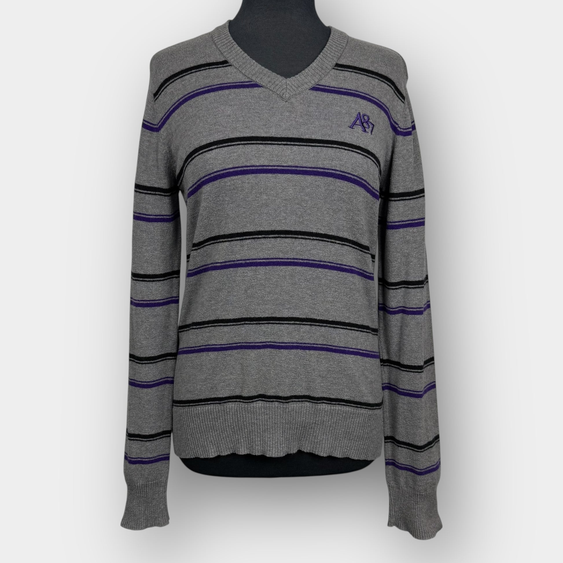 Gray V-neck sweater with black and purple horizontal stripes and A87 logo embroidery on the chest. Features ribbed cuffs and hem