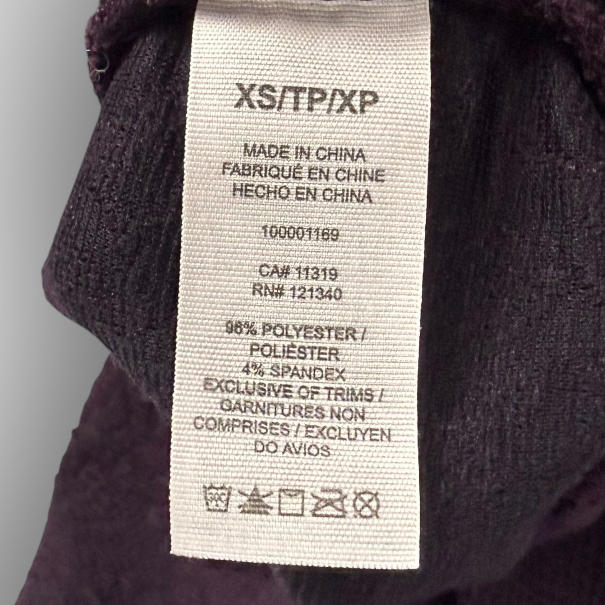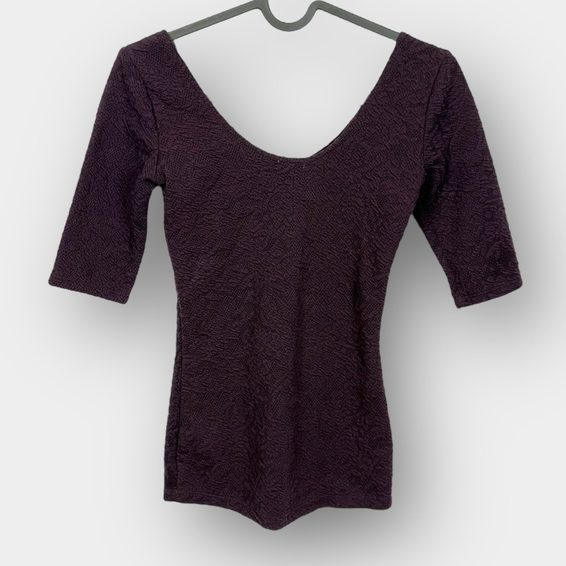 Garage textured knit top in deep purple with a scoop neckline and half sleeves. The fabric has a raised jacquard-style pattern that gives it a structured look. Slim fit with stretch, finished with a low scoop back