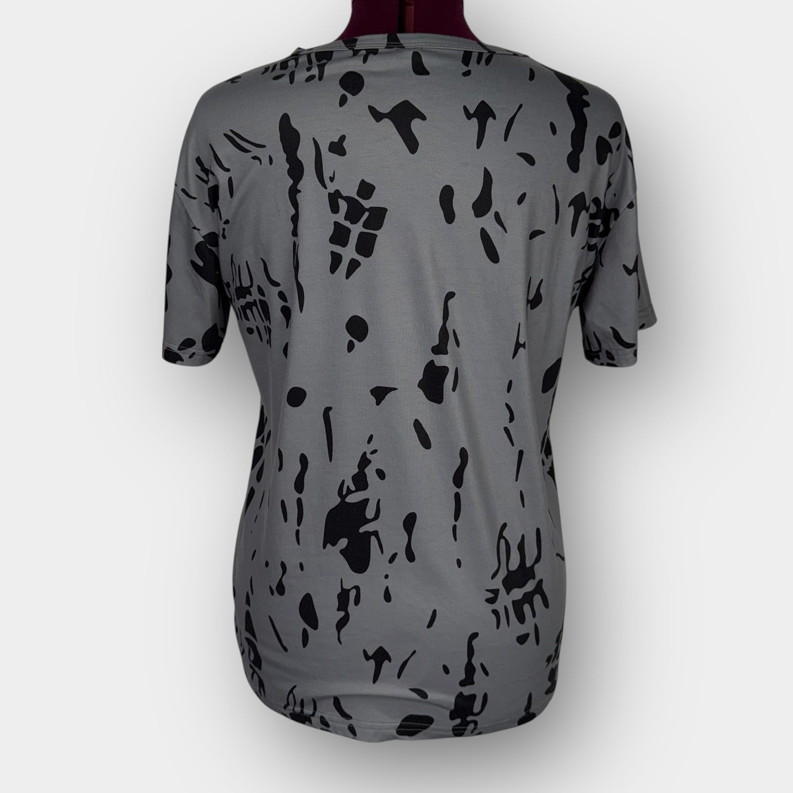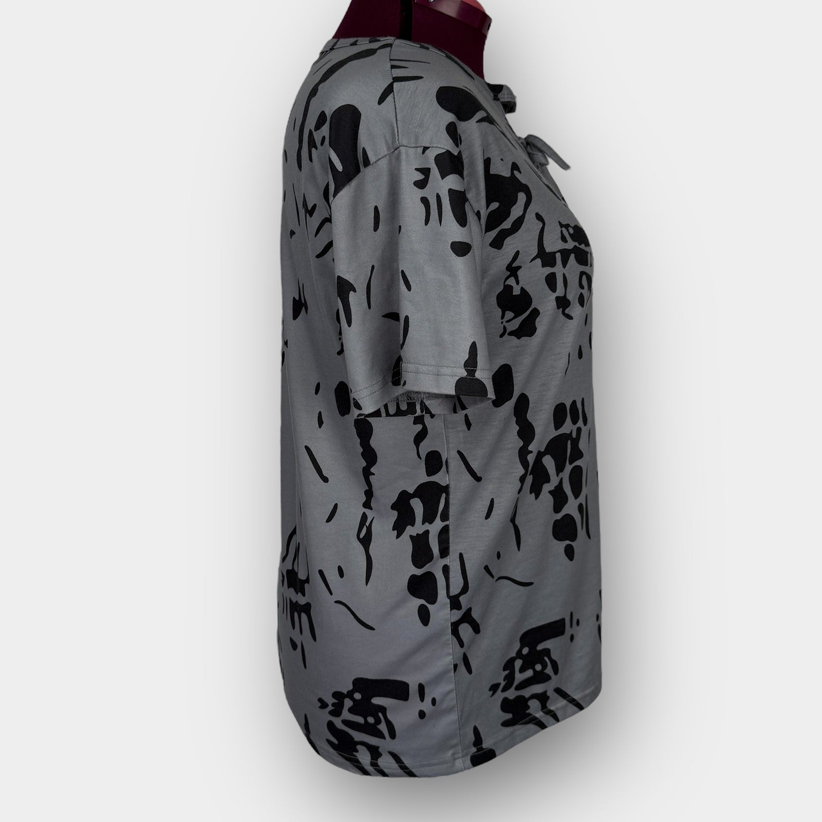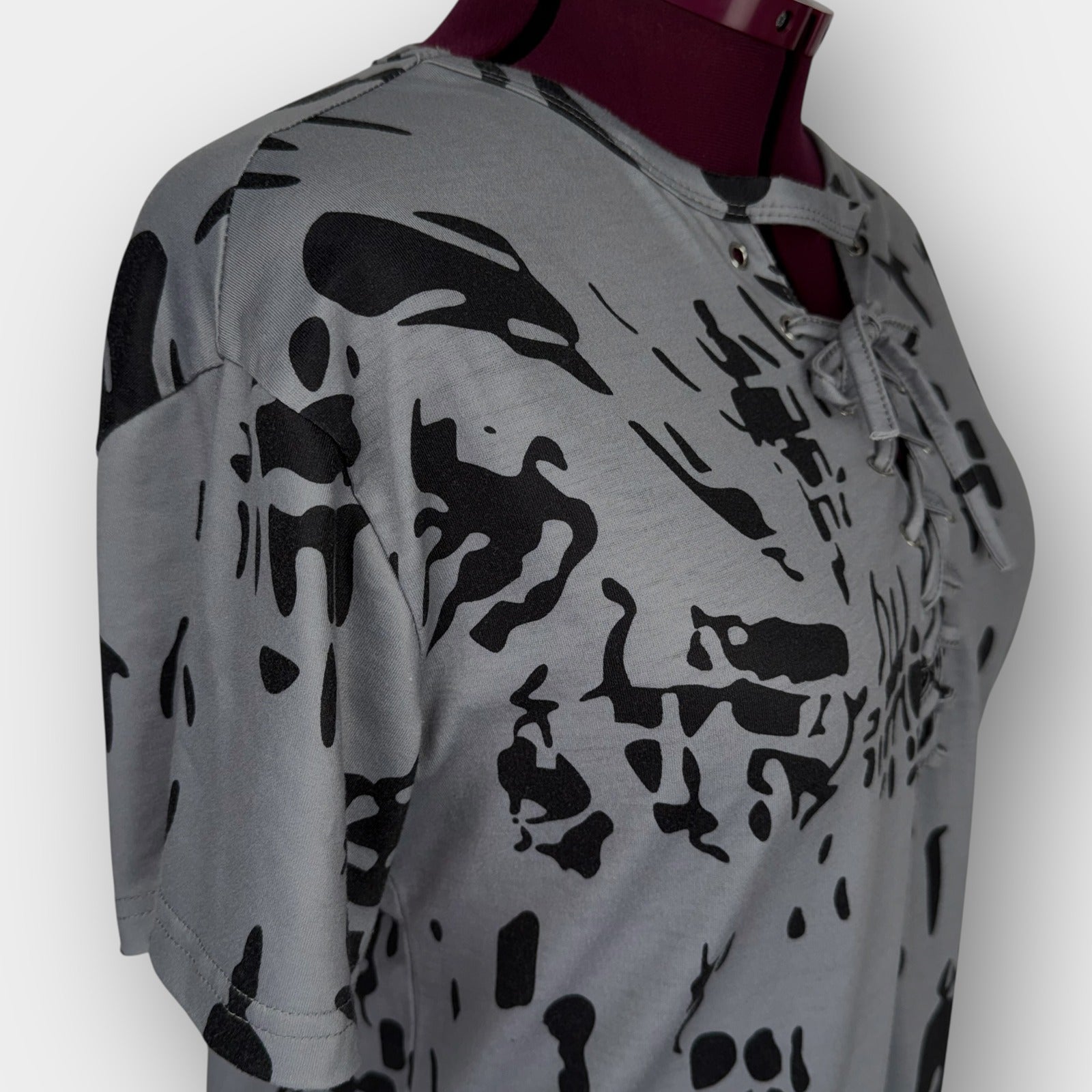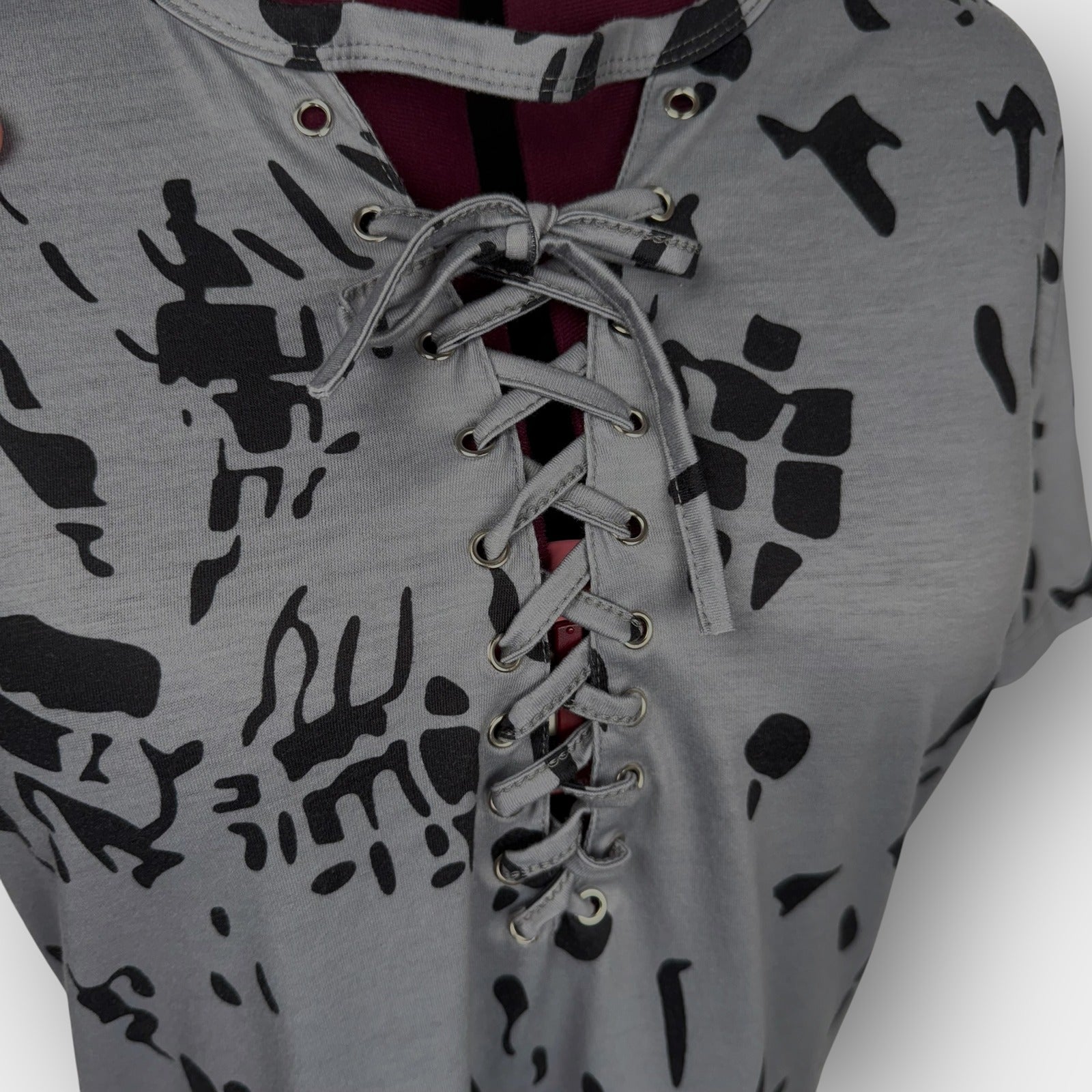 Lightweight grey short-sleeve top with abstract black print, featuring a lace-up grommet neckline detail, scoop hem, and relaxed body that falls longer in back. No size tag; fits like Women’s XL based on measurements