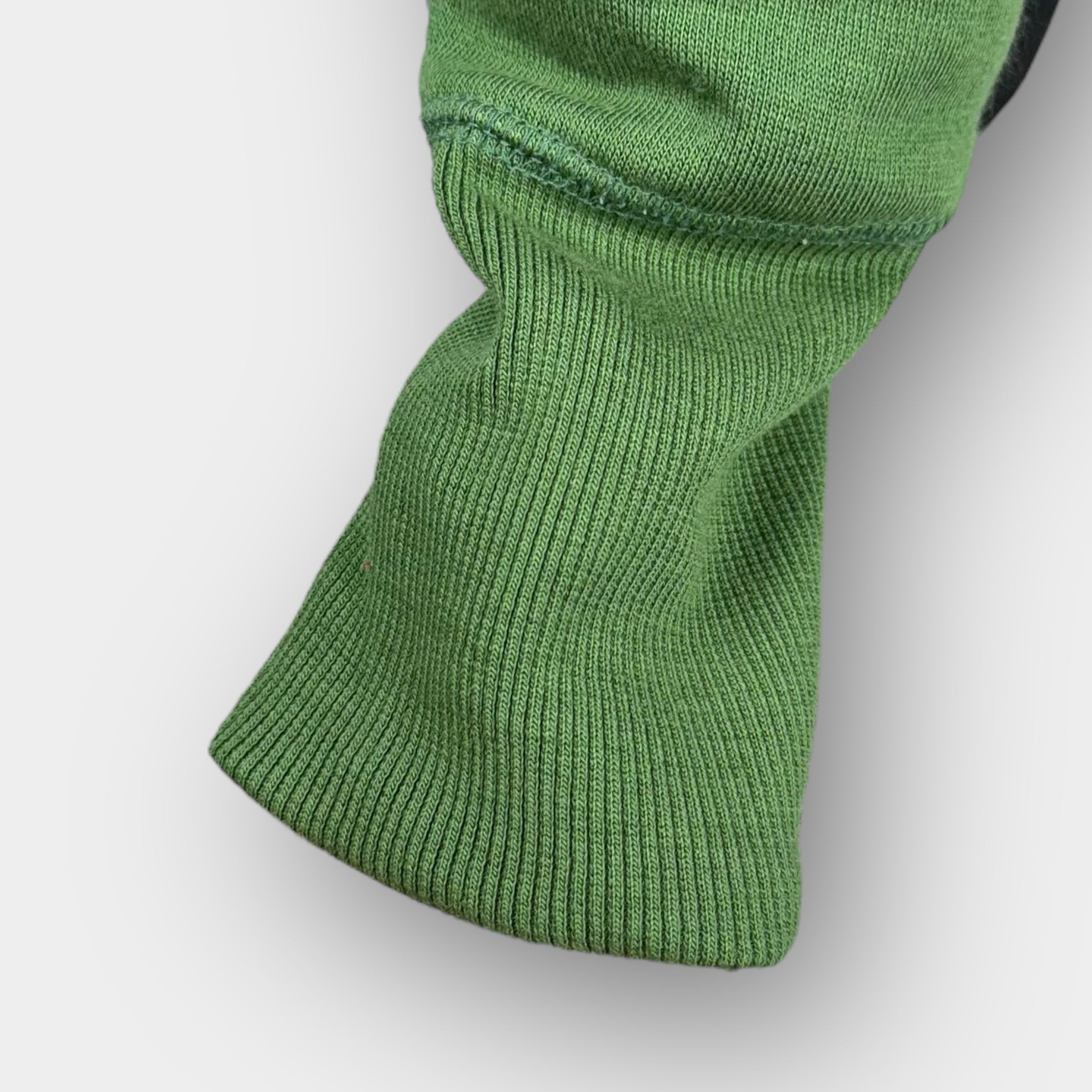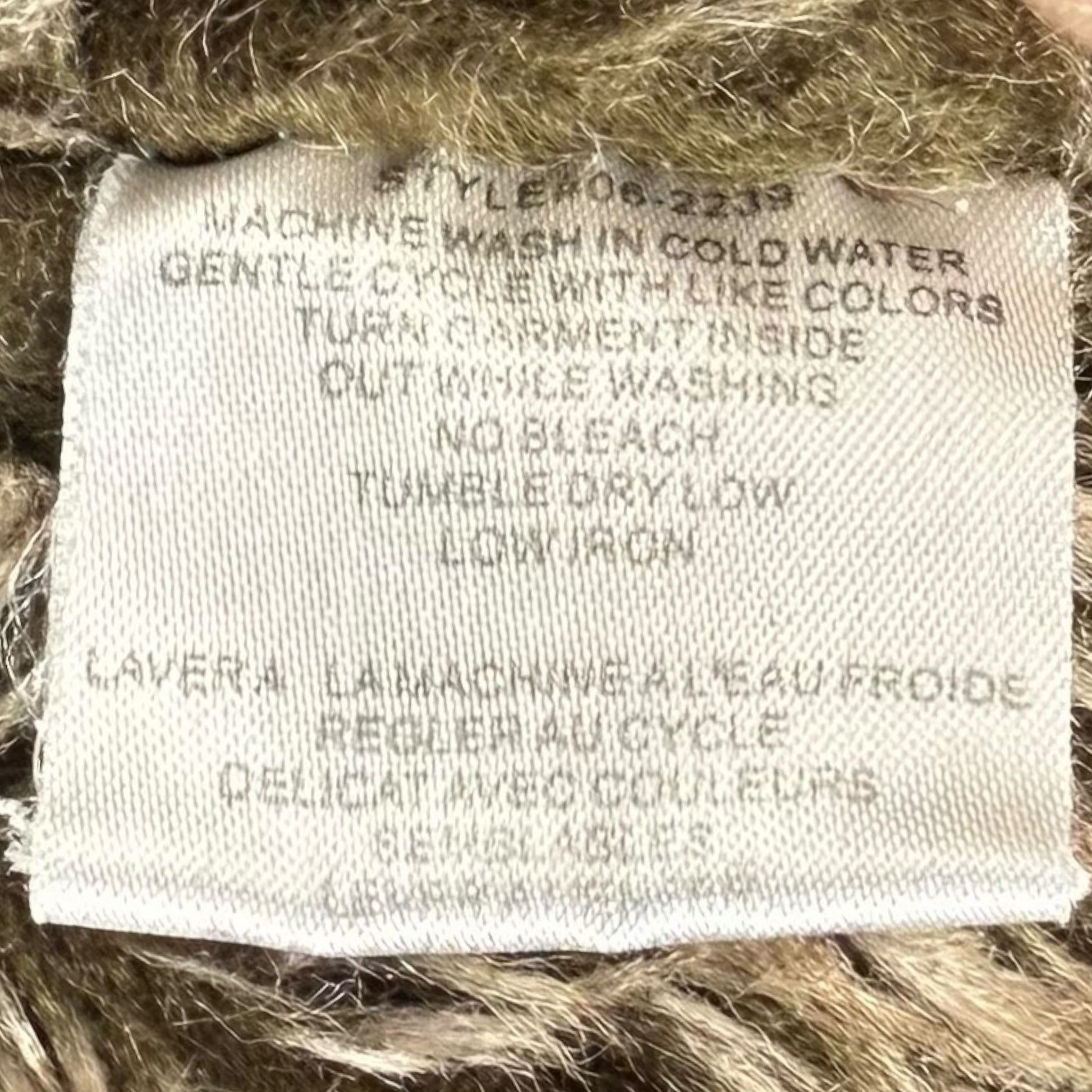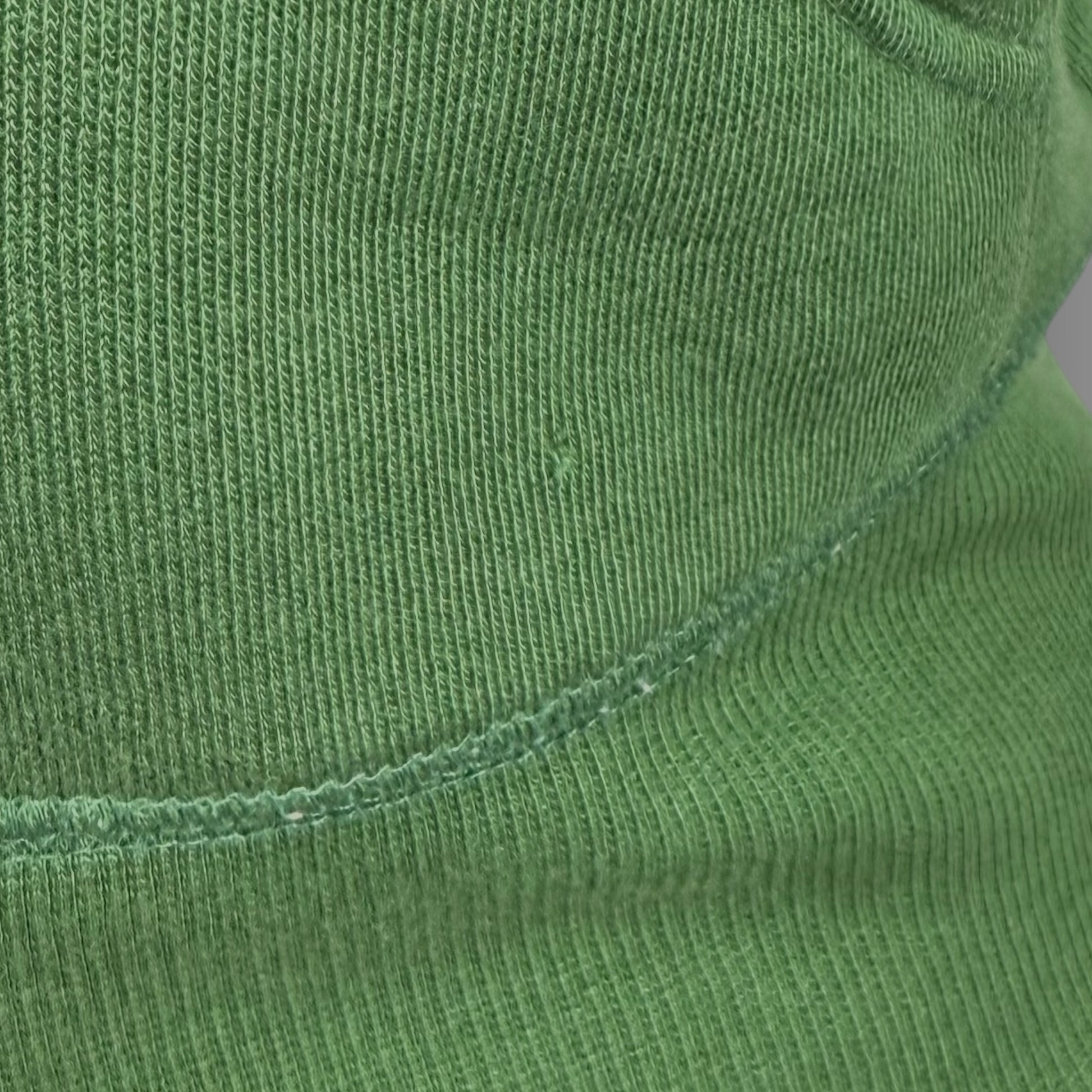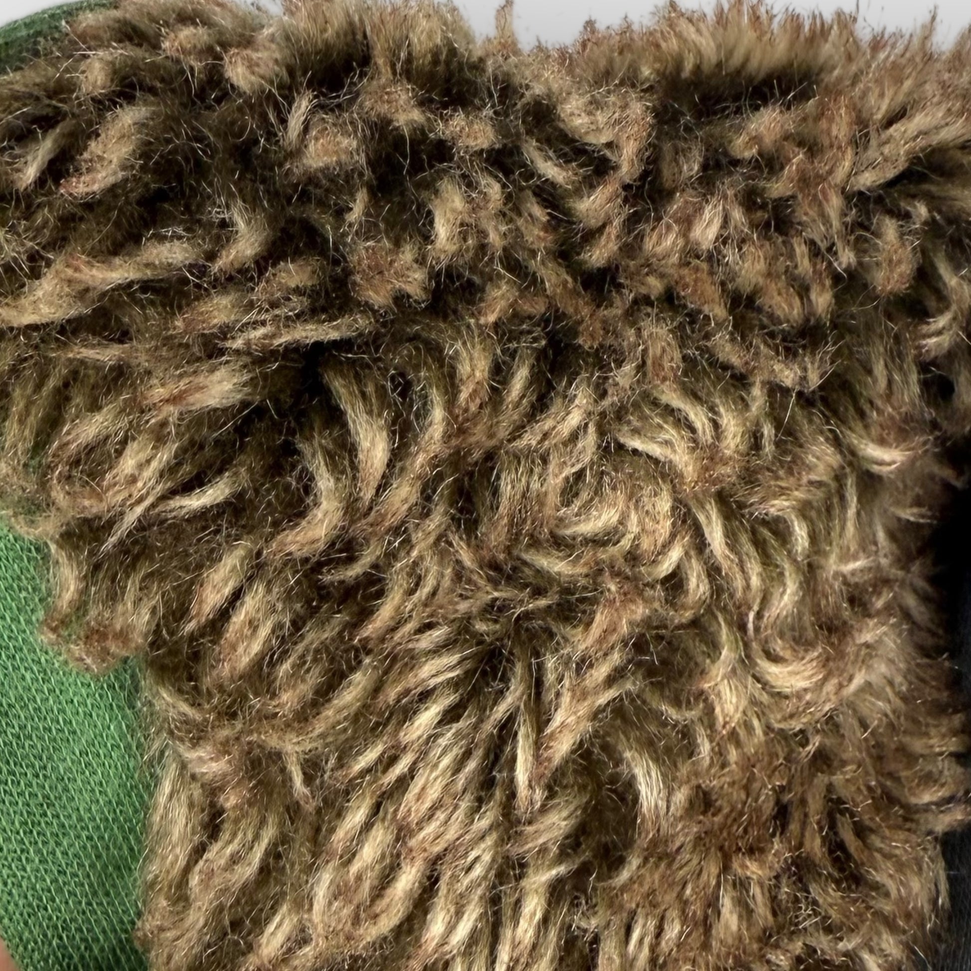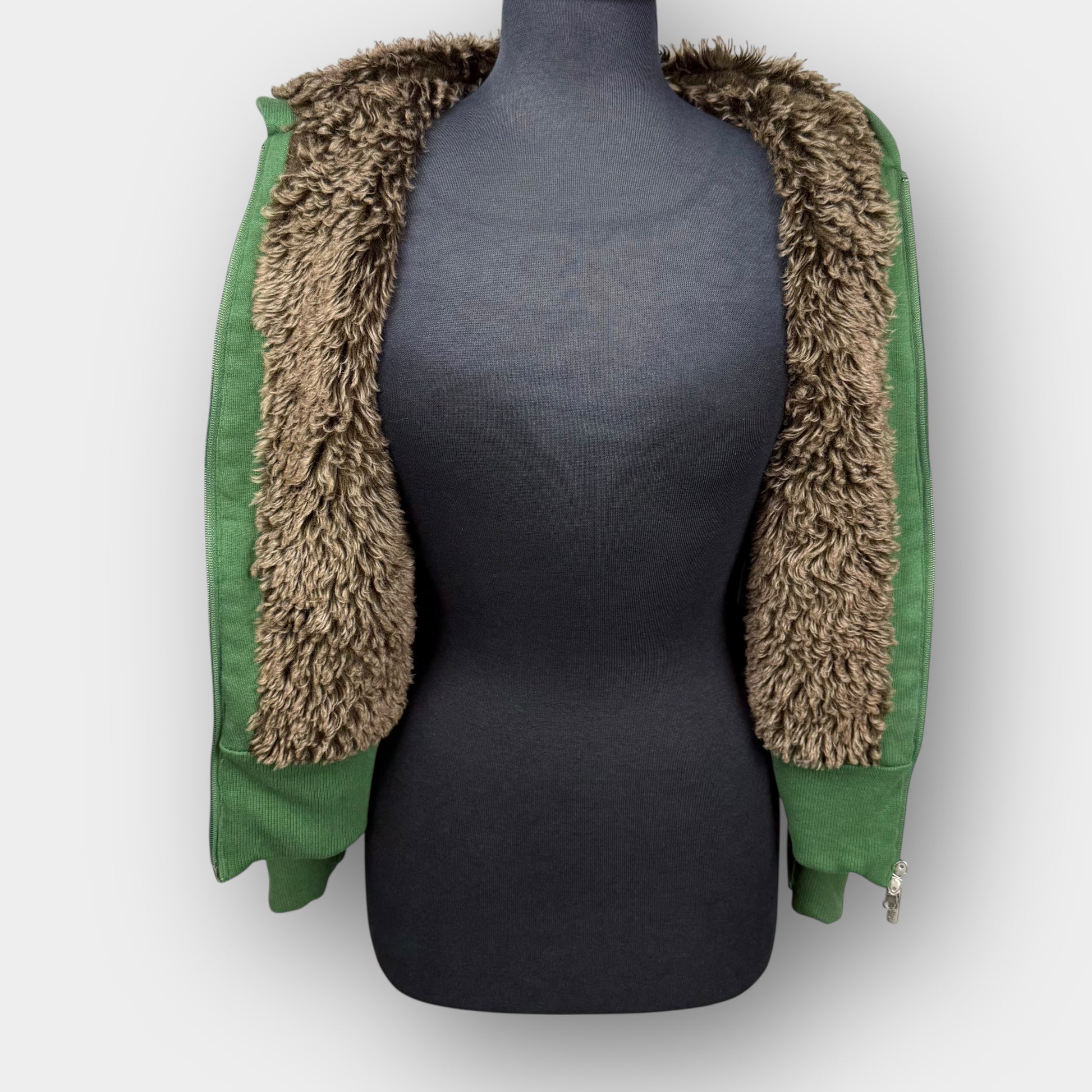 Urban Heritage zip-up hoodie in green with brown faux fur lining inside the hood and body. Features two front pouch pockets, ribbed cuffs and hem, and a full front zipper with branded pull. This is on the heavier side and there are a few tiny wear marks