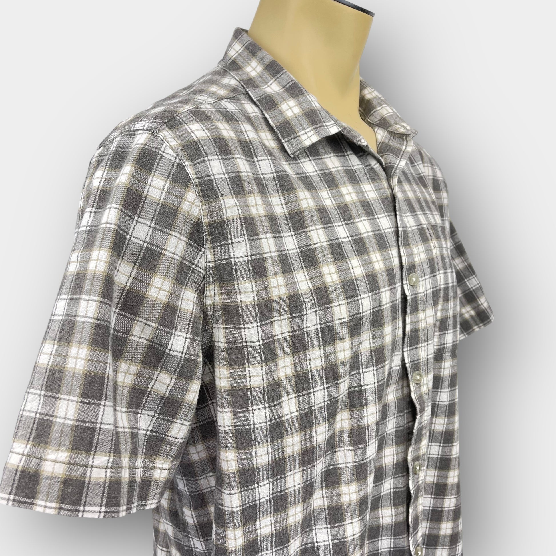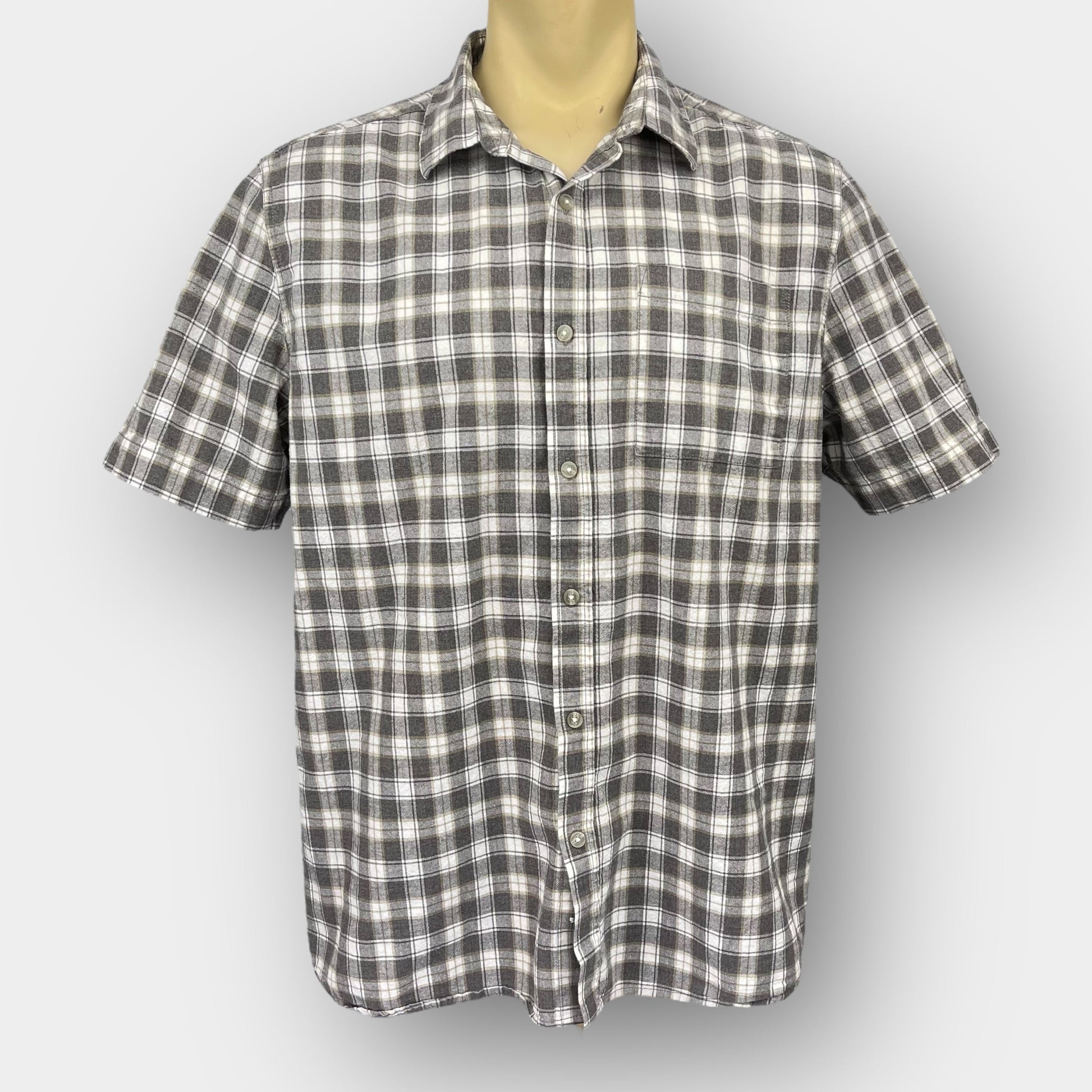 This T.N.L Mode men’s short sleeve button down shirt features a classic grey, white and olive plaid with a point collar, single chest patch pocket and a straight hem for easy layering; it fits like a 2XL