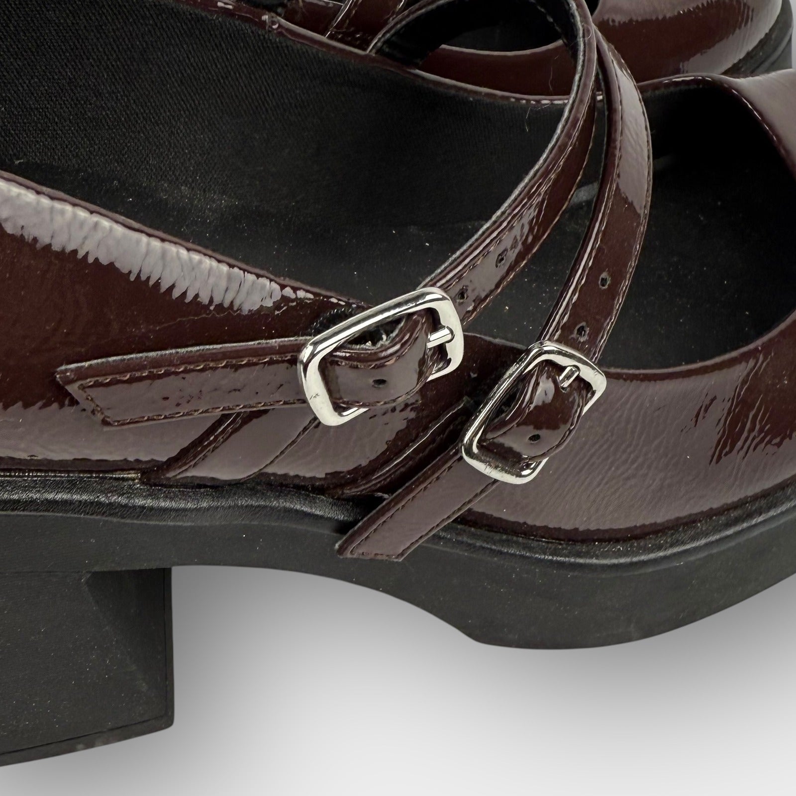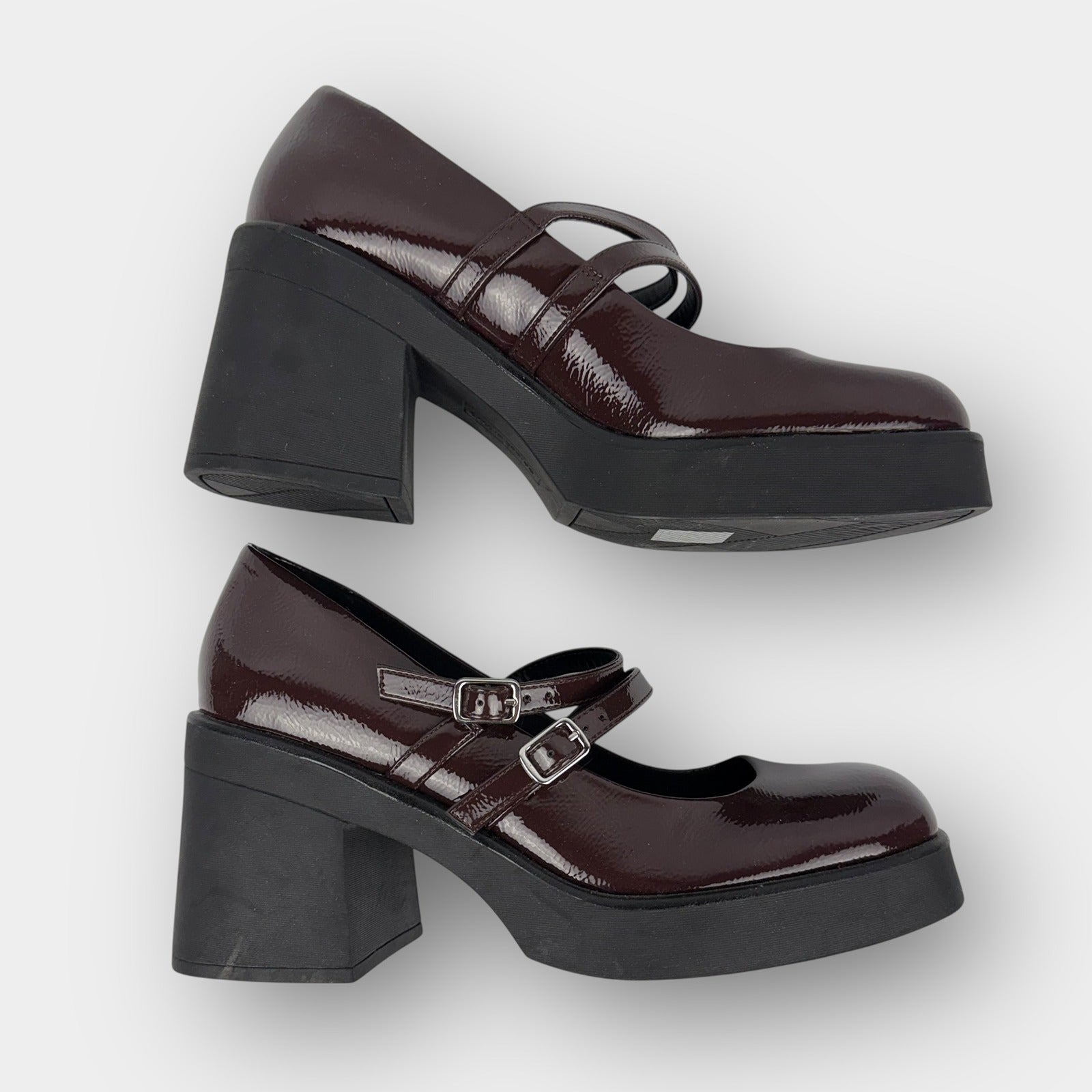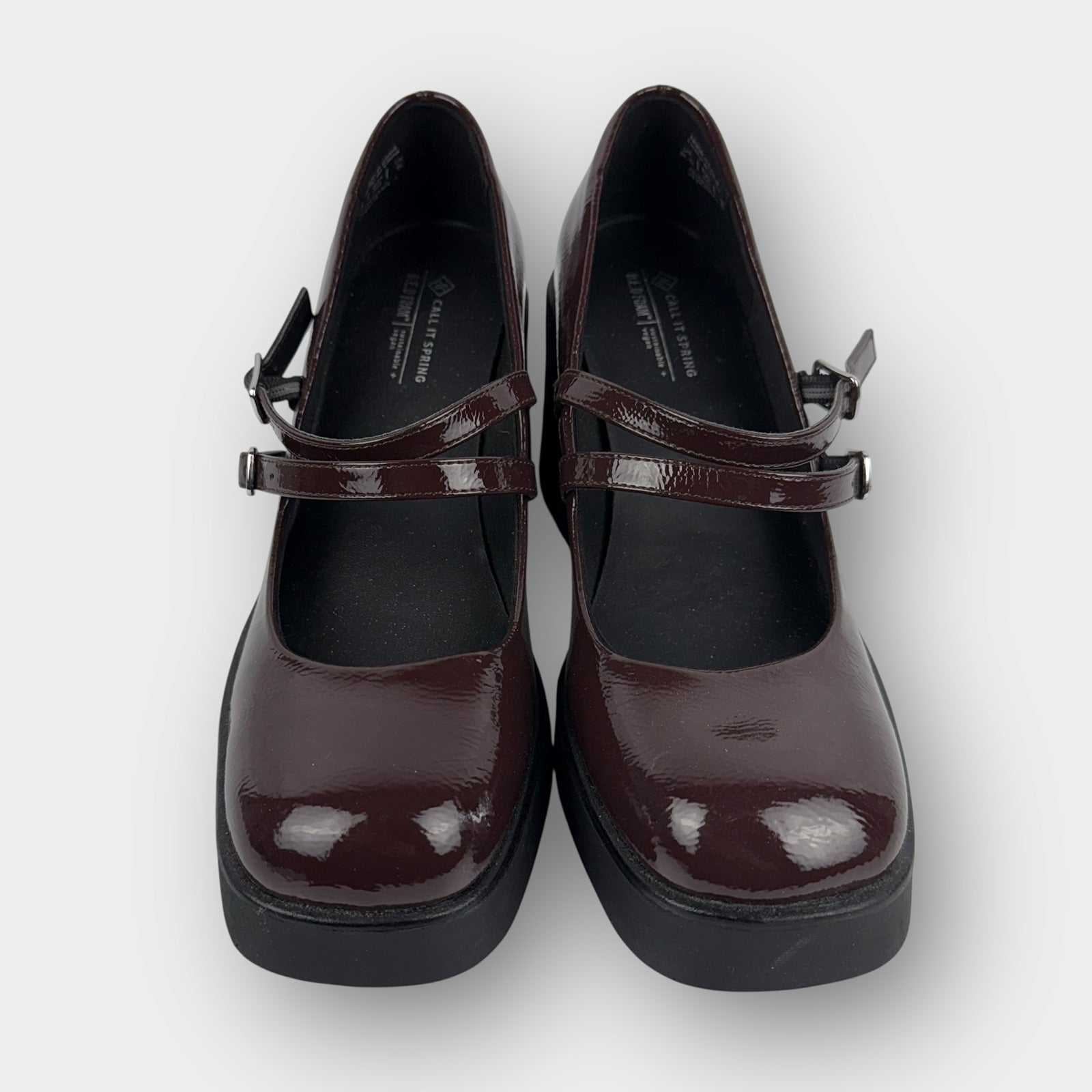 Call It Spring Mary Jane block heel shoes in burgundy patent vegan leather, styled with a rounded toe and double adjustable straps with silver buckles. Designed with a chunky 3.25" block heel and platform base for retro Y2K-inspired style. Finished with a square-edged sole and durable rubber outsoles