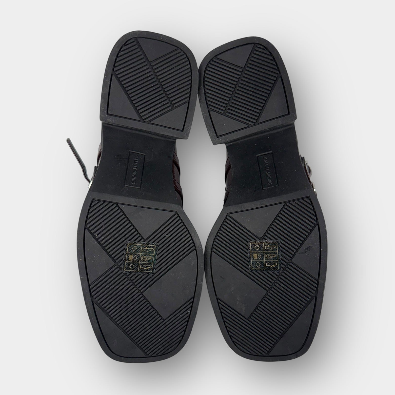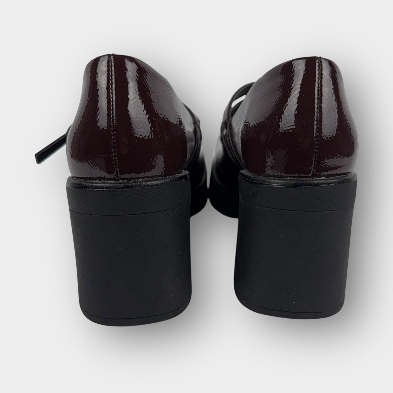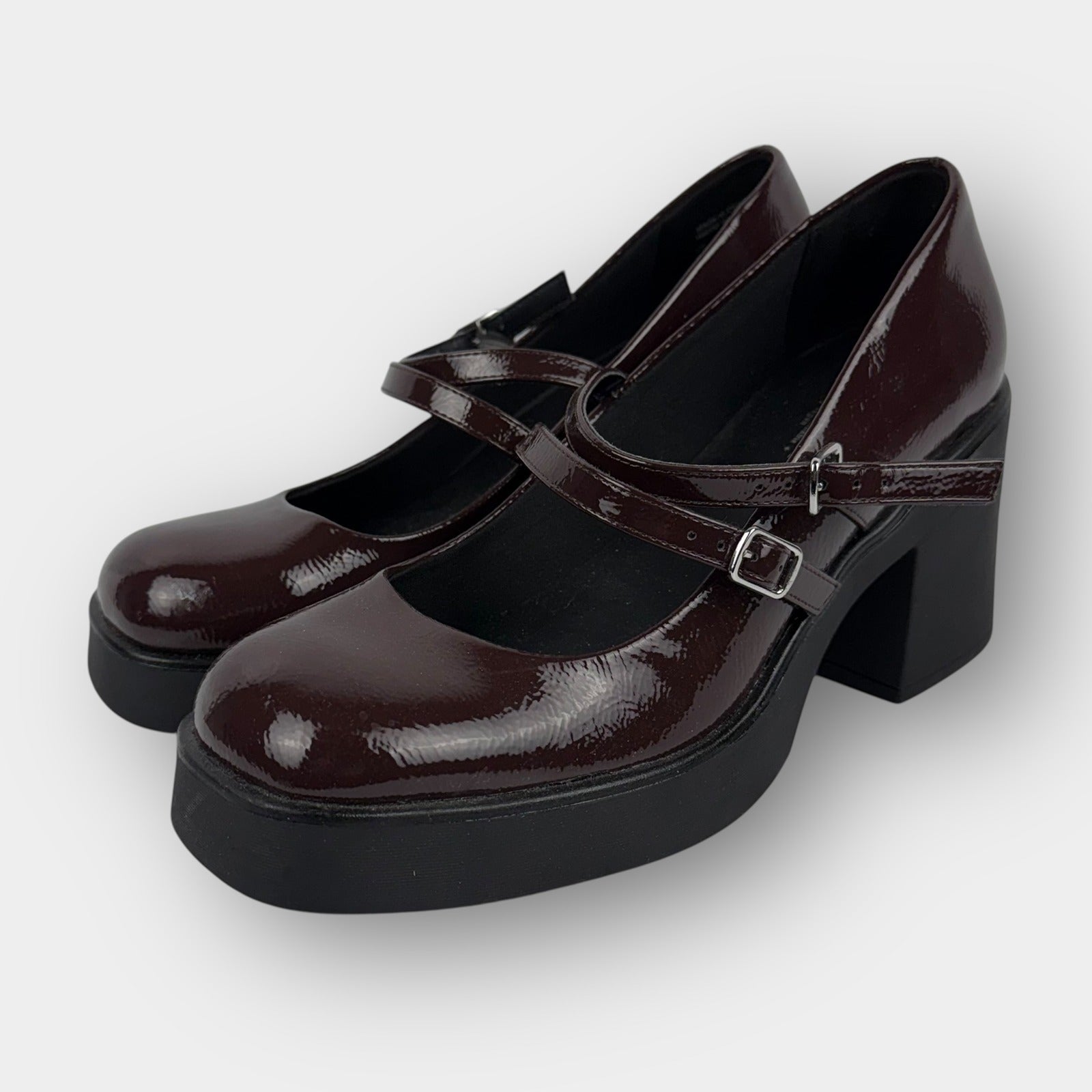 Call It Spring Mary Jane block heel shoes in burgundy patent vegan leather, styled with a rounded toe and double adjustable straps with silver buckles. Designed with a chunky 3.25" block heel and platform base for retro Y2K-inspired style. Finished with a square-edged sole and durable rubber outsoles