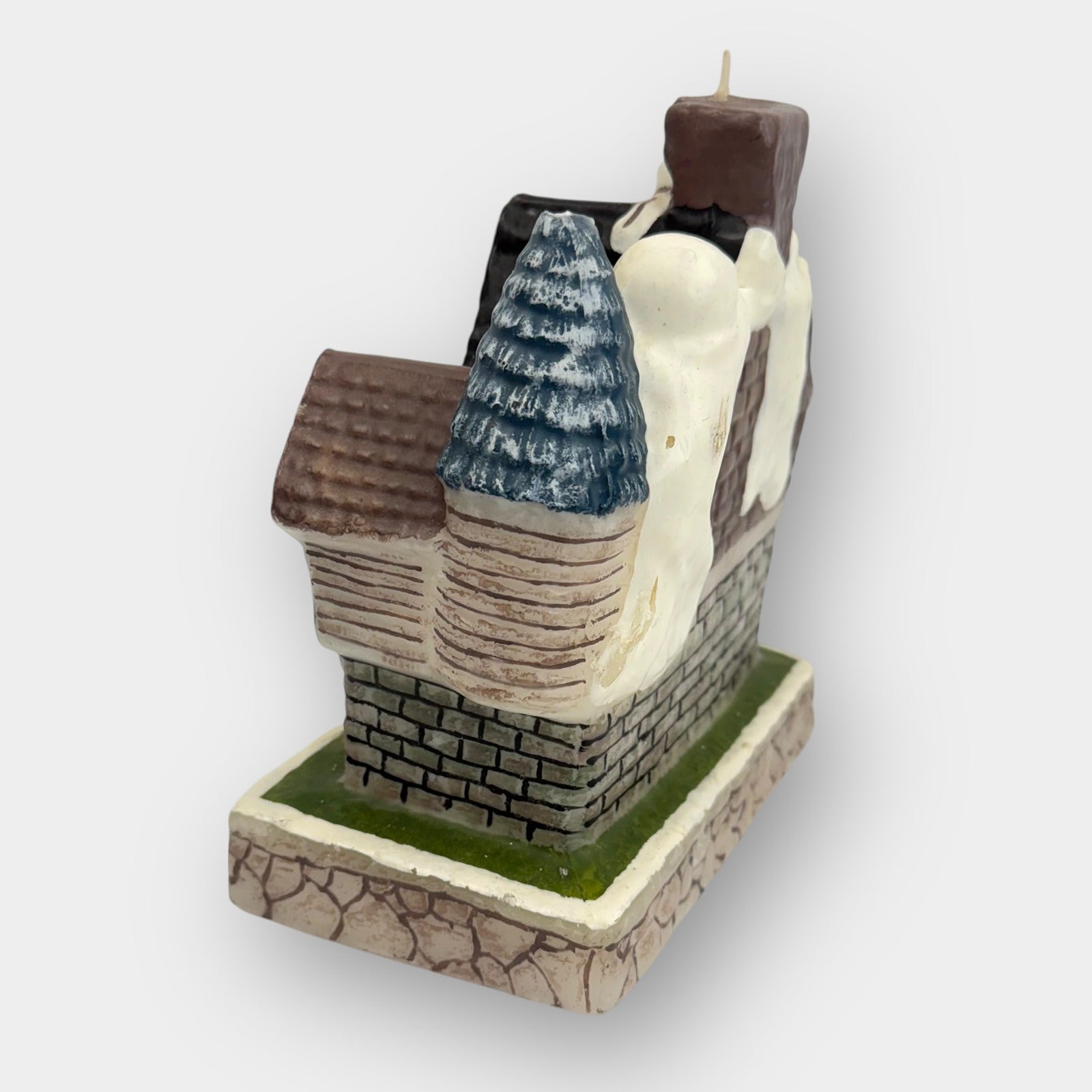 Vintage Halloween haunted house candle with molded ghosts, jack-o’-lanterns, and roof details. Unused wick, wax intact with minor surface wear consistent with age. Displays well as seasonal décor or collectible