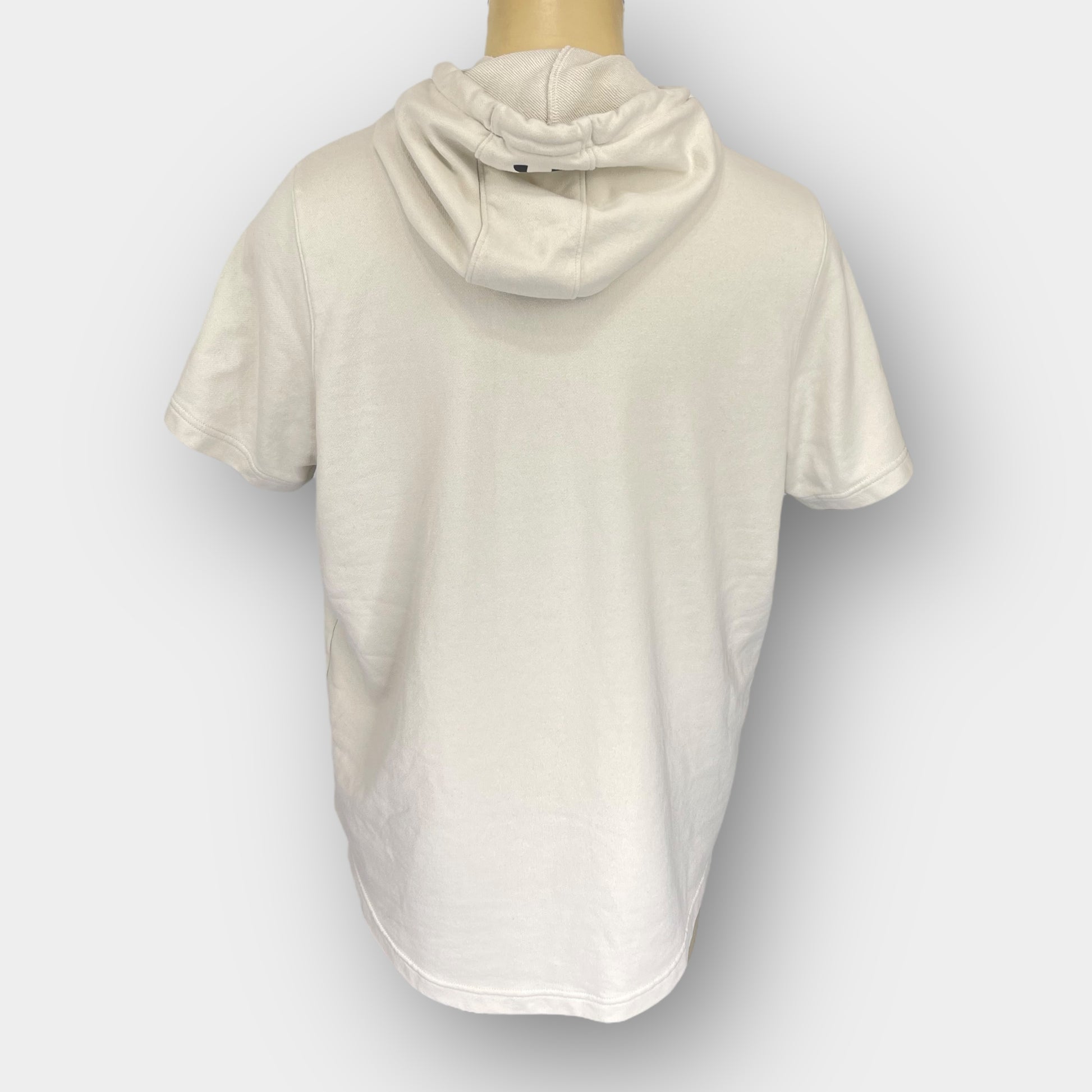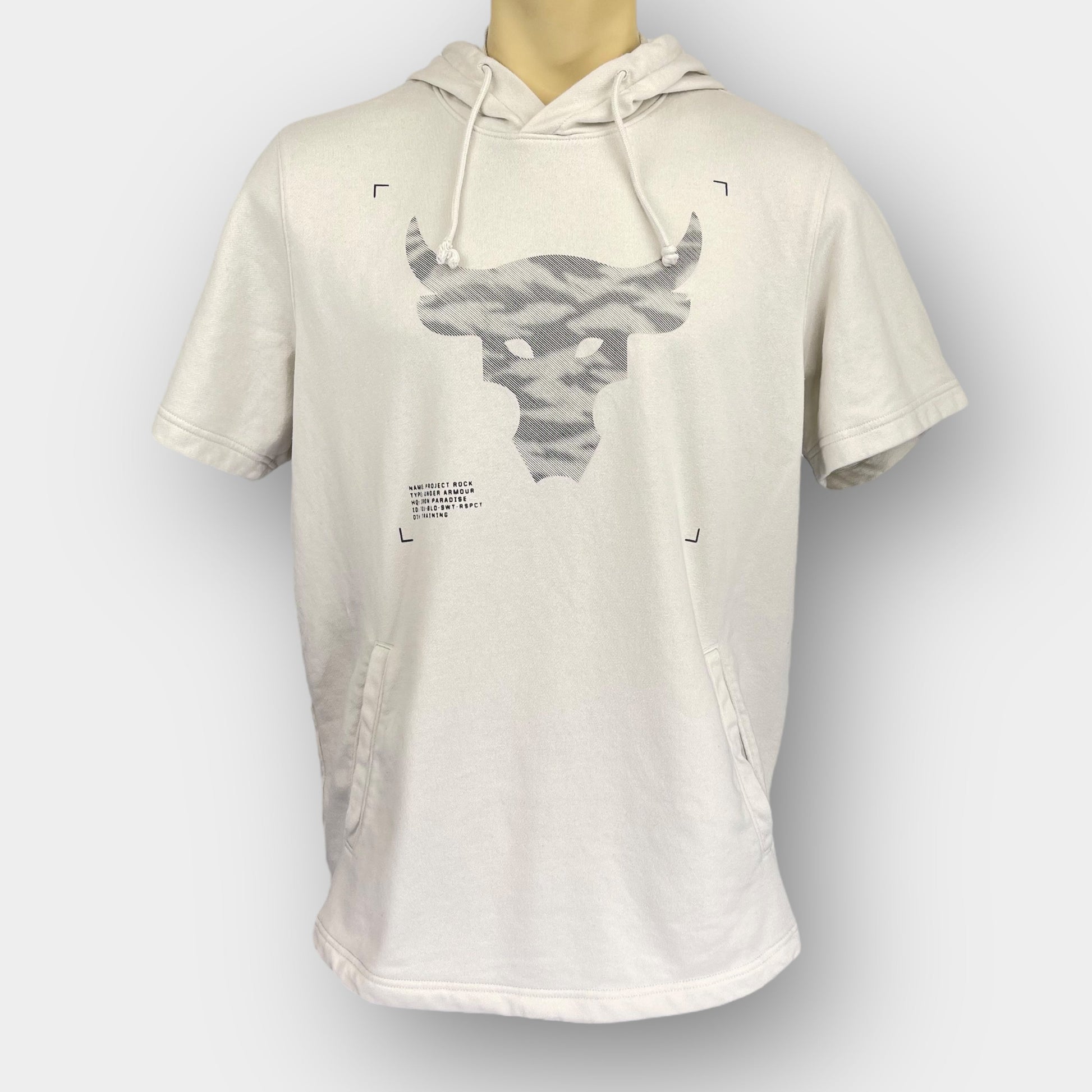 Under Armour Project Rock hoodie t-shirt in white with short sleeves, drawstring hood, and grey bull logo graphic on the chest, slash pockets, relaxed fit and lightweight