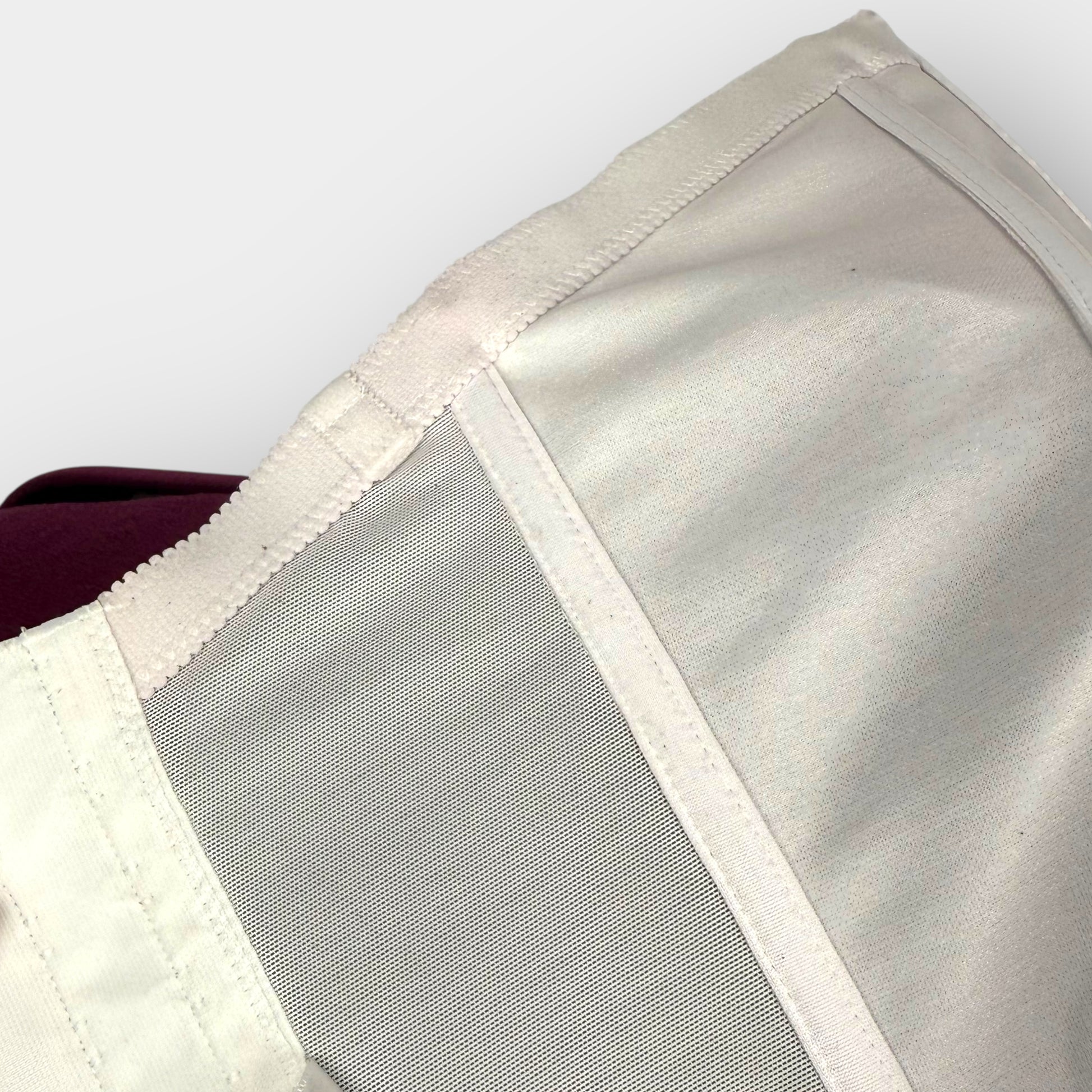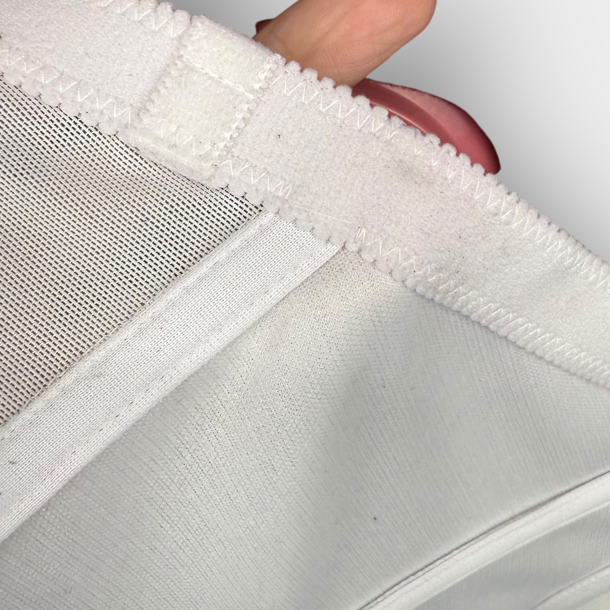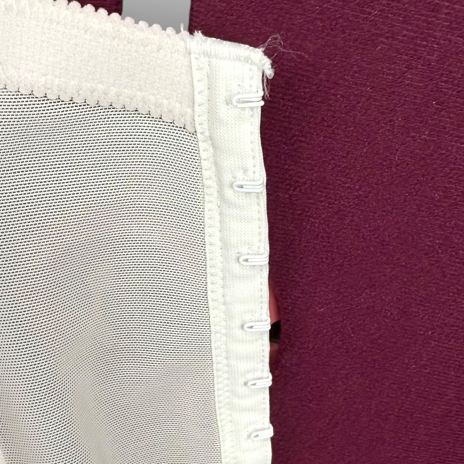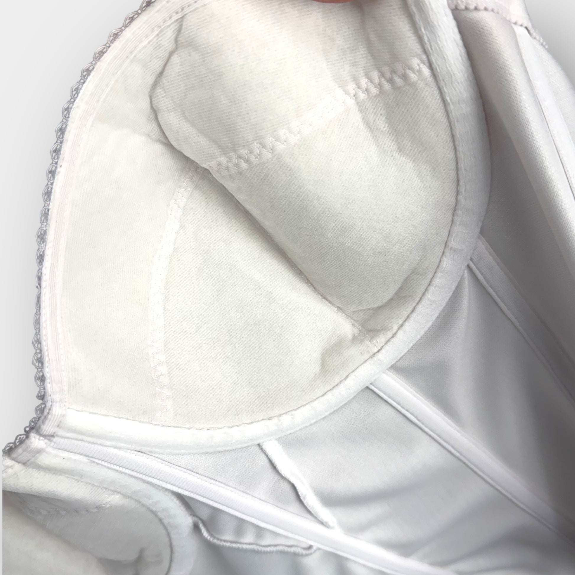 Elegant Dominique bustier in white with a subtle pink hue in the fabric. Features a strapless sweetheart neckline with a small floral applique and rhinestone detail at the center. Structured with boning for support and a smooth silhouette, with a longline waist design and hook-and-eye back closure. Includes lightly padded cups and mesh back panels for comfort. Size 36D. In very good condition structurally, but has the tiny black mark and faint pink tint as pictured