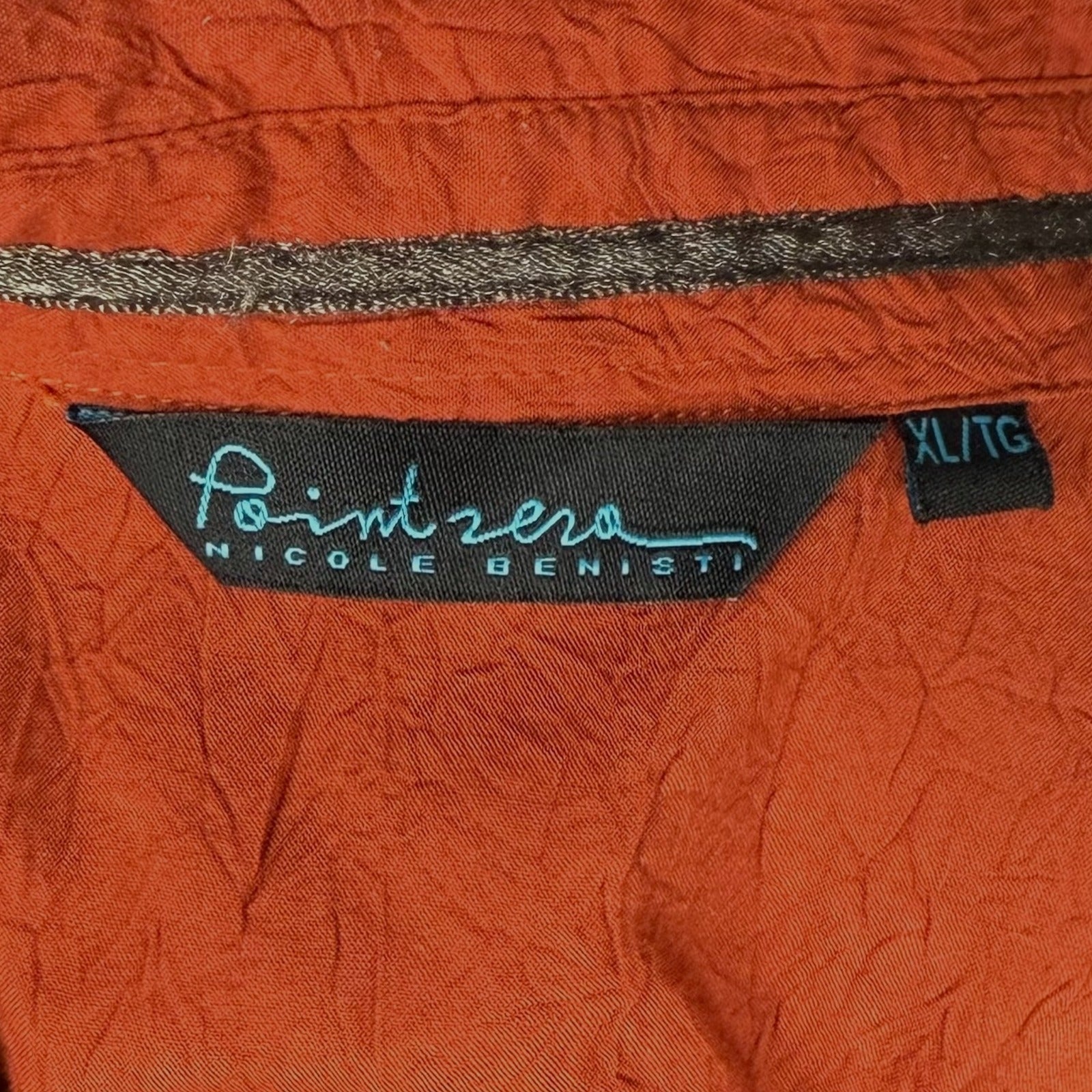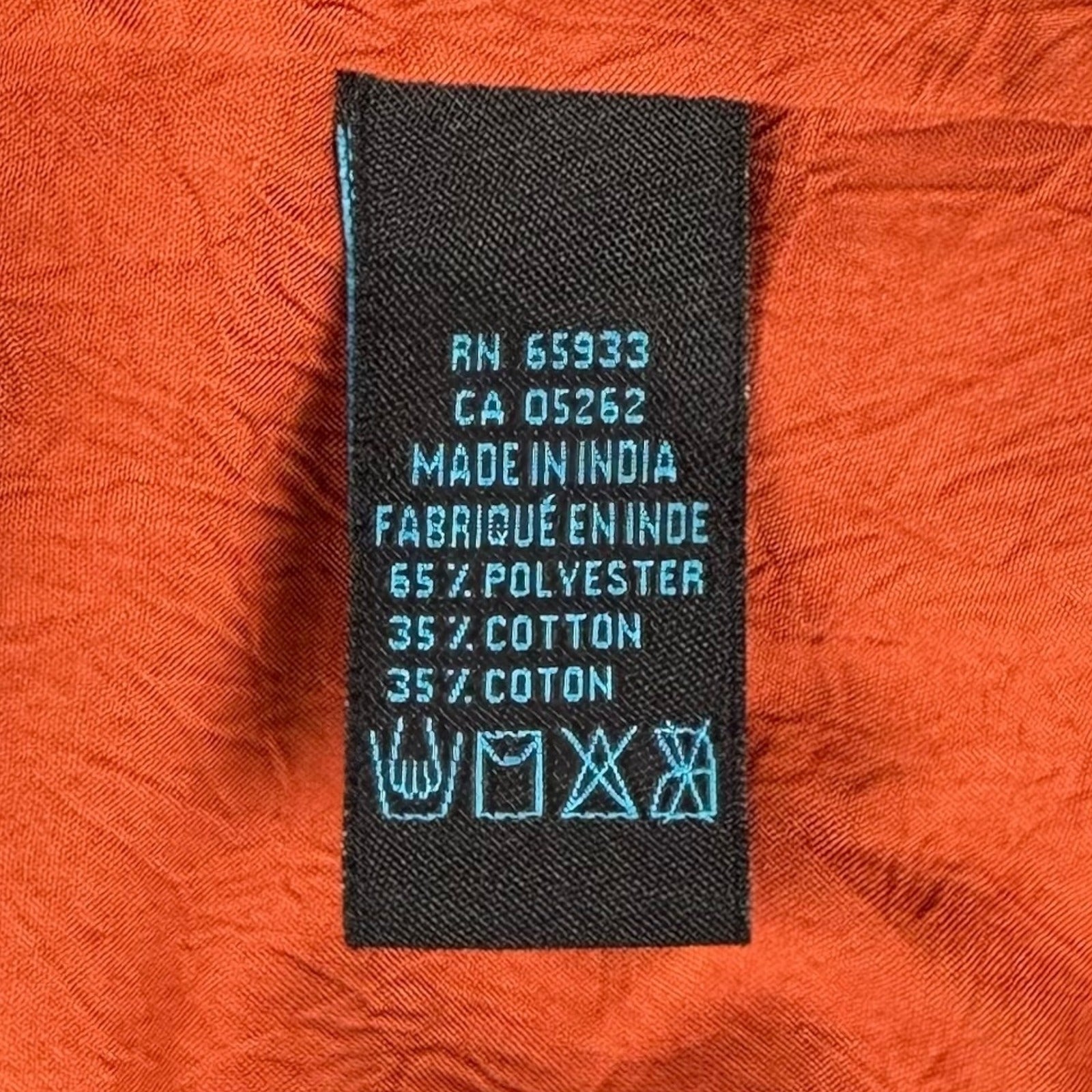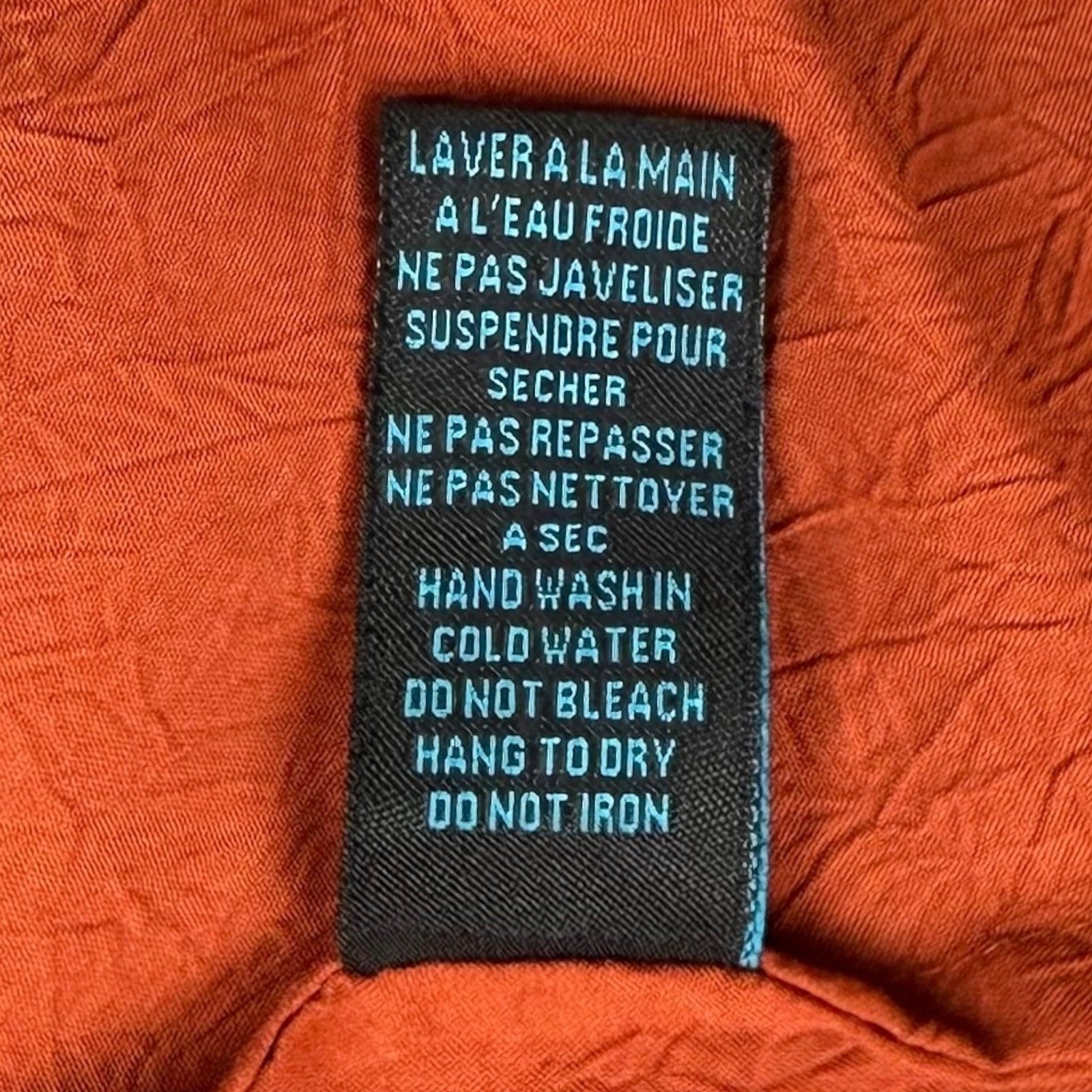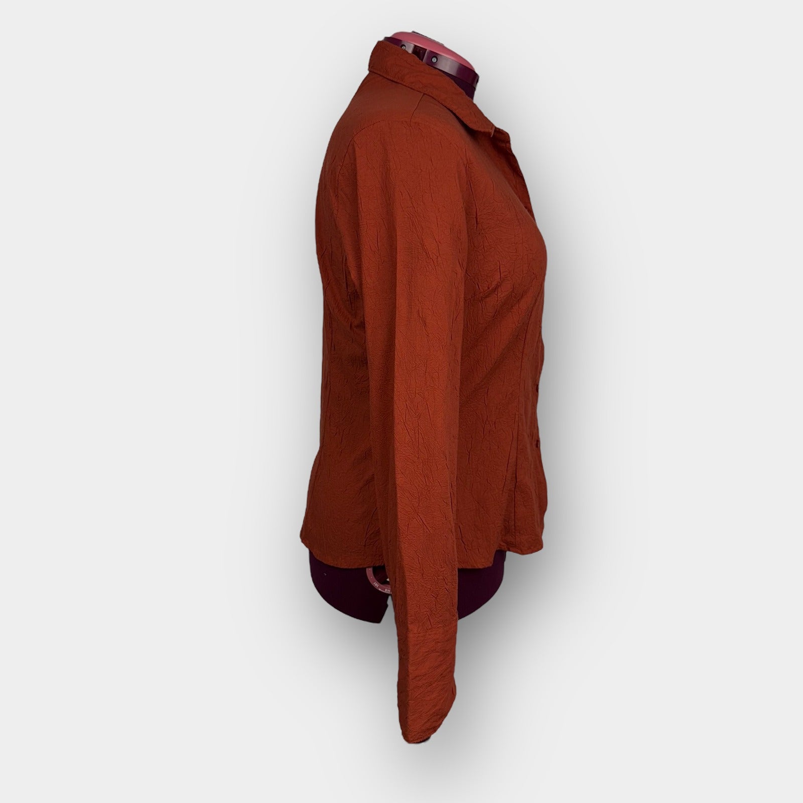 This blouse features a crinkle texture with a button-front closure, collared neckline, and long sleeves finished with double button cuffs. A single embroidered floral motif decorates the front, adding contrast against the solid body. Slightly fitted through the waist with a curved hemline. Please note that the colour may not appear exactly as it does in photos