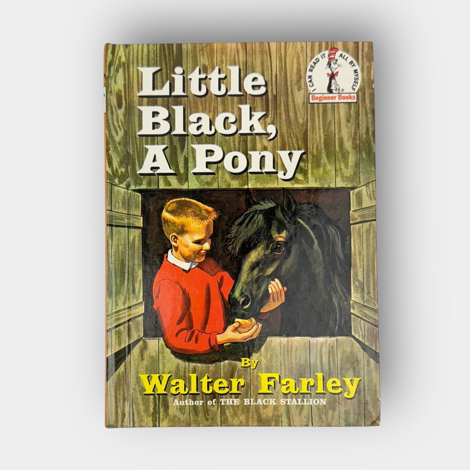 Classic hardcover children’s book Little Black, A Pony by Walter Farley with illustrations by James Schucker, part of the Beginner Books series. The book features a stable-themed illustrated cover and orange hardback boards. Normal shelf wear present, but binding is intact and pages remain clean overall