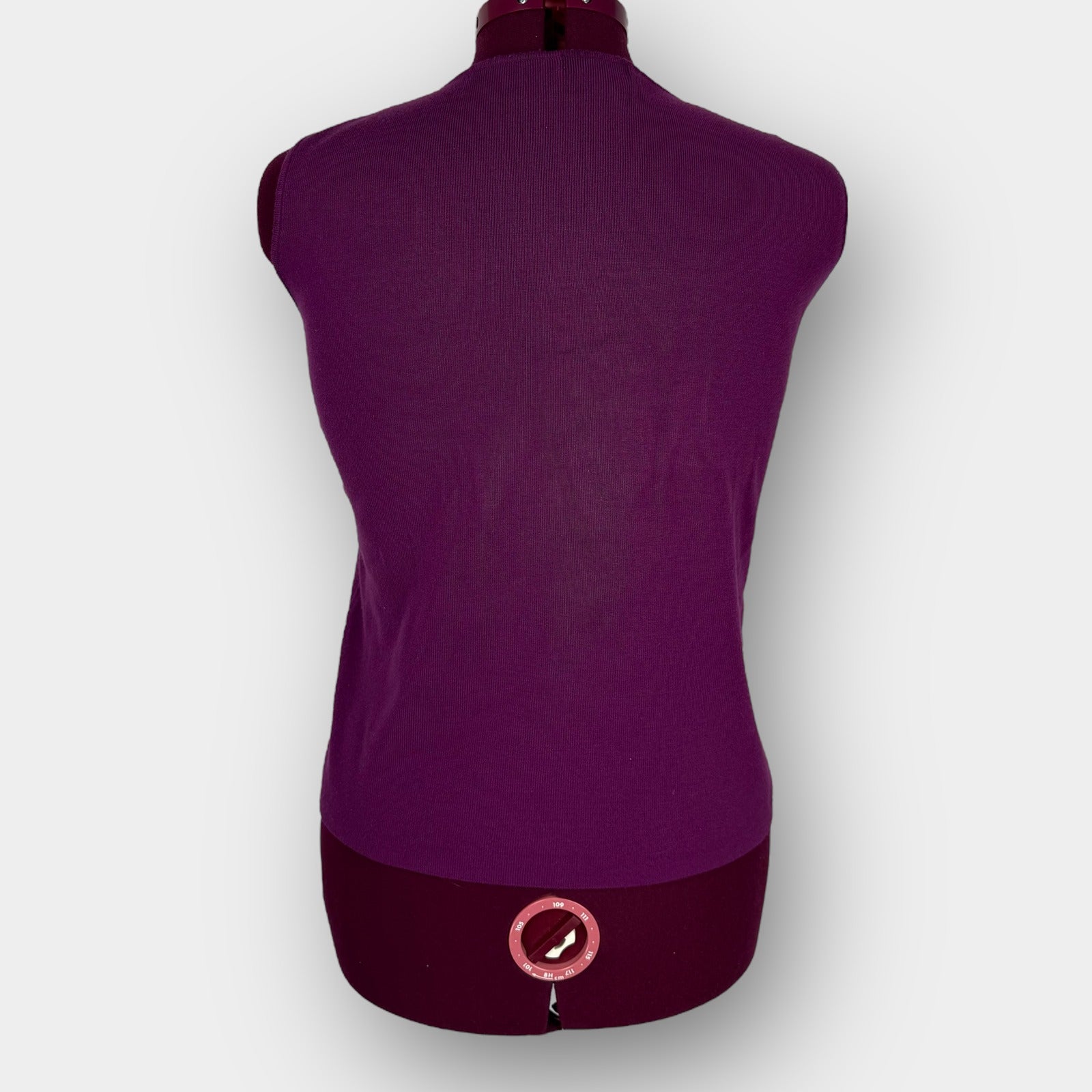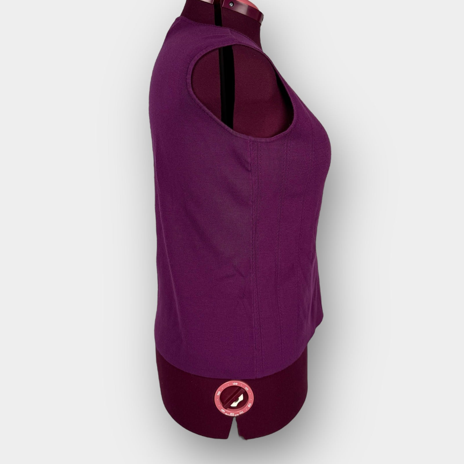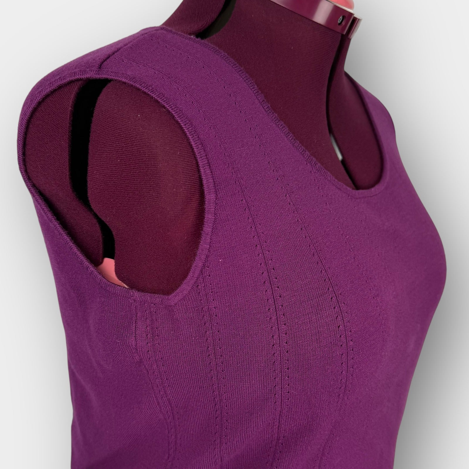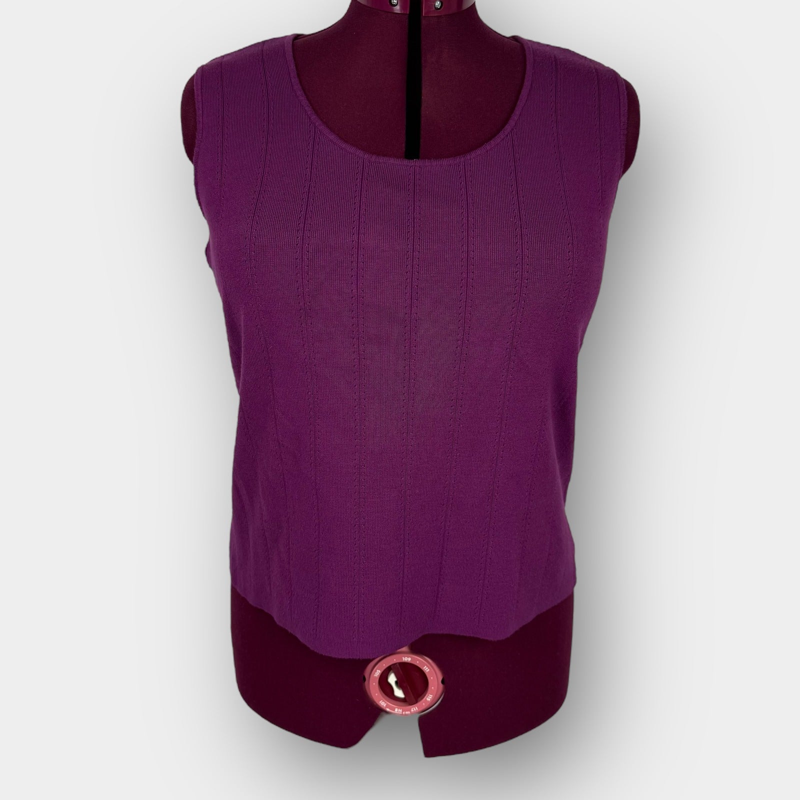 Sleeveless knit tank with scoop neckline, vertical rib-style stitched pattern on the front, and a straight hem. Made from a rayon blend with some wash wear visible