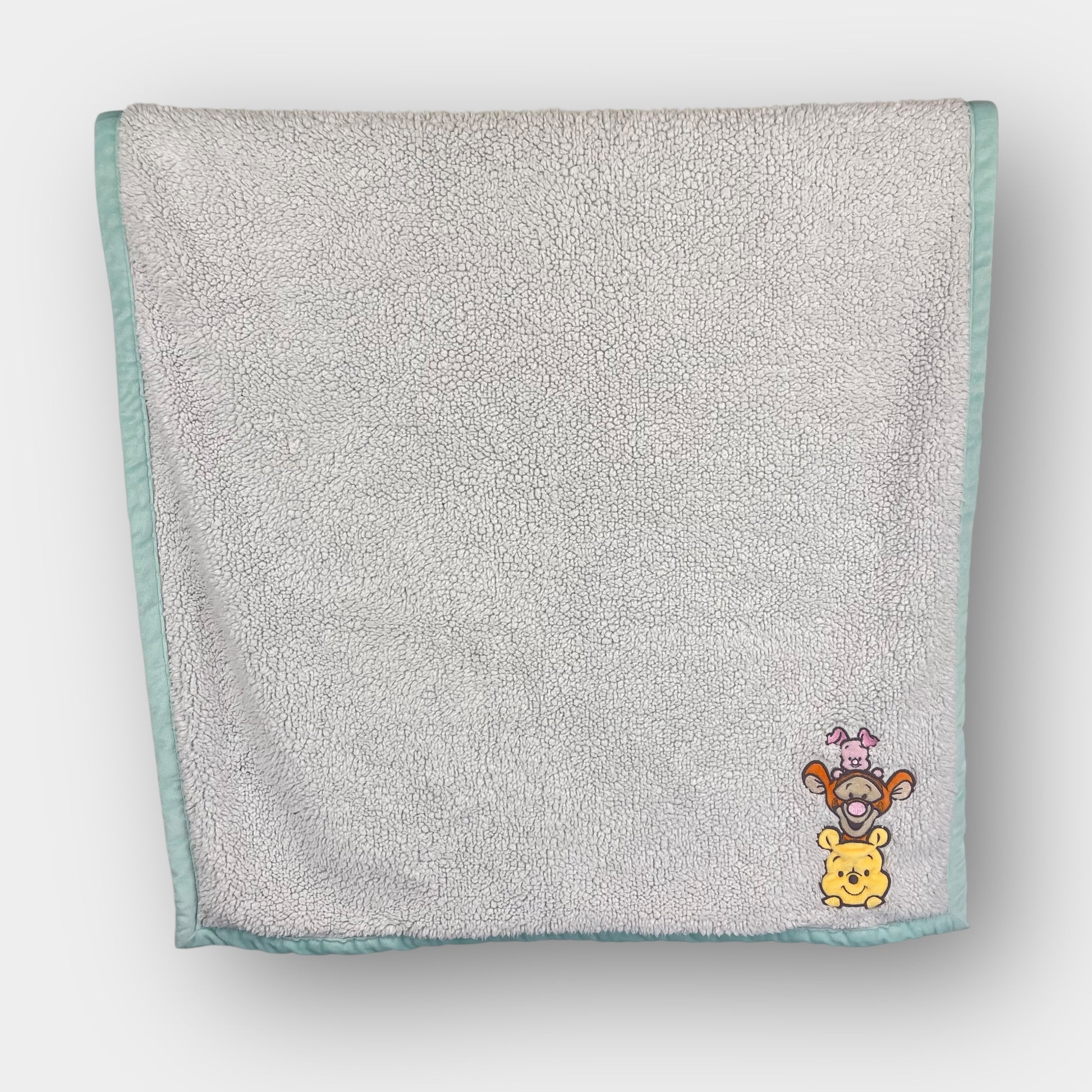 Disney Baby Winnie the Pooh Sherpa Blanket features a plush white sherpa front and mint green velour reverse with satin trim edging and an embroidered corner motif of Pooh, Tigger and Piglet. Gently used; a few small bits of stick/debris are caught in the sherpa pile (most can be picked out with tweezers)
