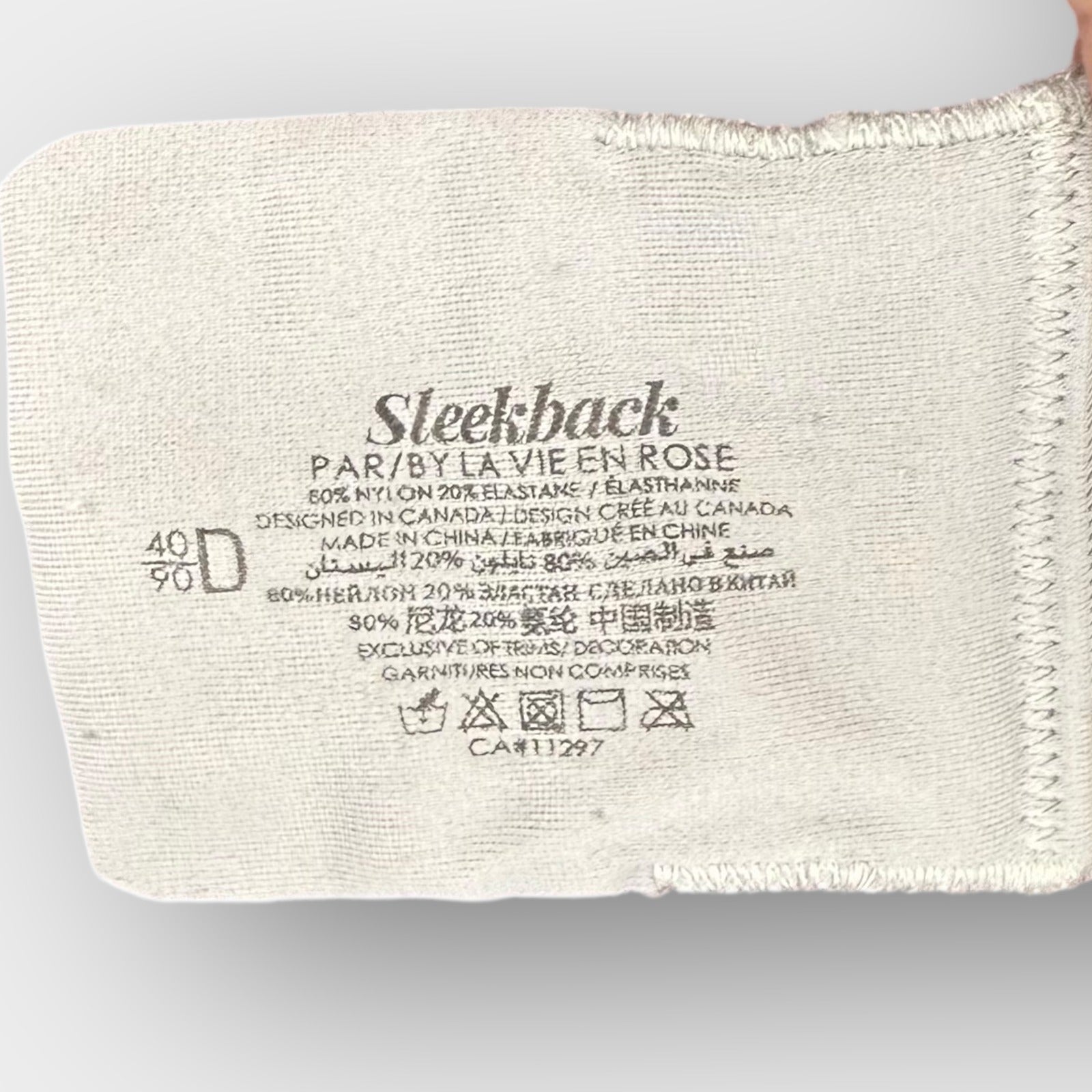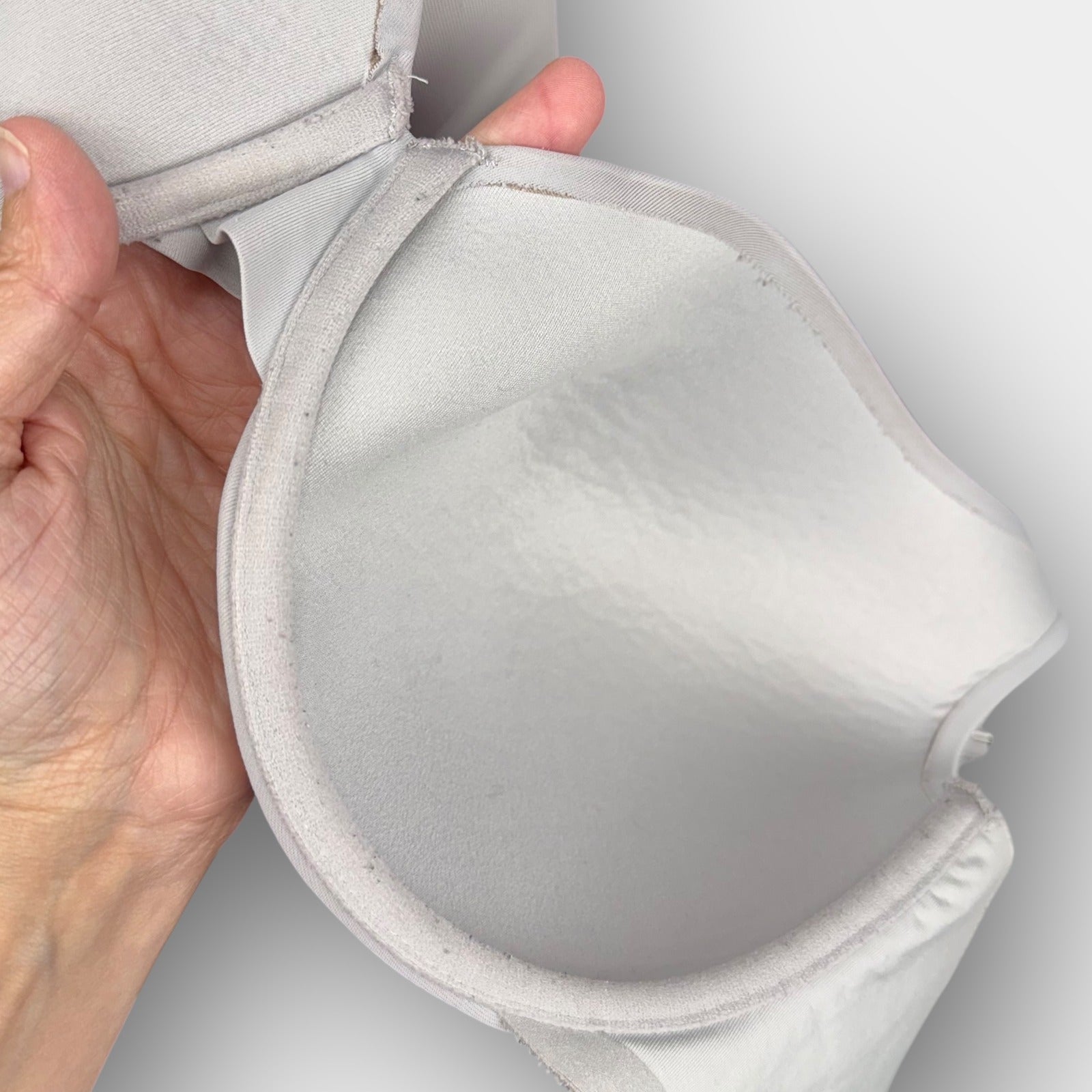 Lightly padded Sleekback bra with smooth molded cups, adjustable straps, and triple hook closure at the back. This shows signs of wear and pilling
