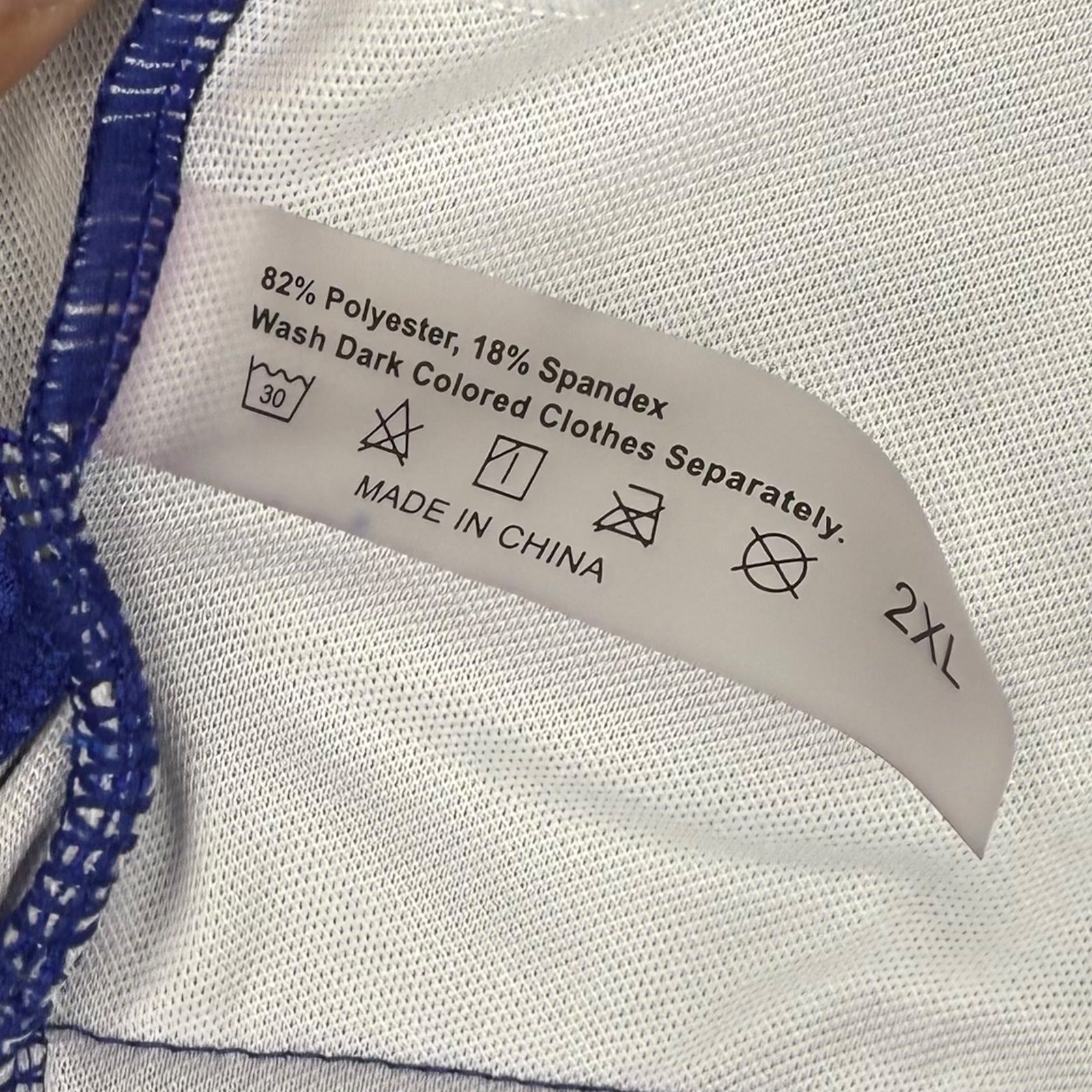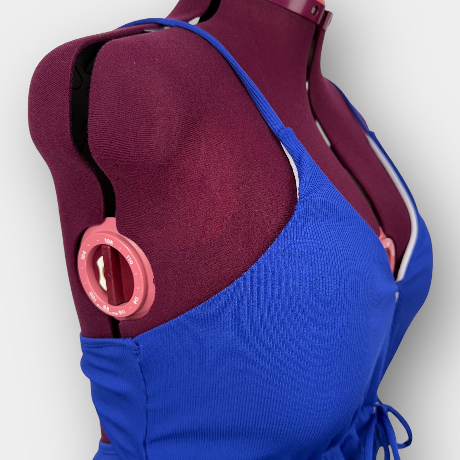 One-piece swimsuit in vibrant blue with ribbed stretch fabric, featuring a front cutout detail with tie closure, ruffled peplum waist, and crisscross lace-up back straps