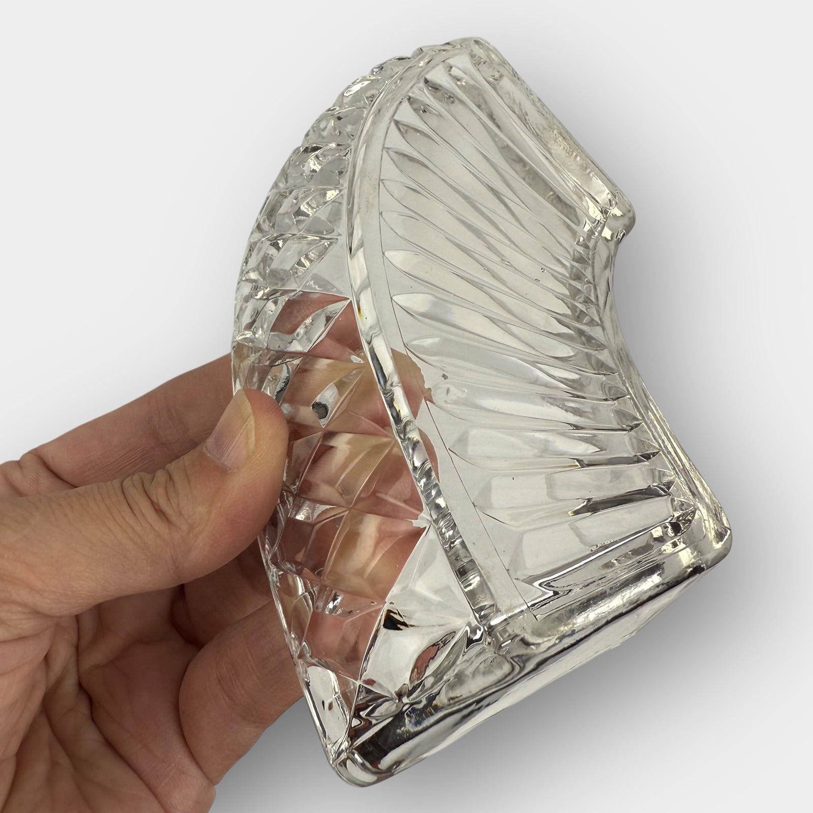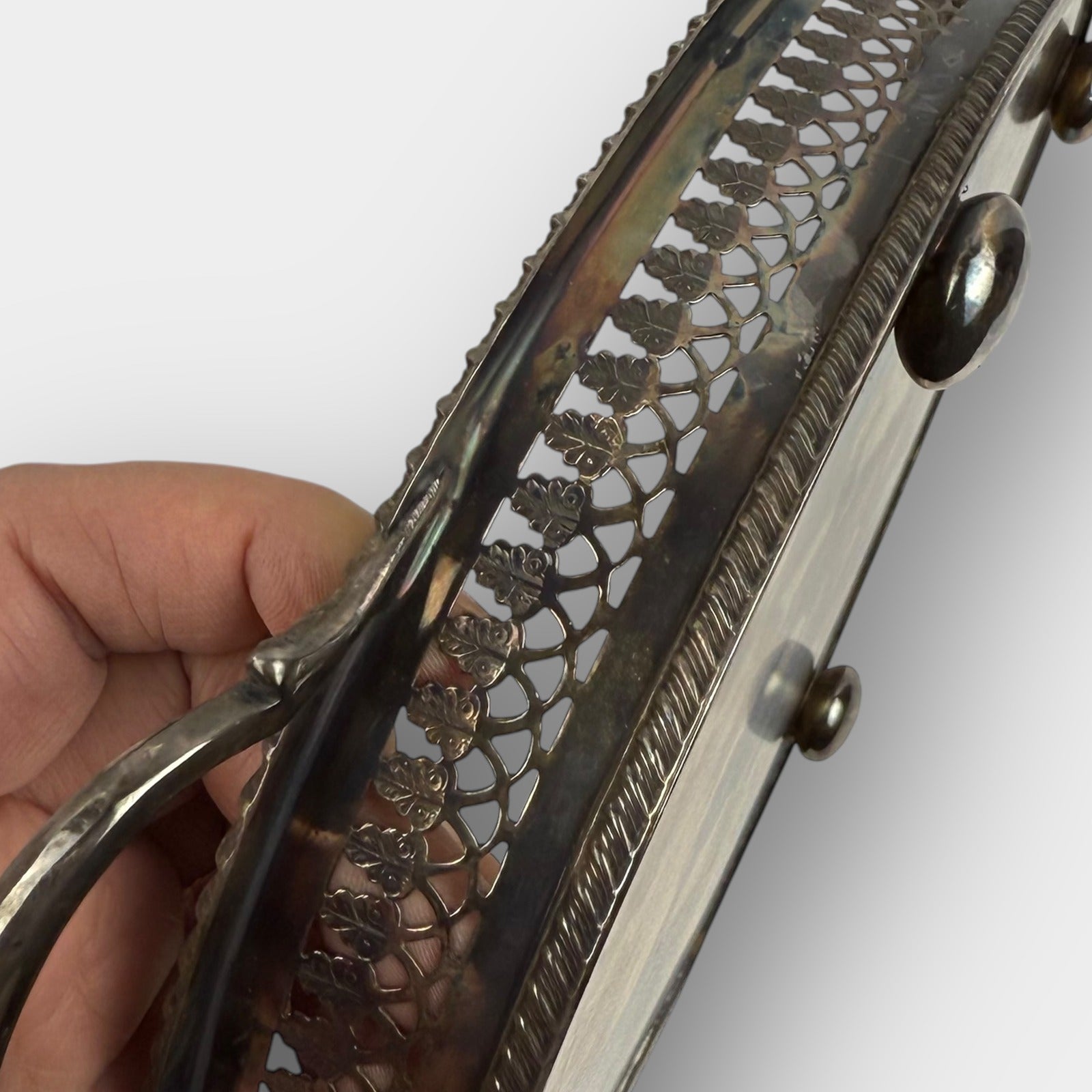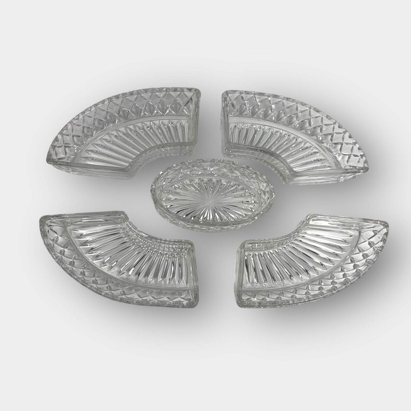 Vintage silverplate relish tray with five removable pressed glass inserts, featuring a divided oval design with four crescent dishes and one round center dish. The tray has ornate cutout edging, side handles, and ball feet