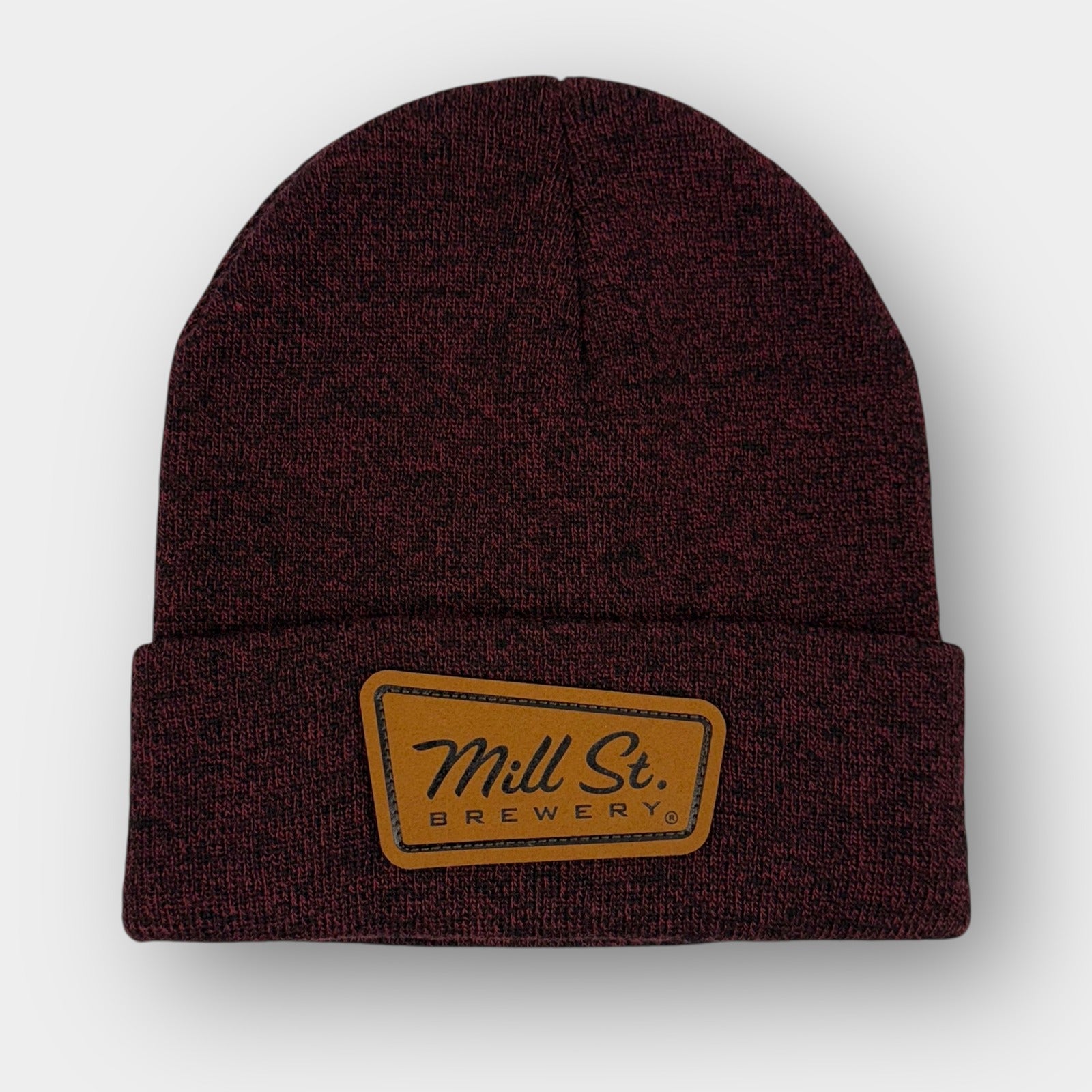 Knit beanie hat with folded cuff featuring Mill St. Brewery logo patch at the front