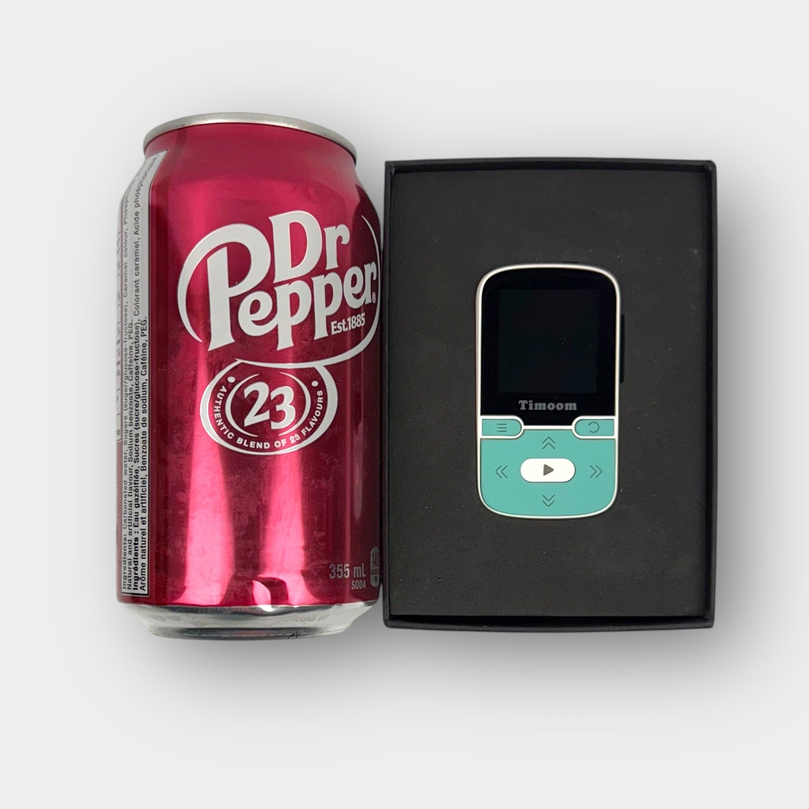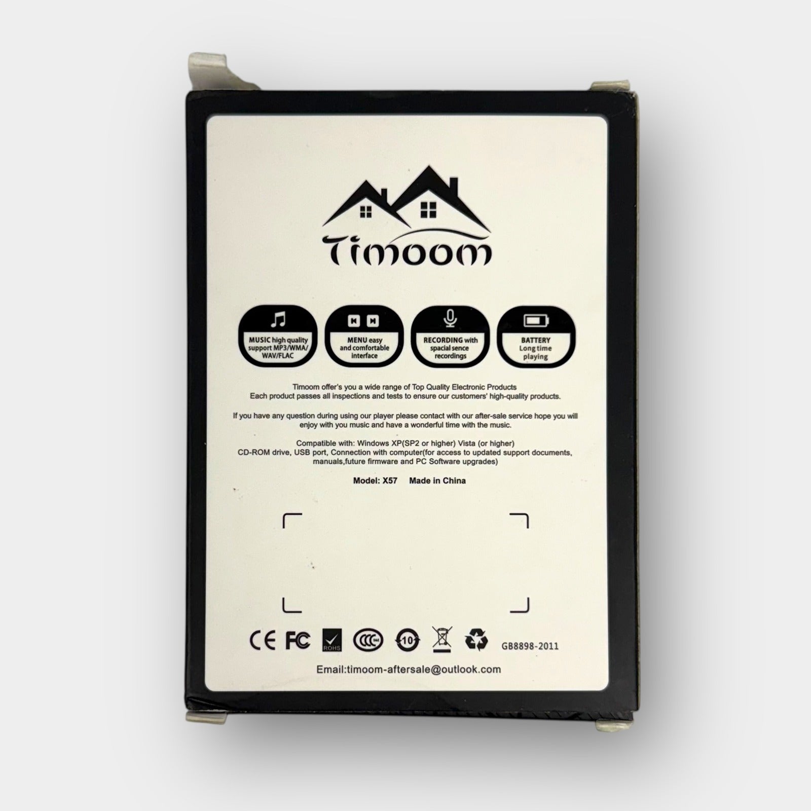 Compact Timoom digital music player with built-in voice recording, pedometer, and rechargeable battery. Includes USB charging cable, user manual, and original box. Lightweight design with simple navigation buttons and color display