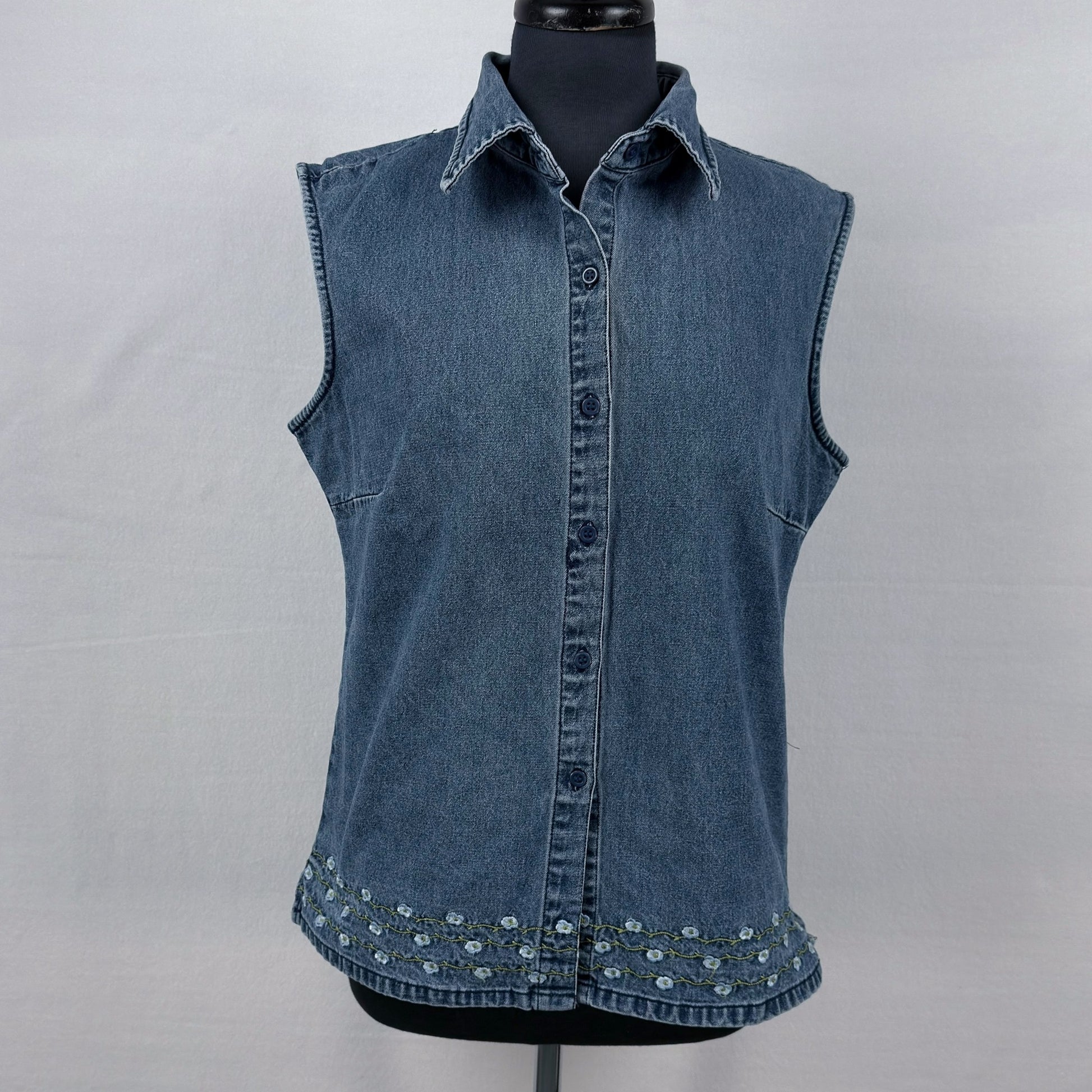 • Sleeveless denim button front shirt/vest with pointed collar