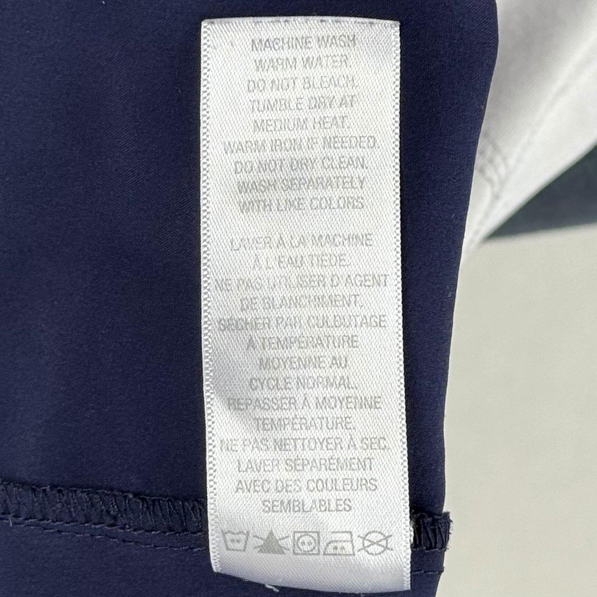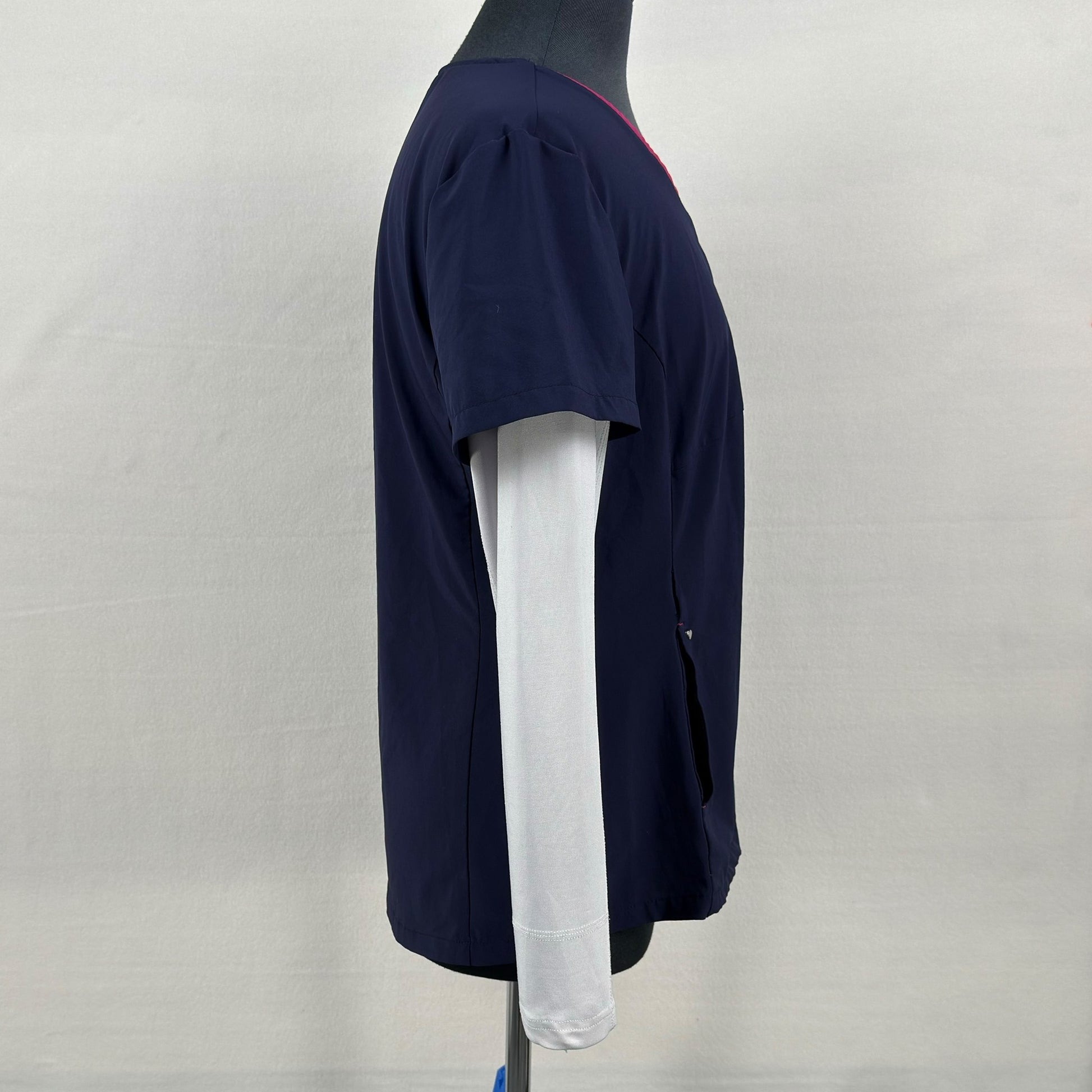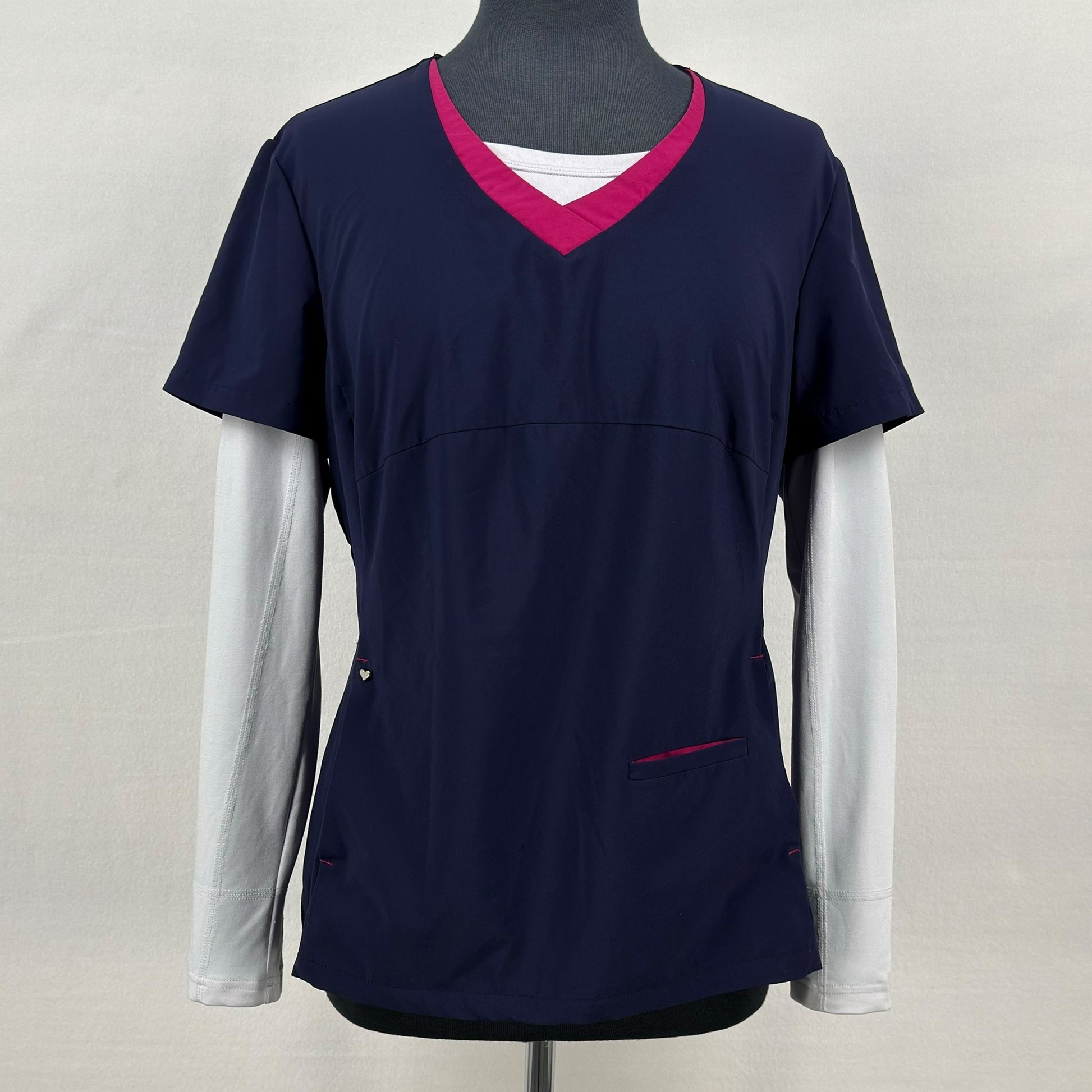 • Navy V-neck scrub top with contrast pink neckline