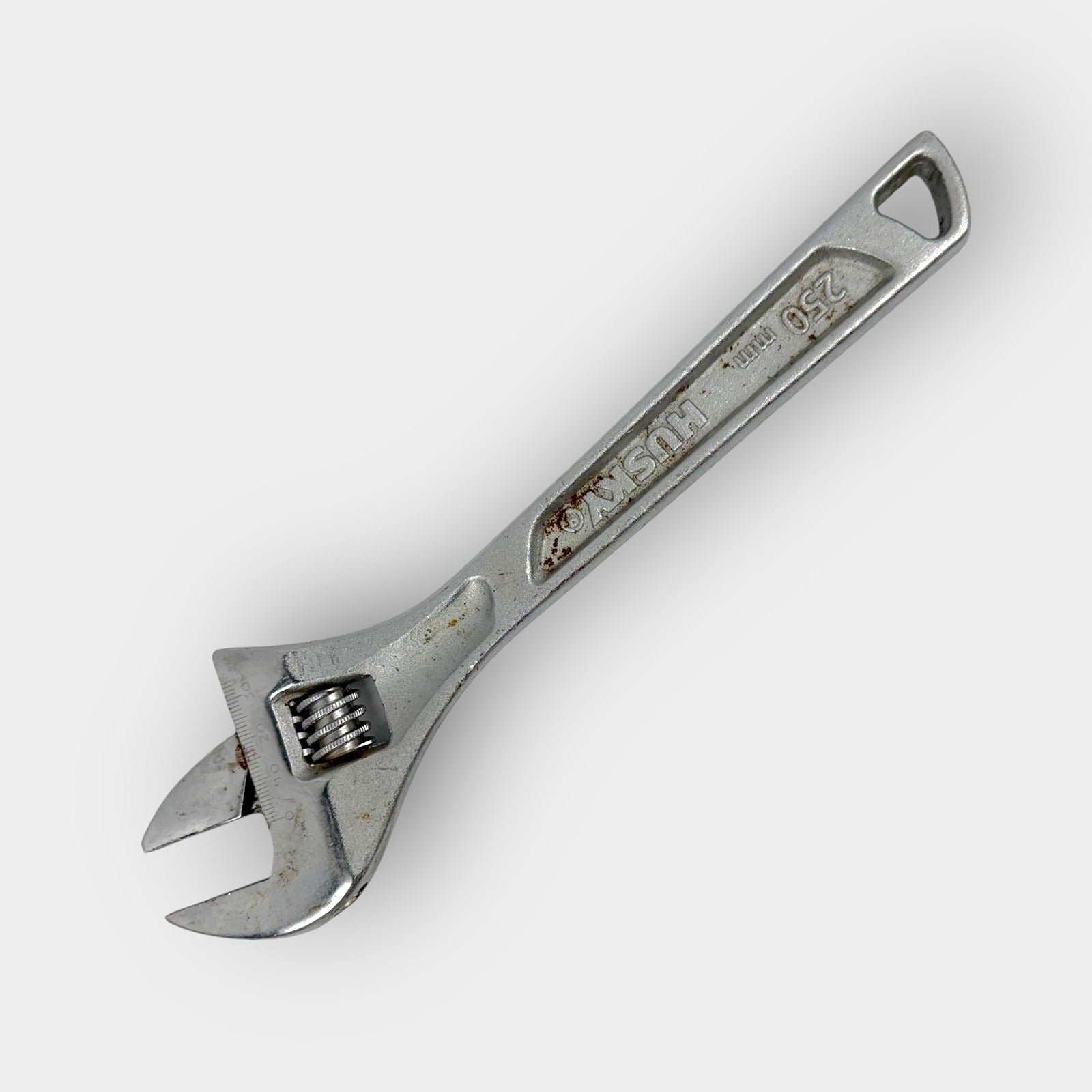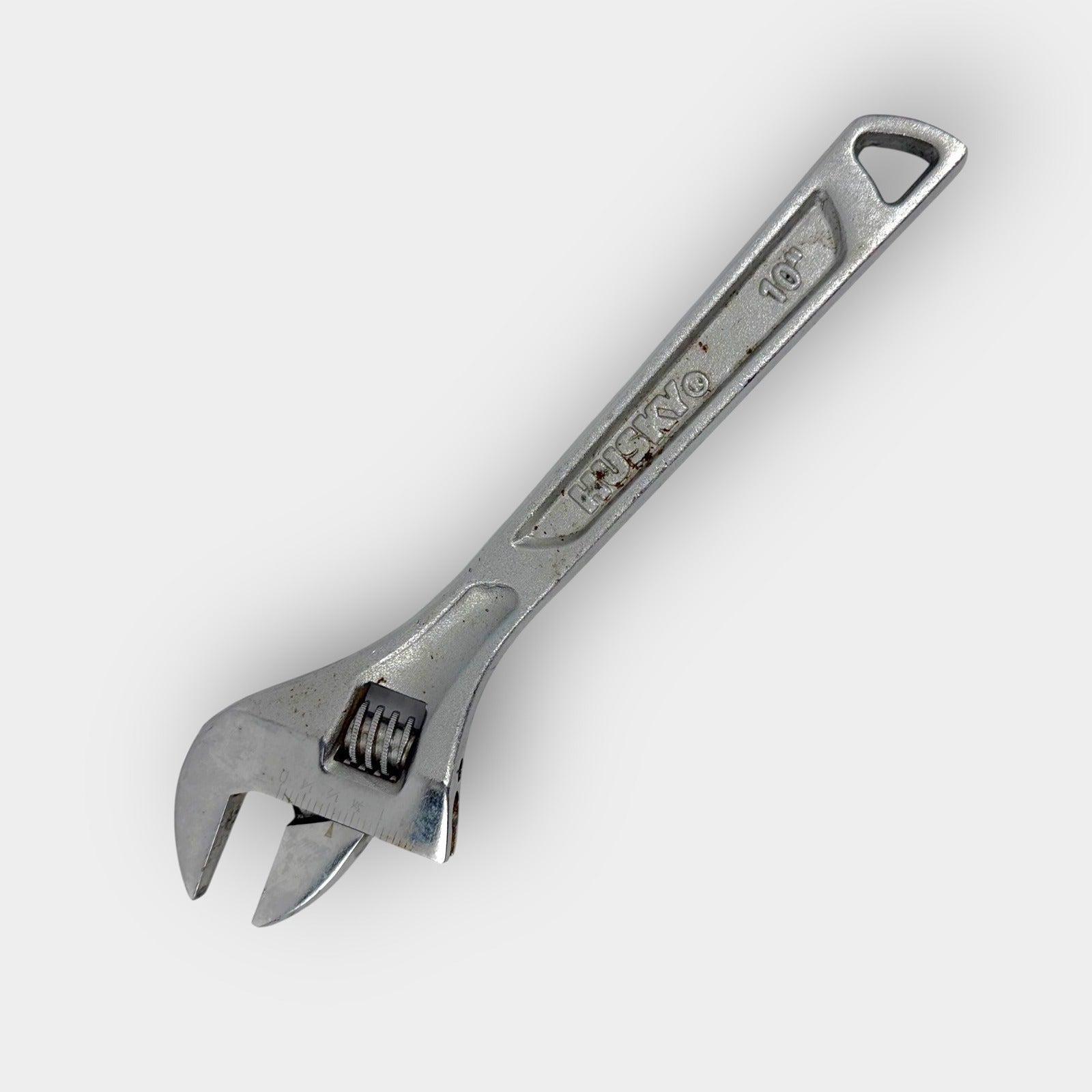 Husky 10-inch adjustable wrench with chrome finish and etched scale along the jaw for reference. Features a wide opening jaw with knurled worm gear for smooth adjustment, tapered handle with hanging hole, and durable forged steel construction