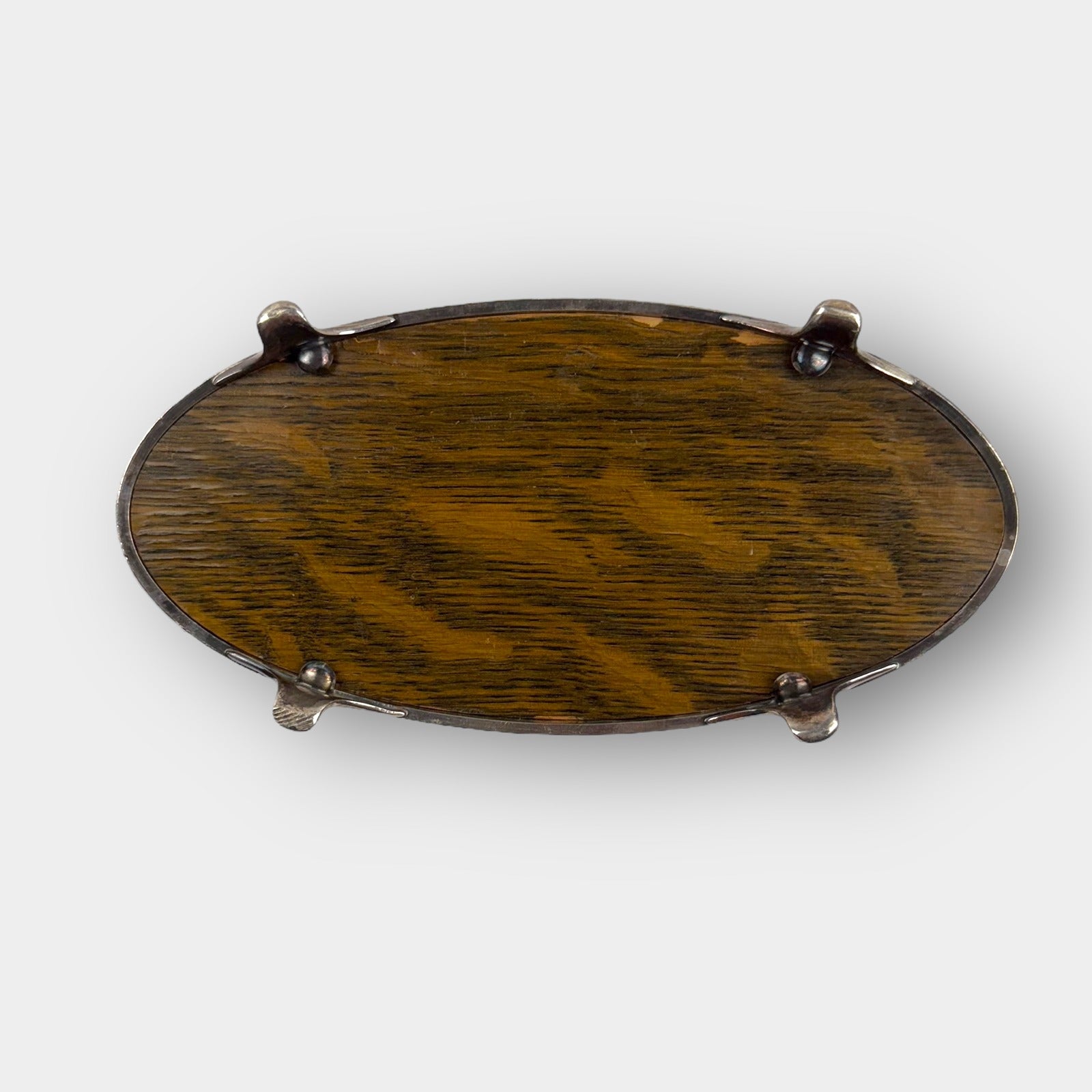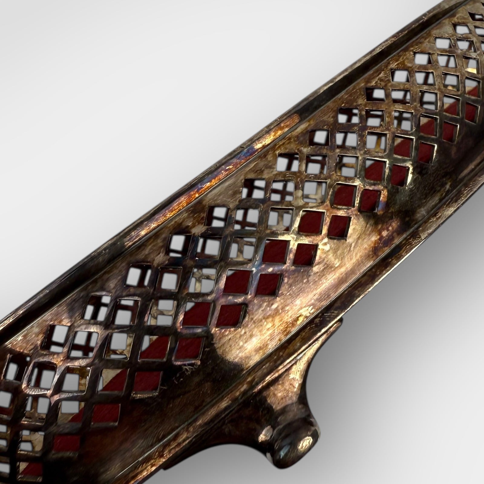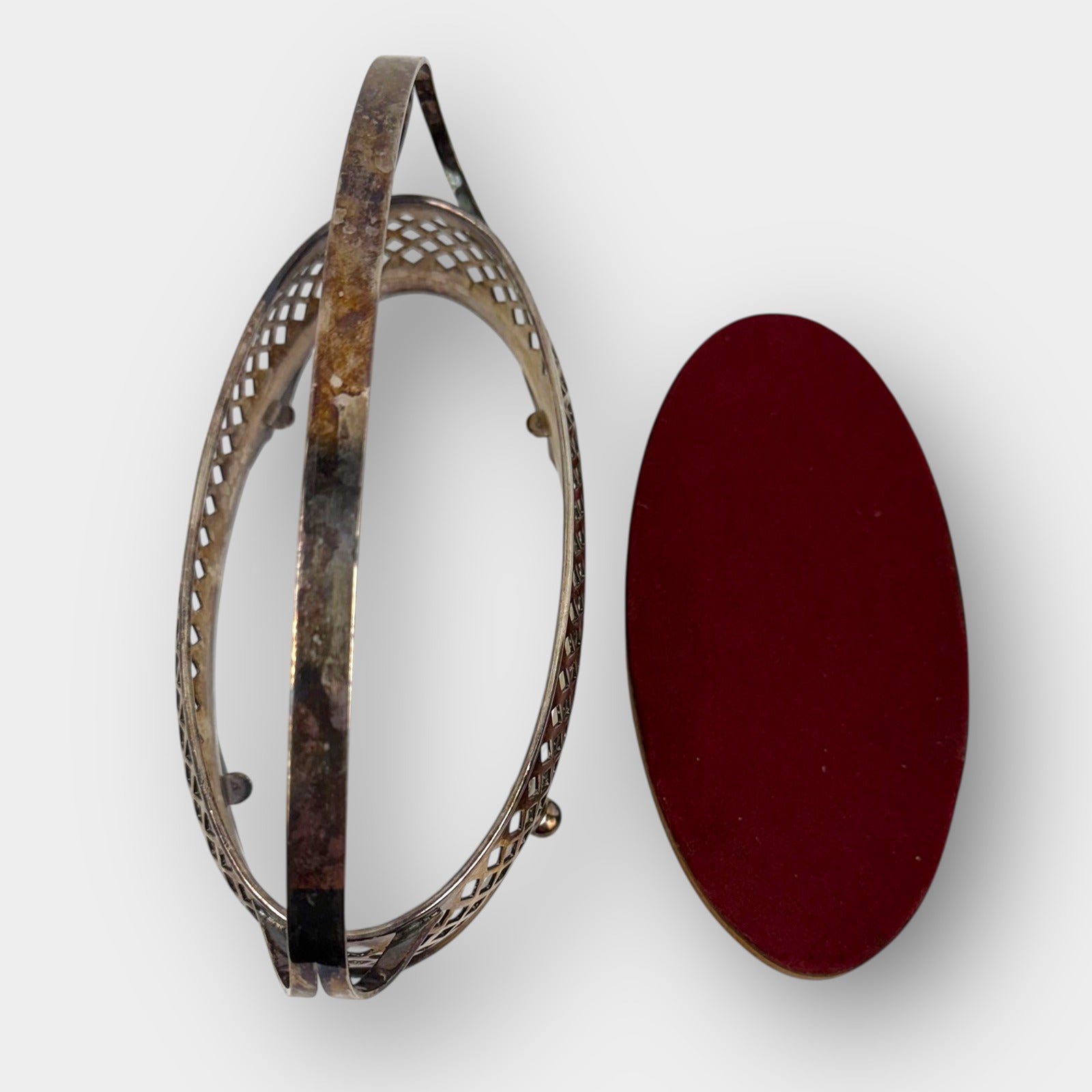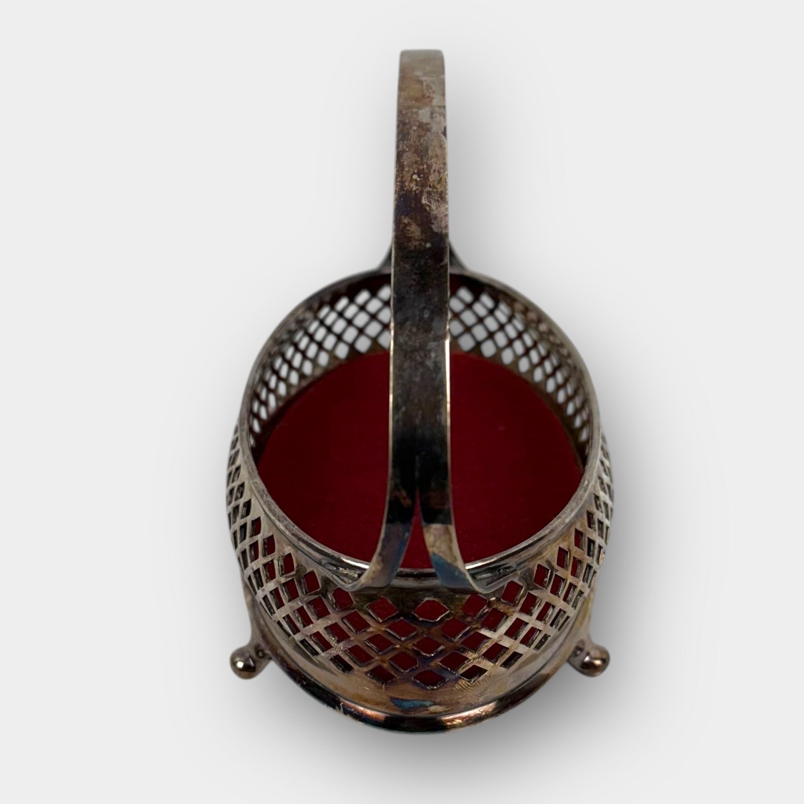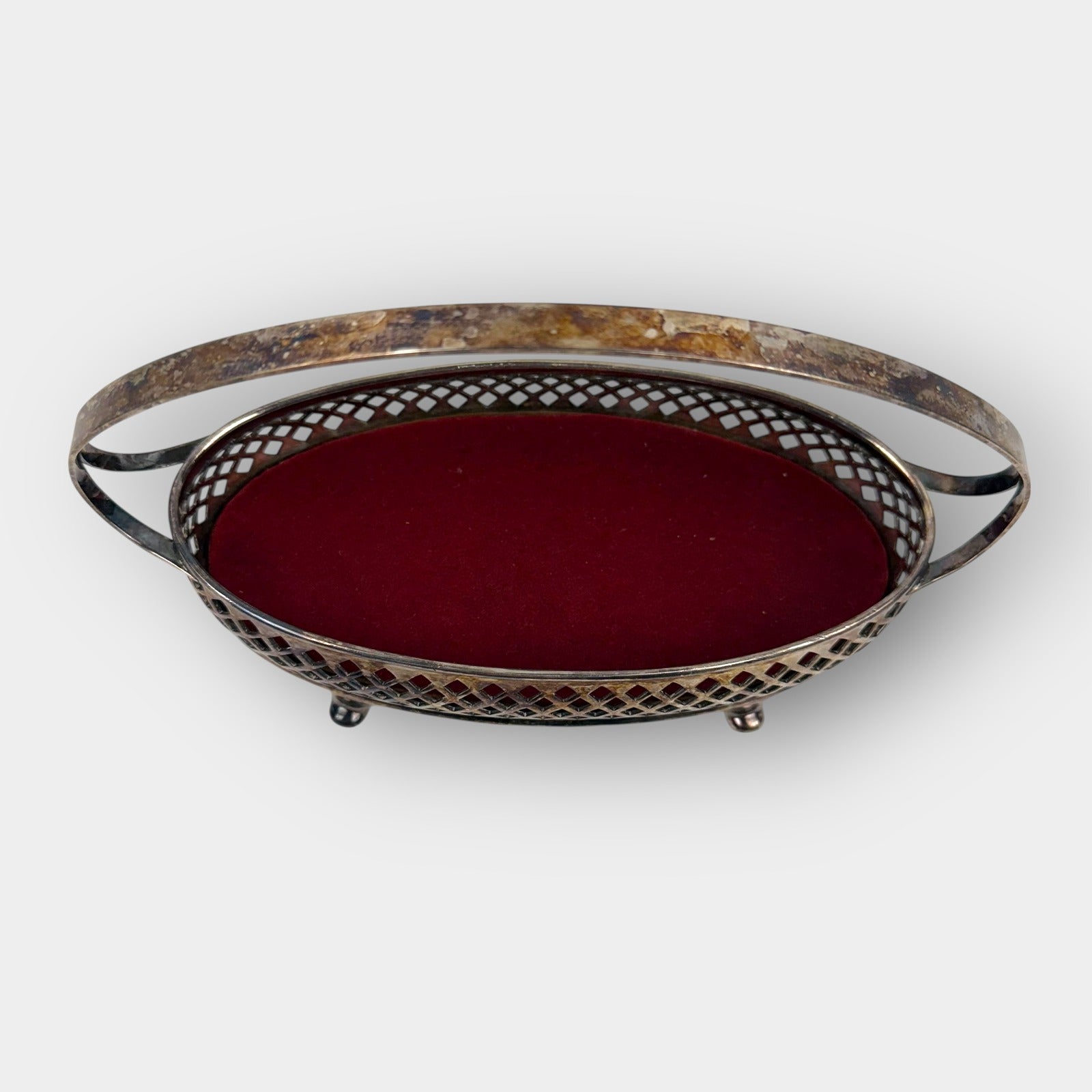 Vintage oval silverplate basket dish with pierced lattice sides, fixed handle, four ball feet, and a removable red felt insert over a wooden base. Displays tarnish and patina consistent with age, adding to its vintage charm