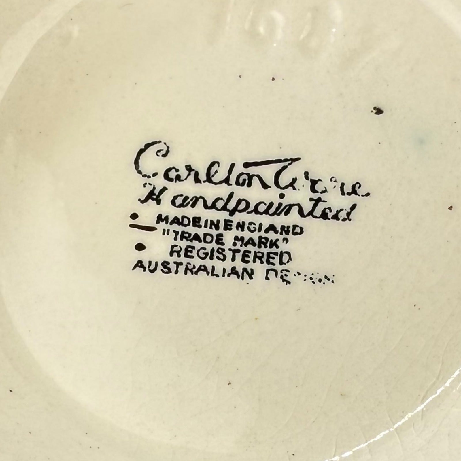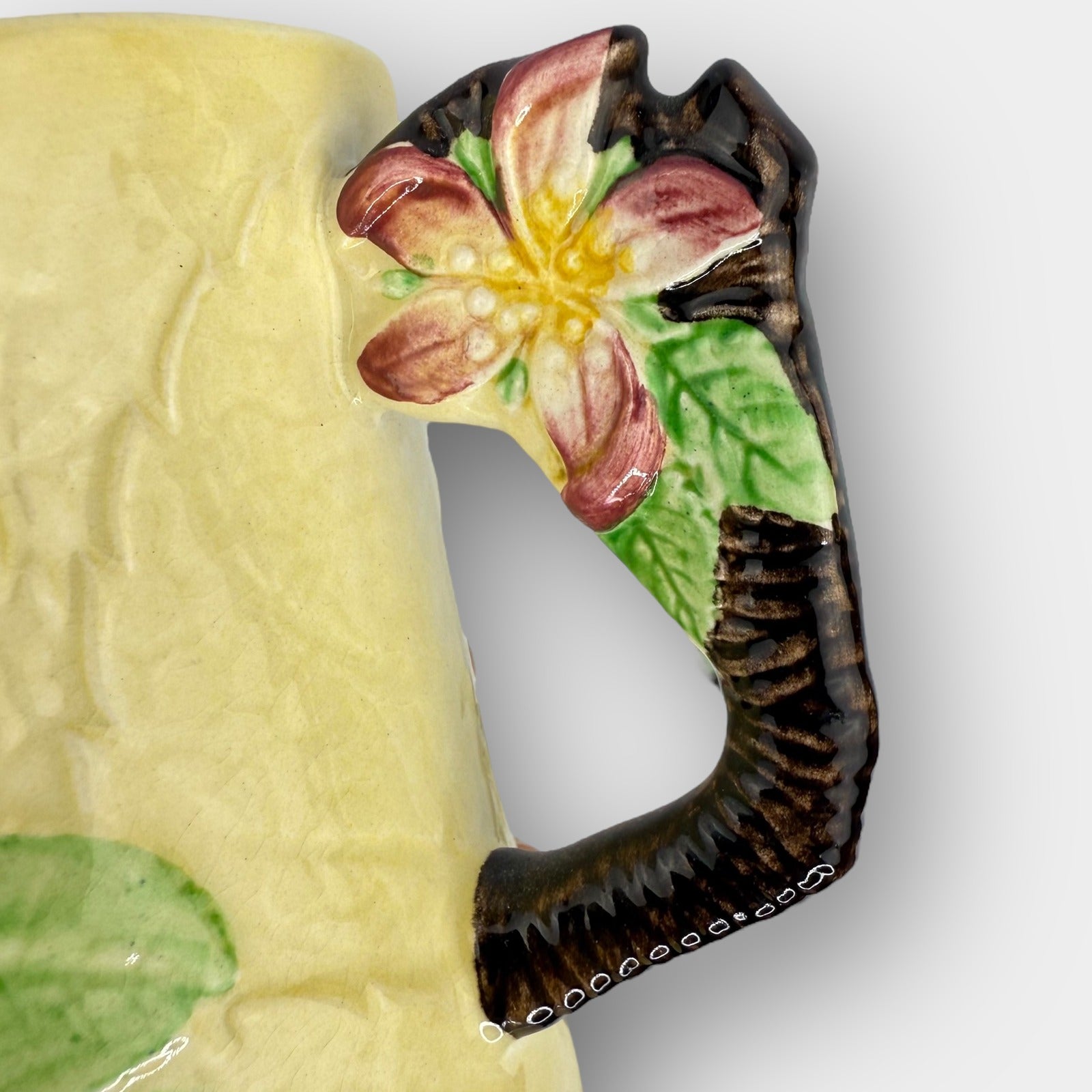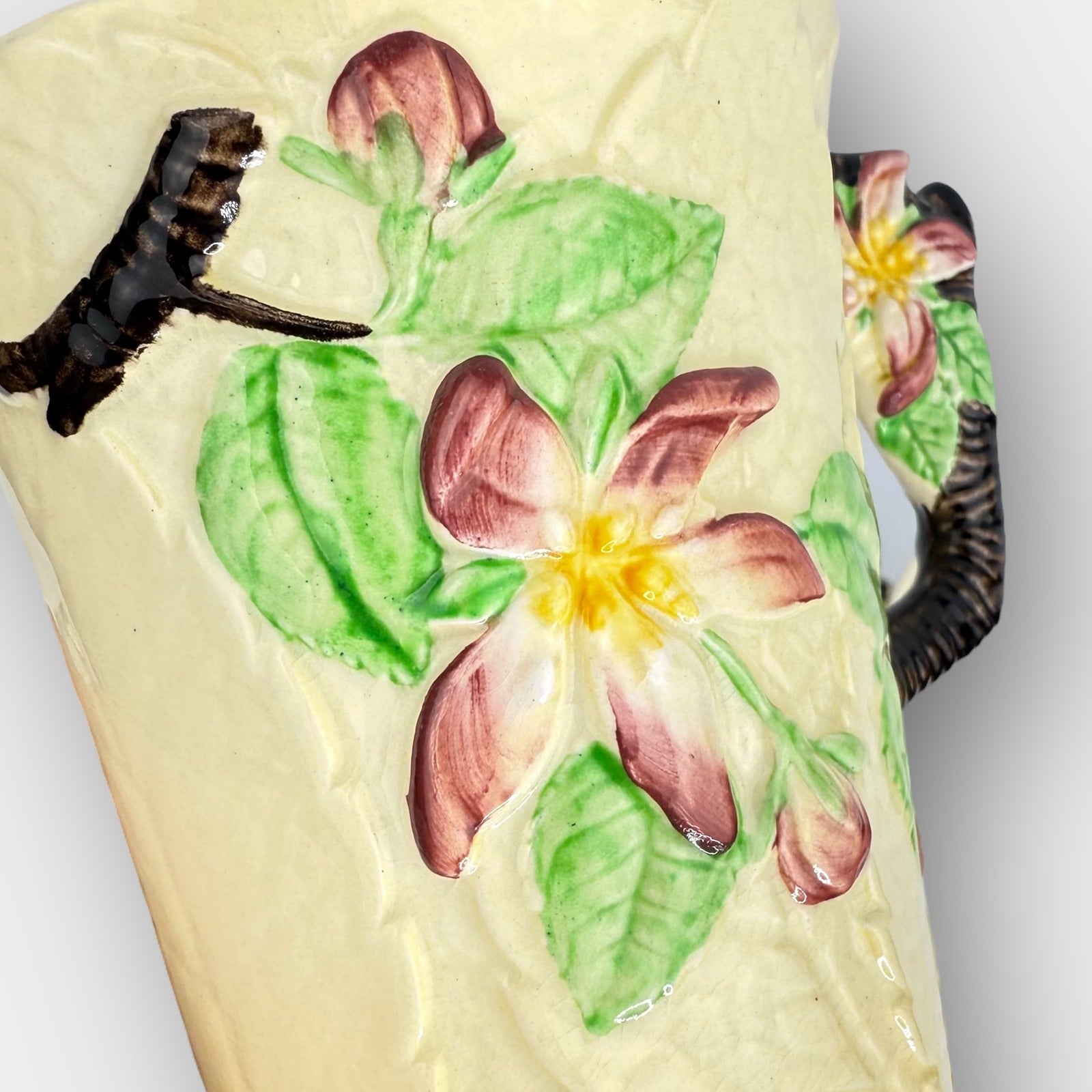 Pair of vintage Carlton Ware hand painted mugs with matching lids. Made in England under the "Registered Australian Design" line. Features raised leaf relief, large sculpted flowers on the lids, and branch-style handles with painted floral accents. Light age-related crazing typical of older Carlton Ware, but no chips or cracks noted. Note: colors may appear slightly different in photos due to screen variations