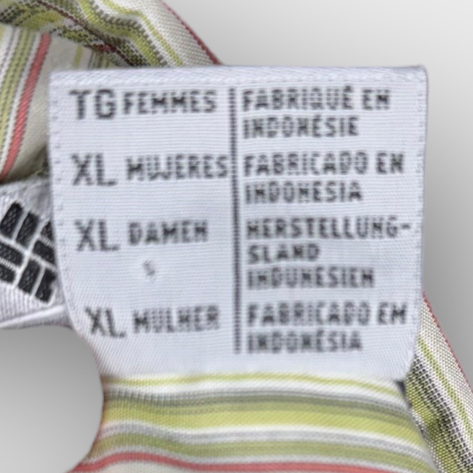 Columbia button-down shirt in a striped pattern with long sleeves, buttoned cuffs, and collared neckline. Features a curved hem for a clean finish. Note: there is a faint stain, reflected in price