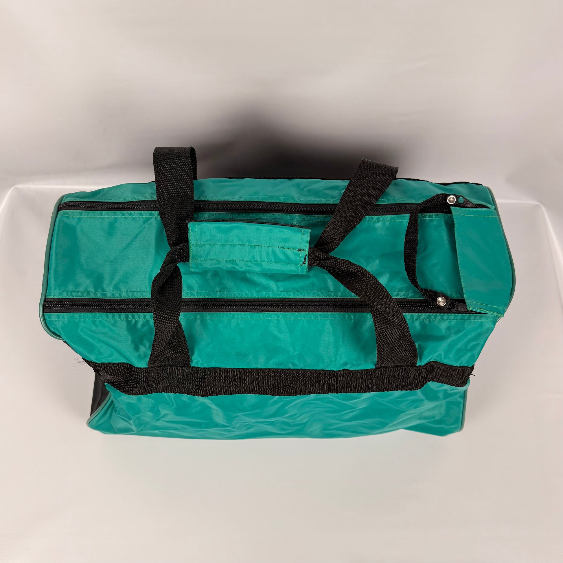 Lightweight teal/black duffel with removable shoulder strap and wrap-handle grips. Top zipper, side snaps to cinch the opening, large rear zip pocket, and ID tag. Approx. 18 x 10.5 x 11.5 in. Clean overall; some marks on the bottom and damage on the handle wrap (shown)