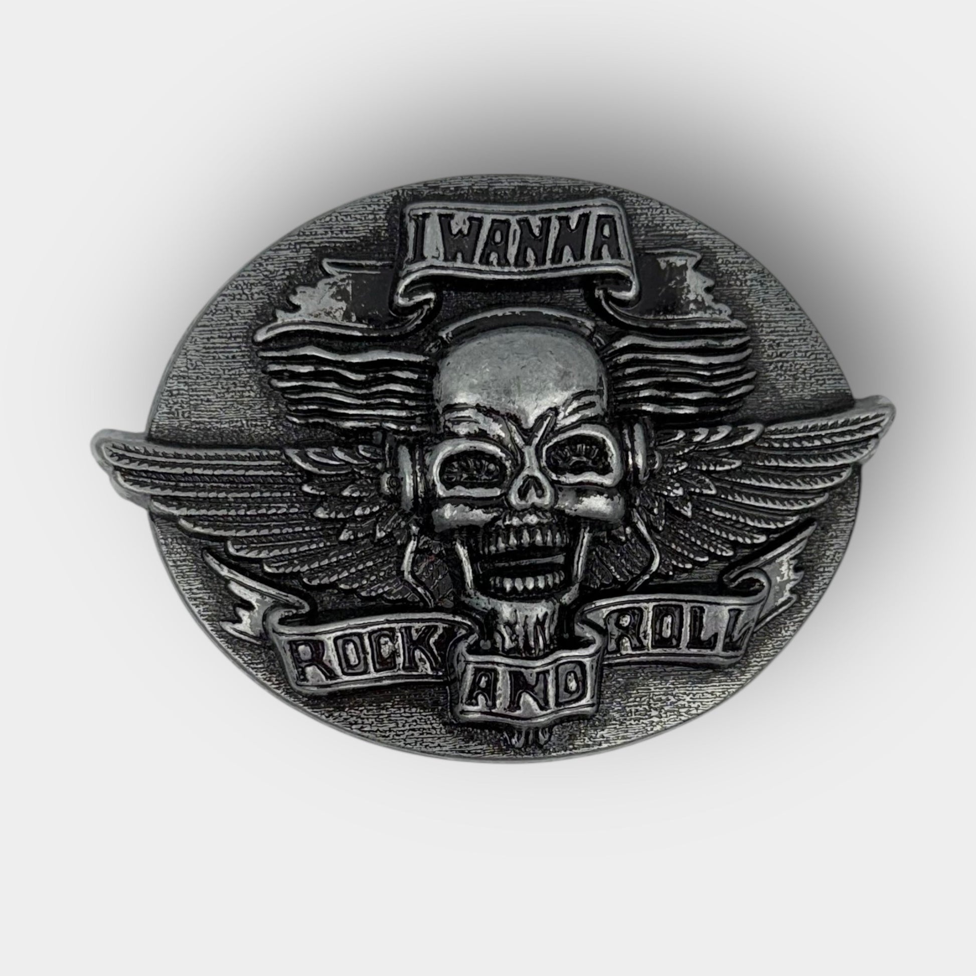 Heavy metal oval belt buckle featuring a raised skull with spread wings and banner reading “I Wanna Rock and Roll.” Finished in antique silver tone with textured detailing