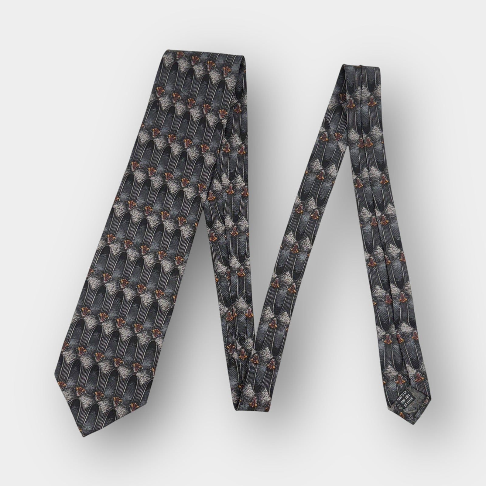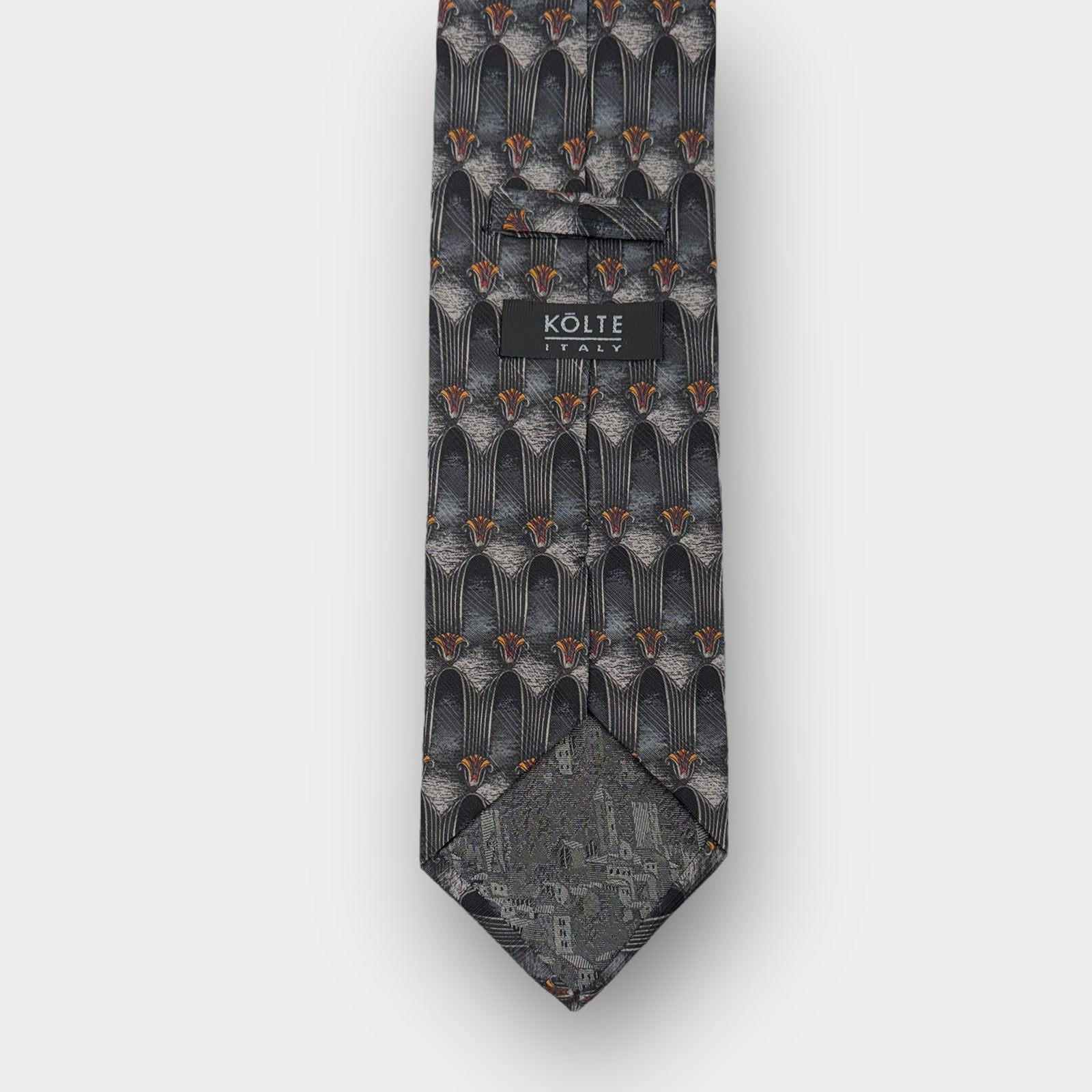 Kolte Italy men’s handmade silk tie featuring an abstract geometric pattern in shades of gray with subtle orange accents. Crafted in Italy from 100% silk with a standard 3.75-inch width and 60-inch length