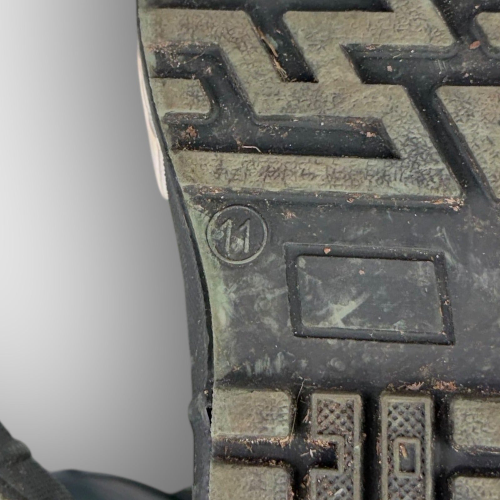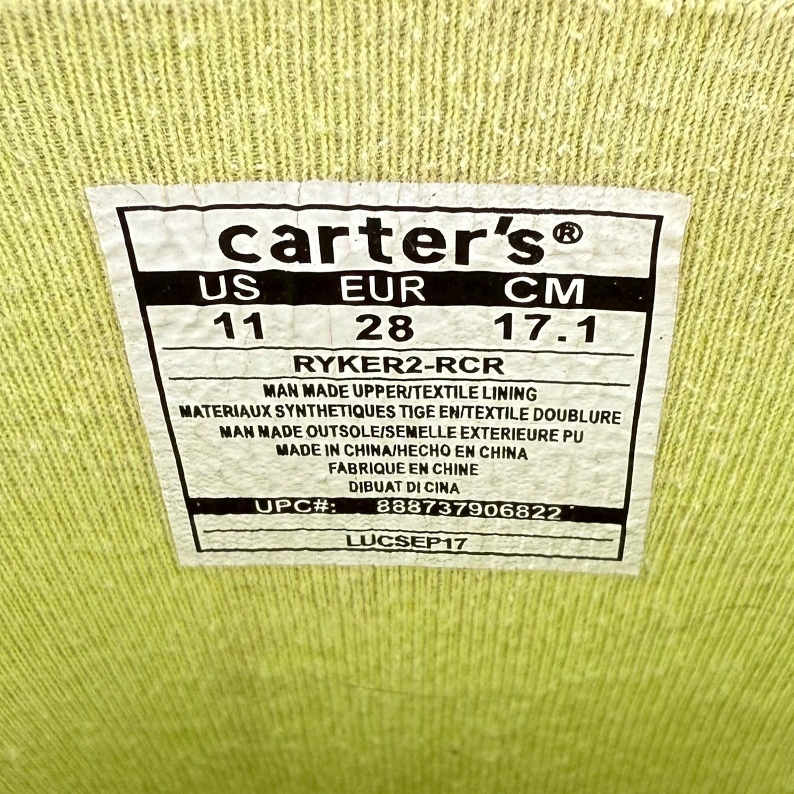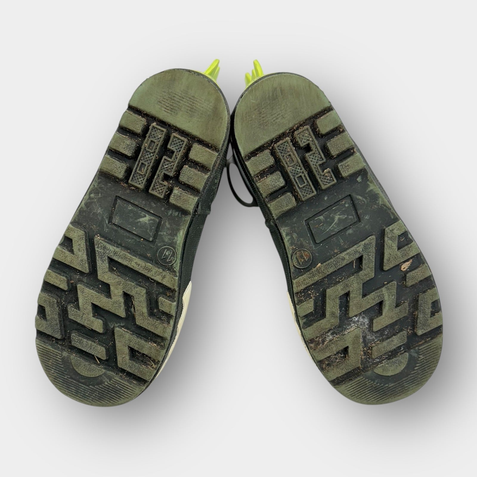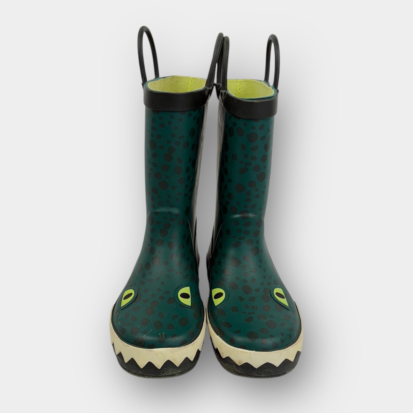 Carter’s kids rain boots in green with black spotted pattern and fun dinosaur design featuring eyes at the toe, jagged white teeth trim, and bright green spines on the back. Dual pull handles for easy wear, black outsoles with good tread