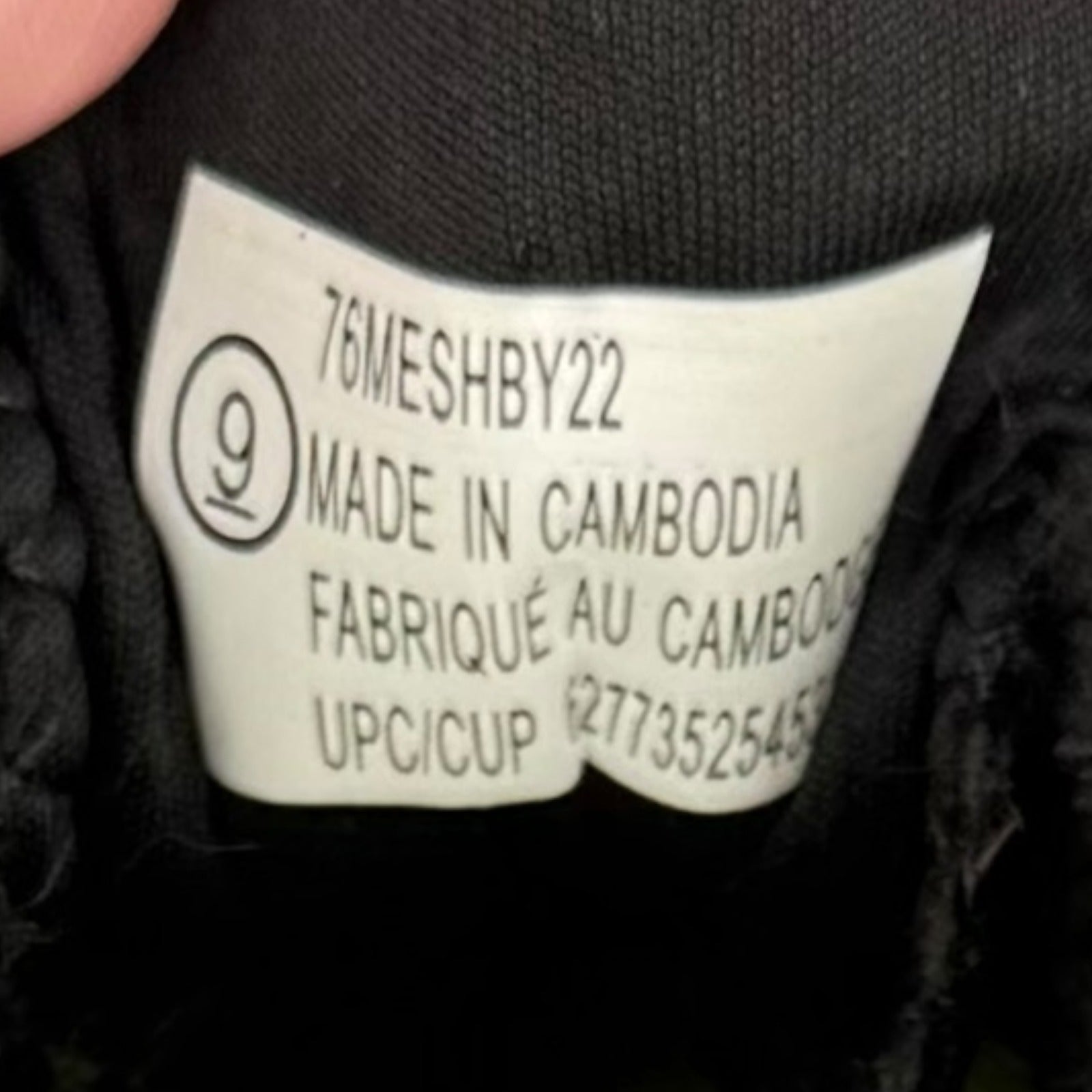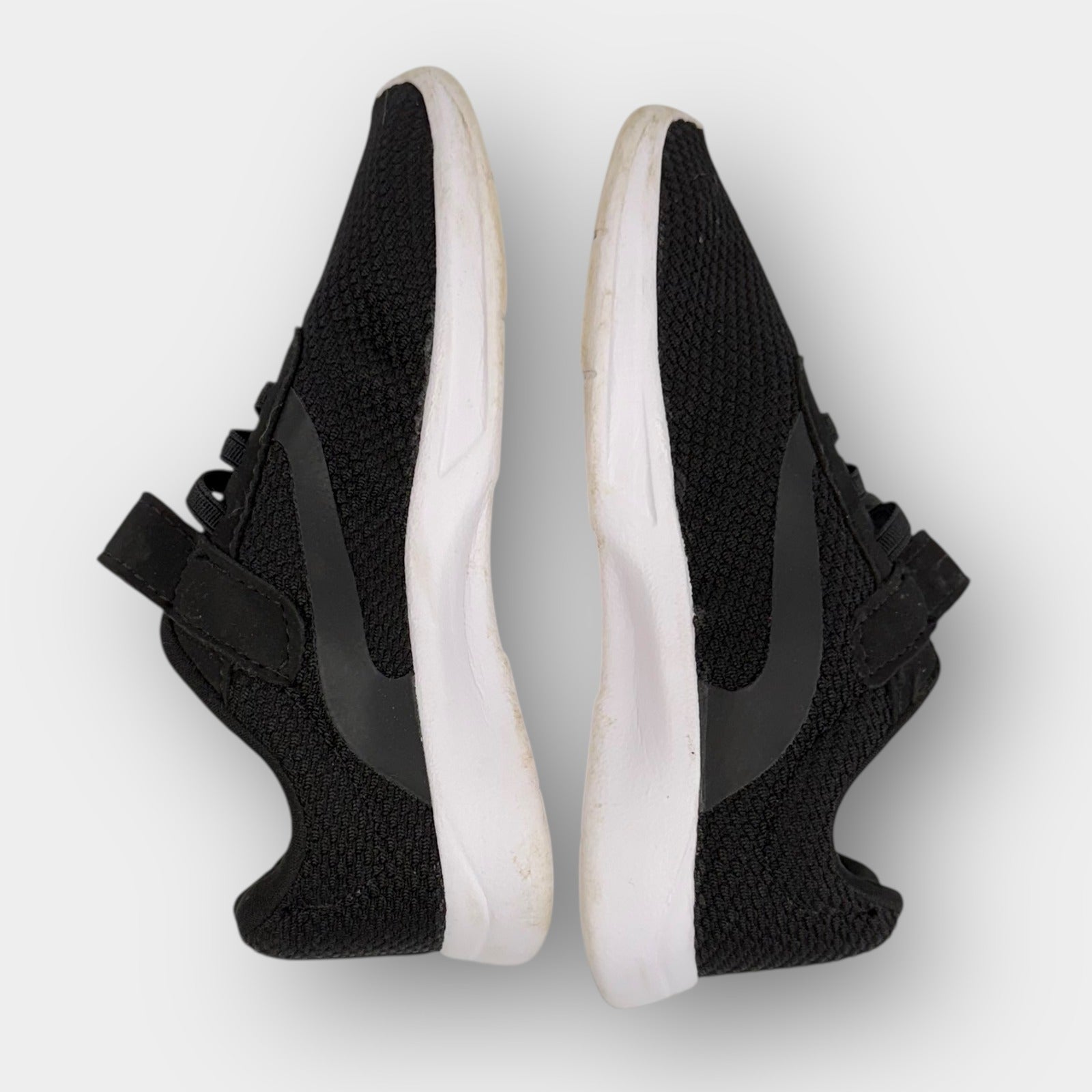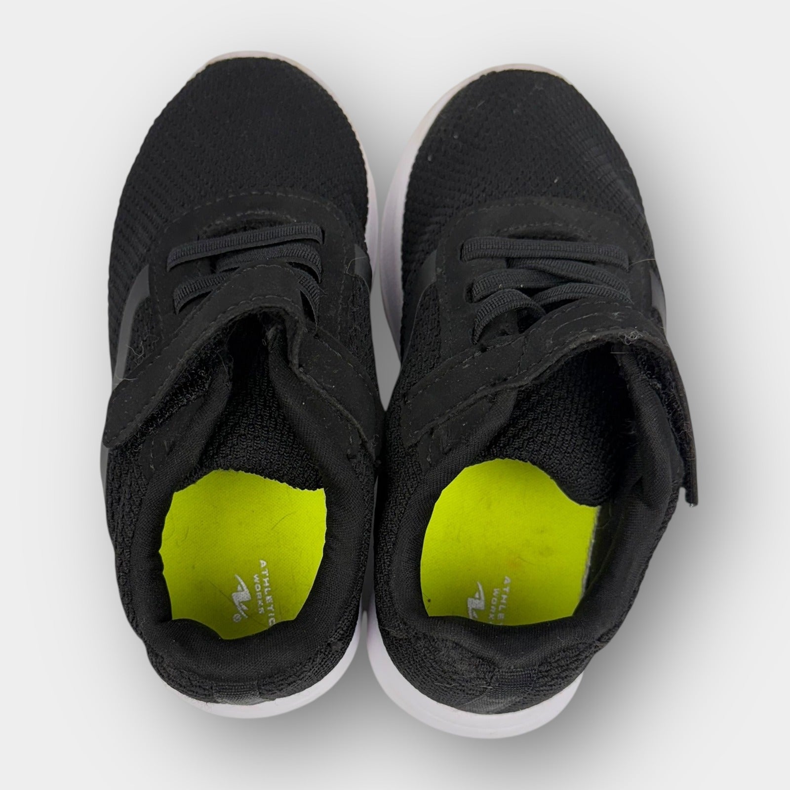 Athletic Works kids sneakers in black mesh fabric with hook-and-loop strap and faux lace detail. Lightweight with white rubber outsoles and neon green insoles