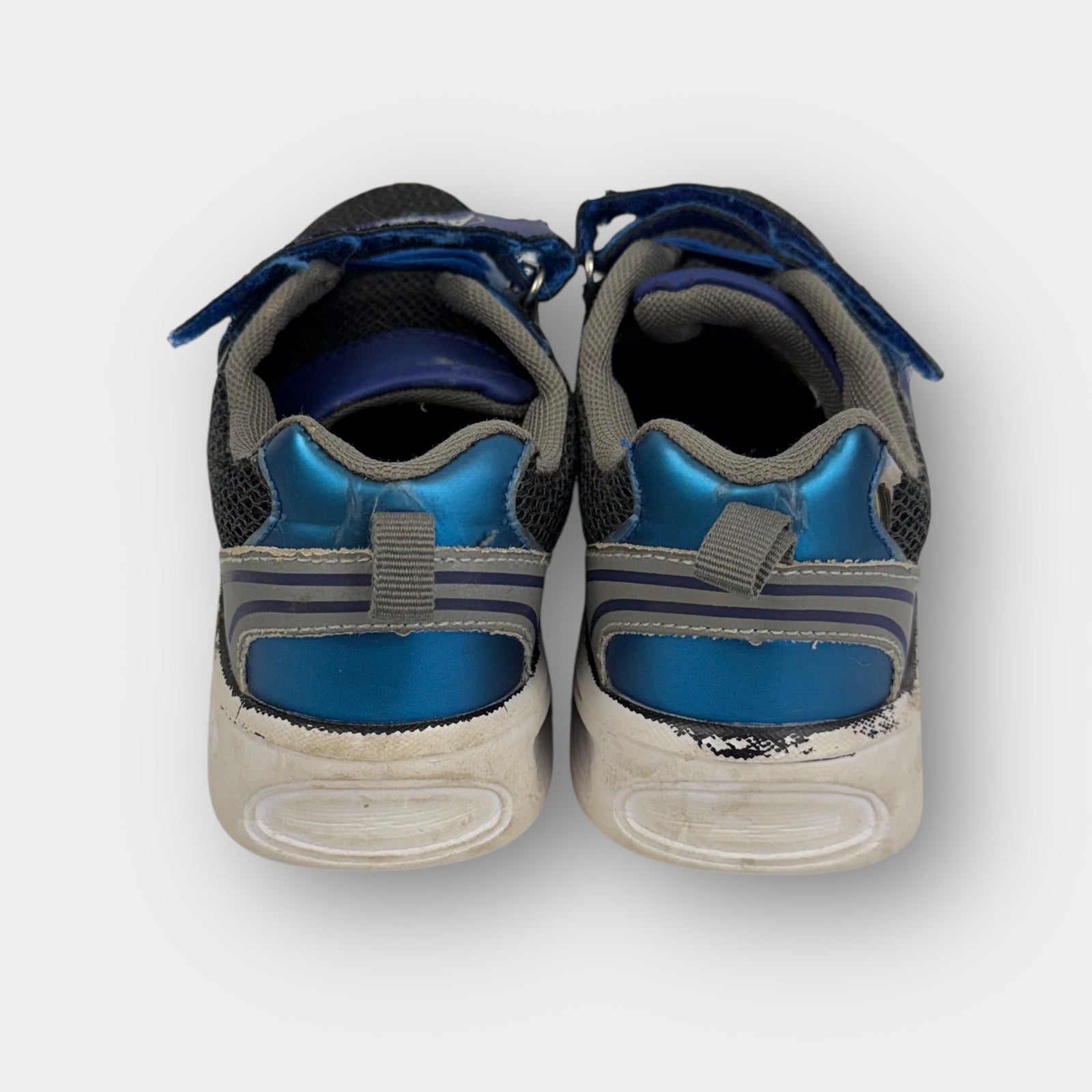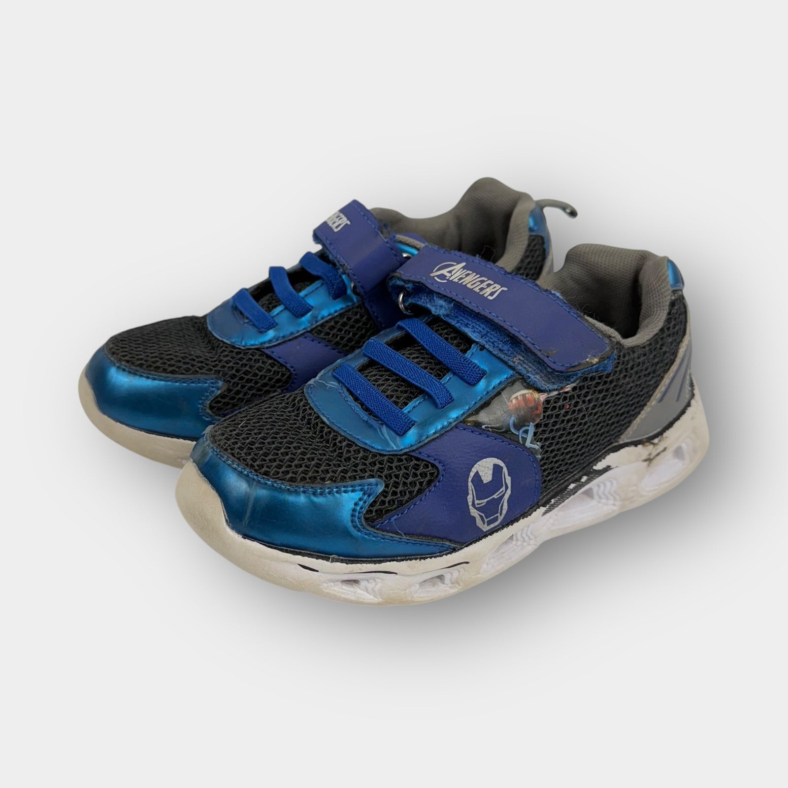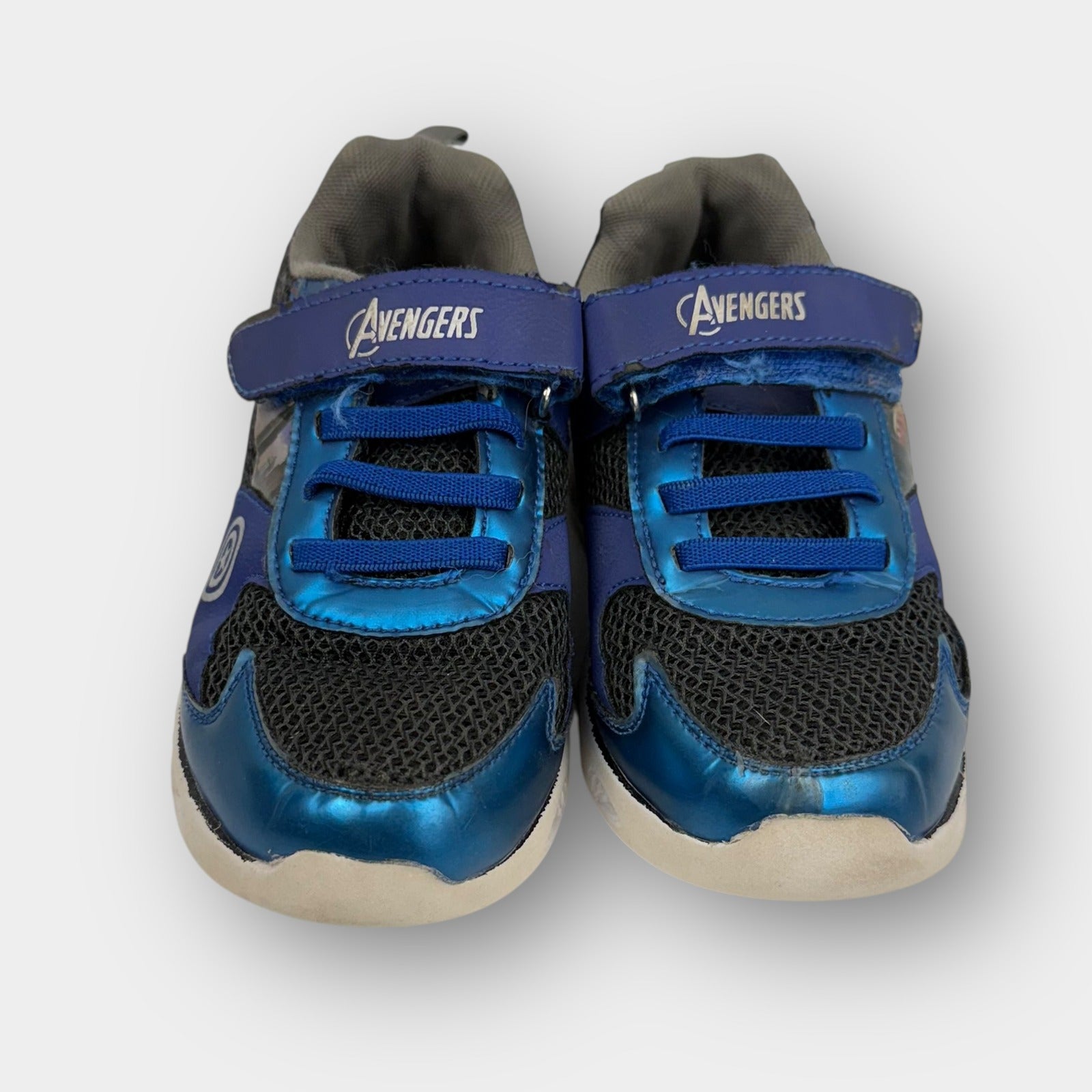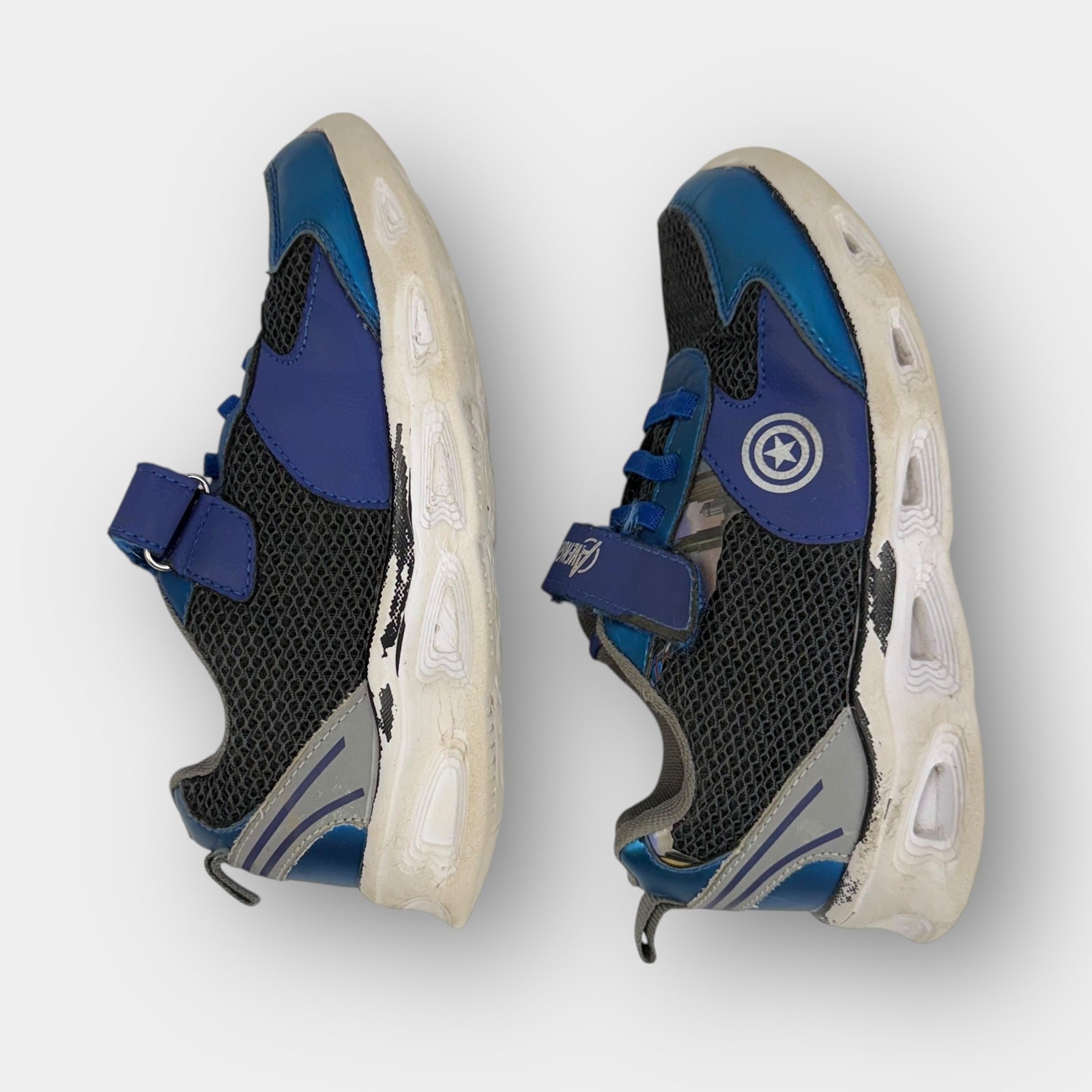 Kids’ Marvel Avengers shoes featuring blue metallic overlays, black mesh uppers, and character graphics including Iron Man and Captain America shield. Hook-and-loop strap closure with elastic lace detail and cushioned sole